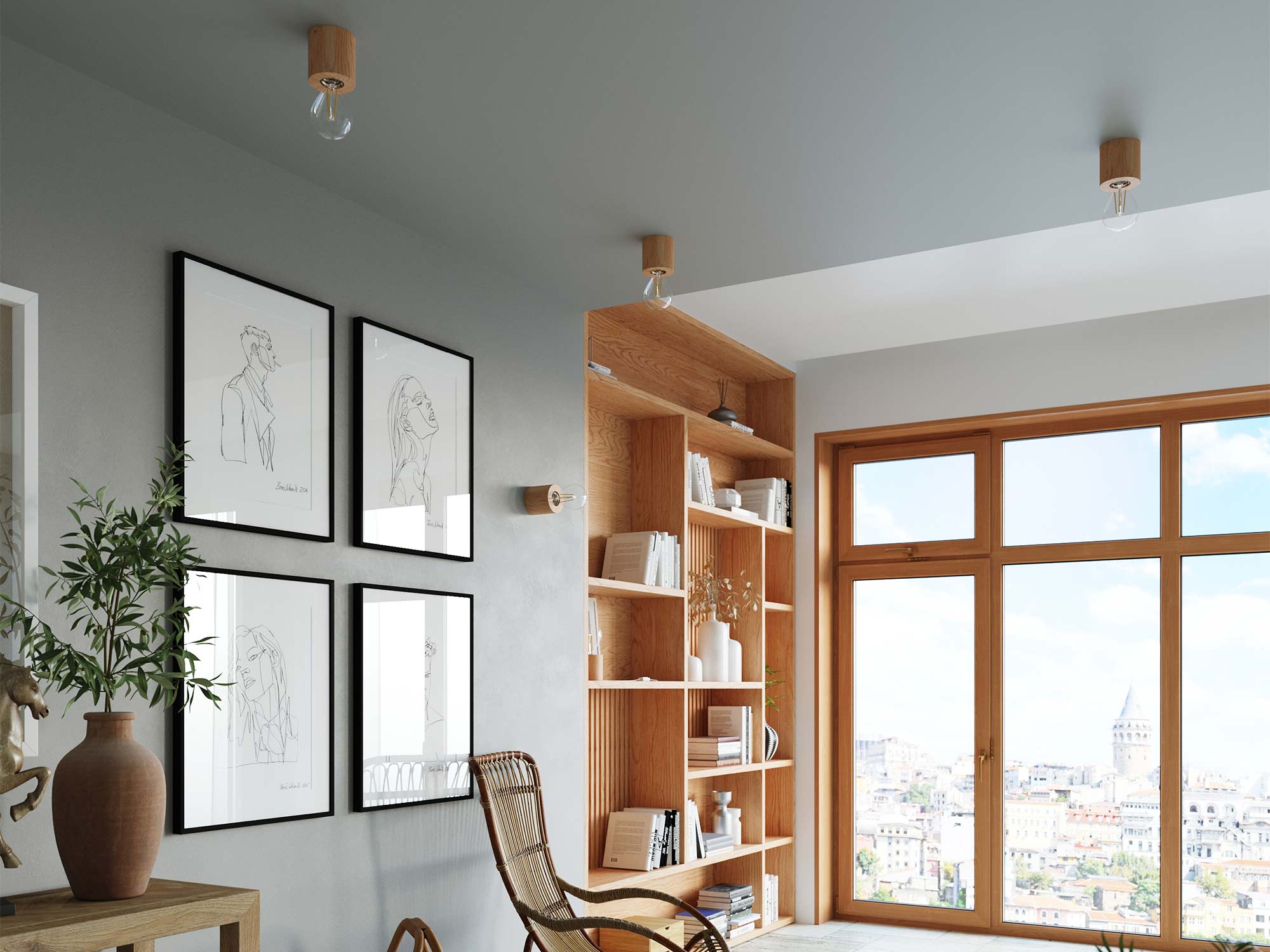 Każdy egzemplarz jest unikatowy – usłojenie drewna, jego naturalne odcienie i drobne różnice w fakturze sprawiają, że Twój plafon nabiera indywidualnego charakteru. W połączeniu z miękkim światłem żarówki tworzy on atmosferę sprzyjającą odpoczynkowi i relaksowi.