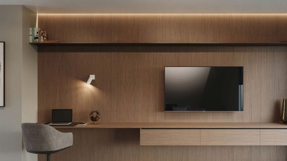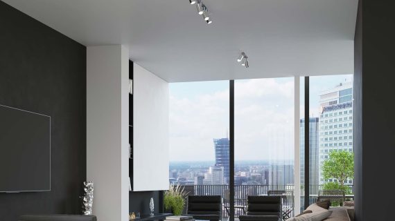 - Porządek wizualny – smukła, biała linia na suficie zamiast rozproszonego oświetlenia.