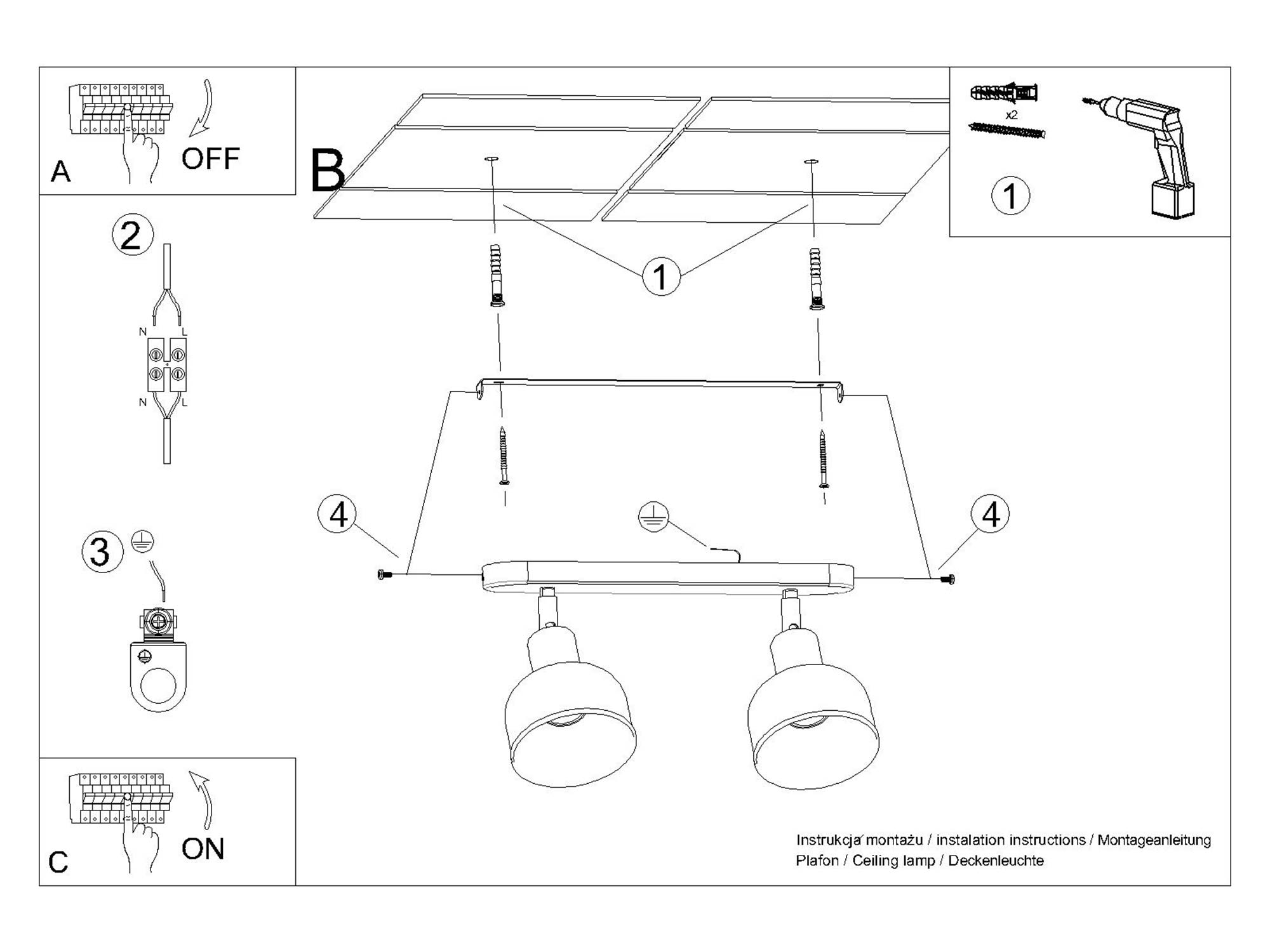 Źródło światła: E27, 2x max 15W LED, ~230V, 50Hz, IP20, klasa ochronności I