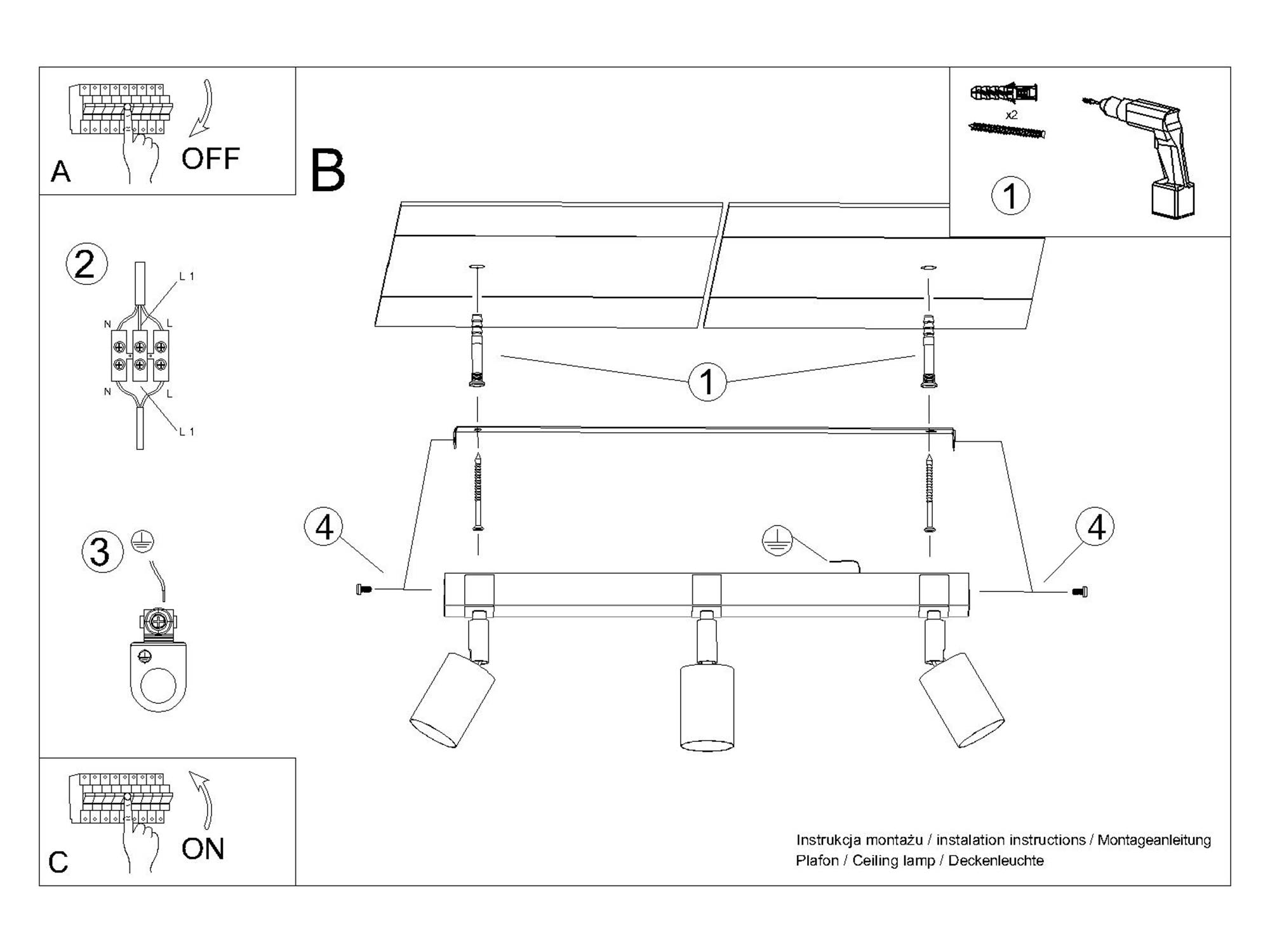 Dzięki zastosowaniu energooszczędnych żarówek LED GU10 (do dokupienia osobno) plafon pozwala cieszyć się jasnym, równomiernym światłem przy minimalnym zużyciu energii. Trzy źródła światła zapewniają możliwość pełnego doświetlenia przestrzeni, co czyni ten model idealnym wyborem do pomieszczeń, gdzie liczy się funkcjonalność i design.