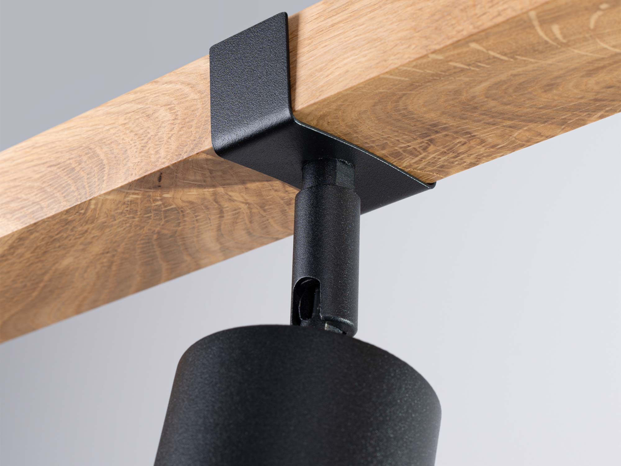 Minimalizm nie musi oznaczać nudy. Plafon FALKO 3 to przykład tego, jak prostota formy może iść w parze z efektownym wyglądem. Konstrukcja lampy opiera się na prostokątnej podsufitce z drewna, do której przymocowane są trzy stalowe klosze w eleganckim, czarnym kolorze. Takie zestawienie materiałów dodaje wnętrzu charakteru – ciepłe drewno ociepla surowość metalu, a całość nabiera wyjątkowej harmonii.