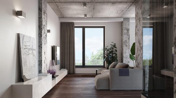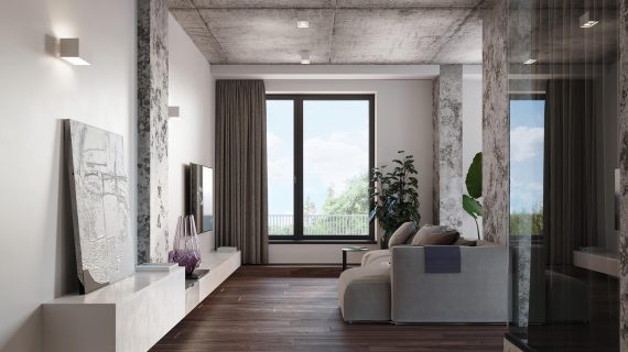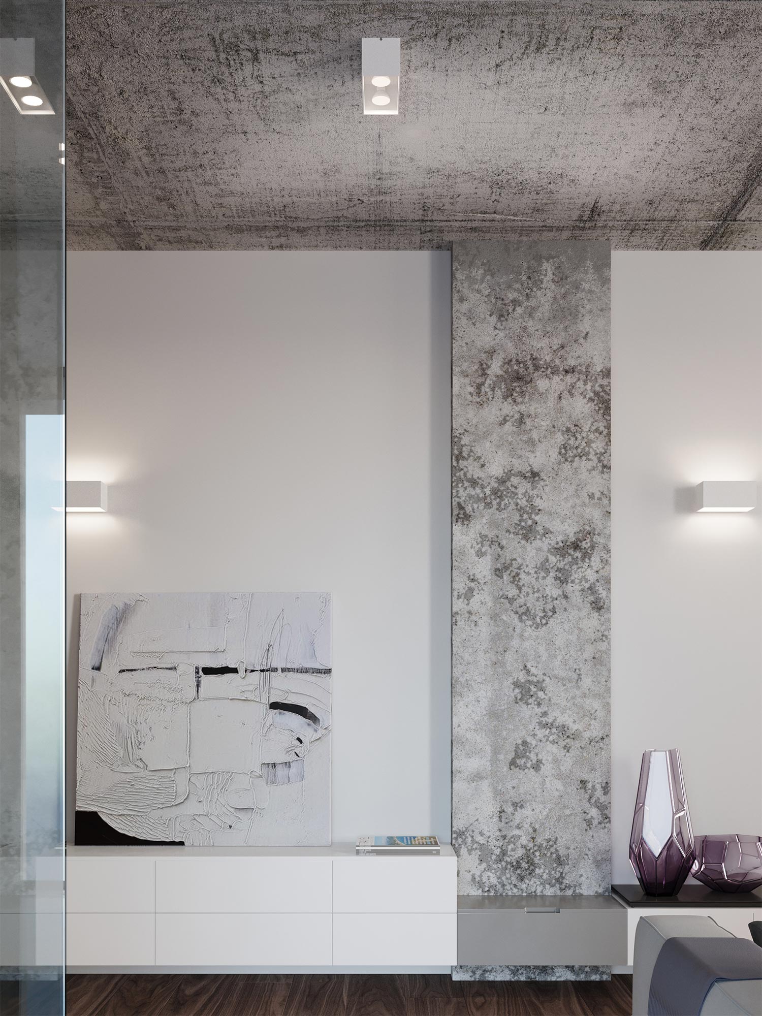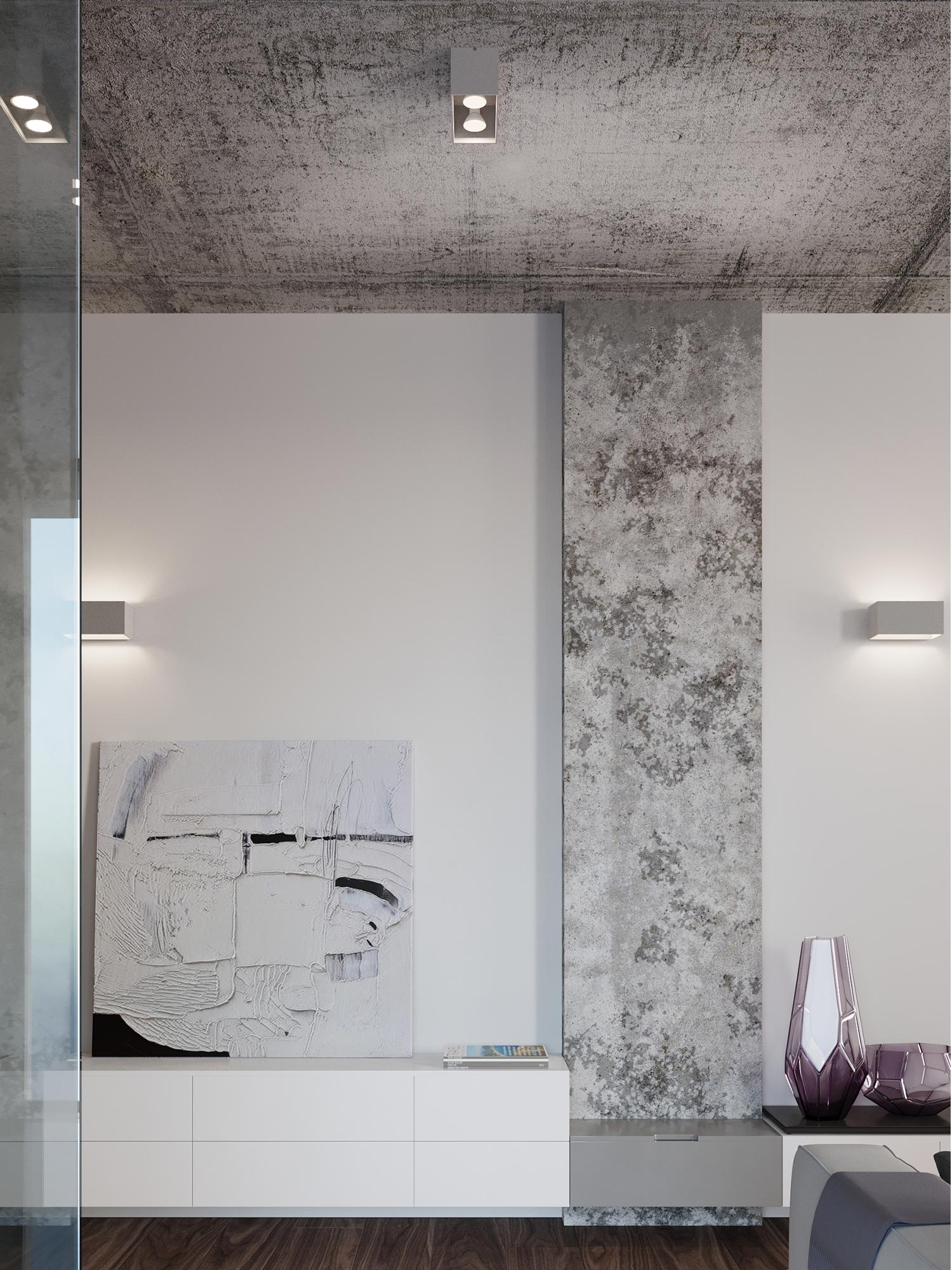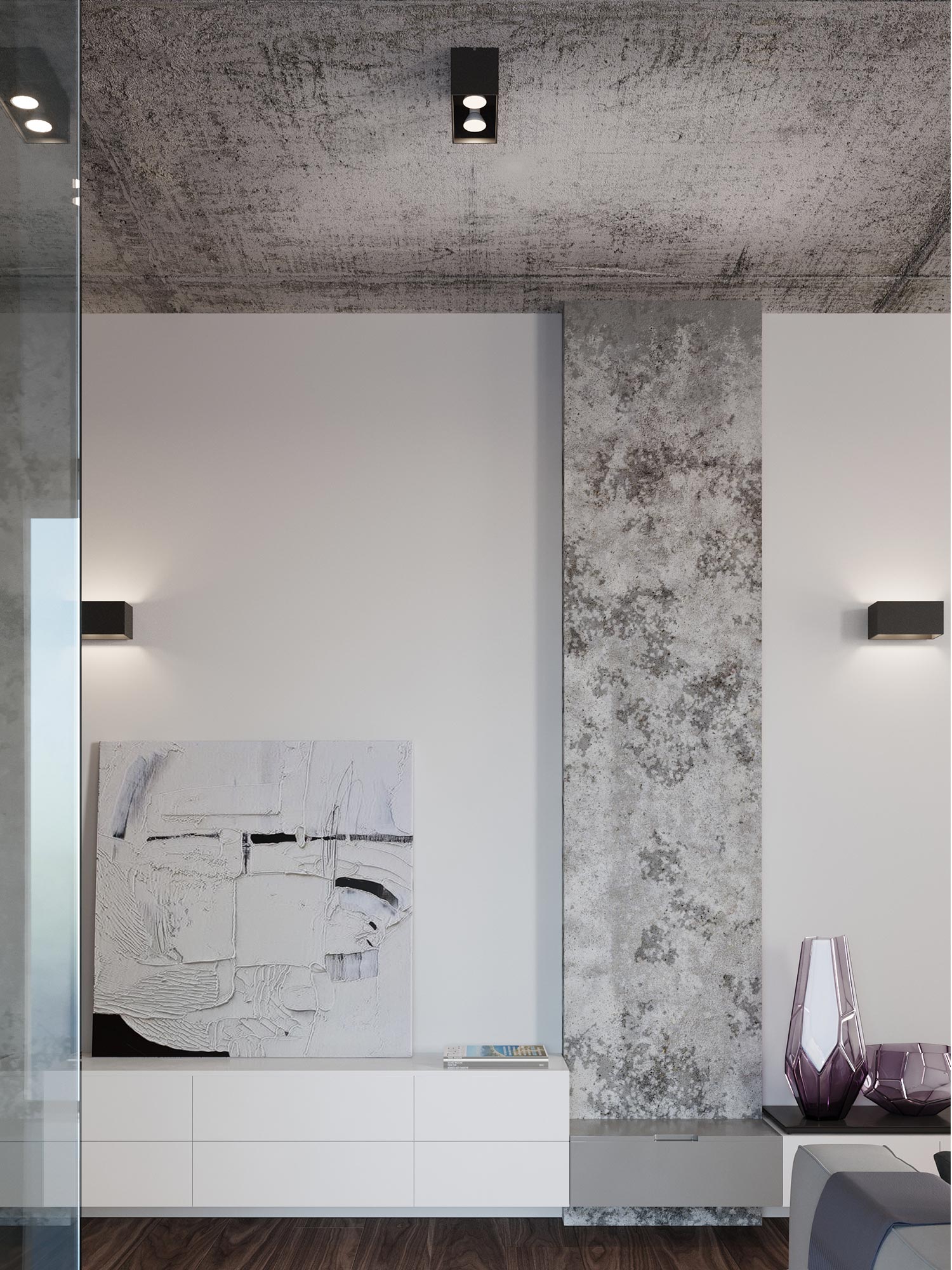 Nowoczesny salon z kinkietem i plafonem – industrialna ściana z betonu