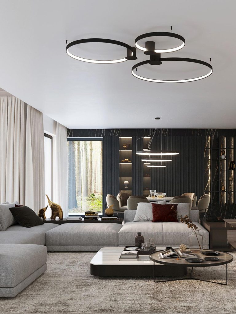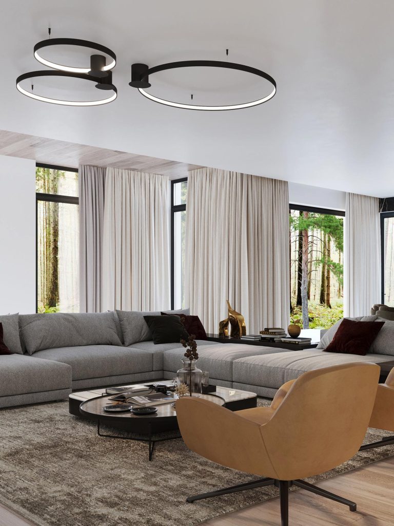- Design jak z galerii sztuki – rzeźbiarska forma, która ubiera sufit i porządkuje przestrzeń.