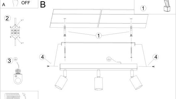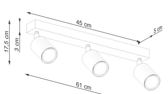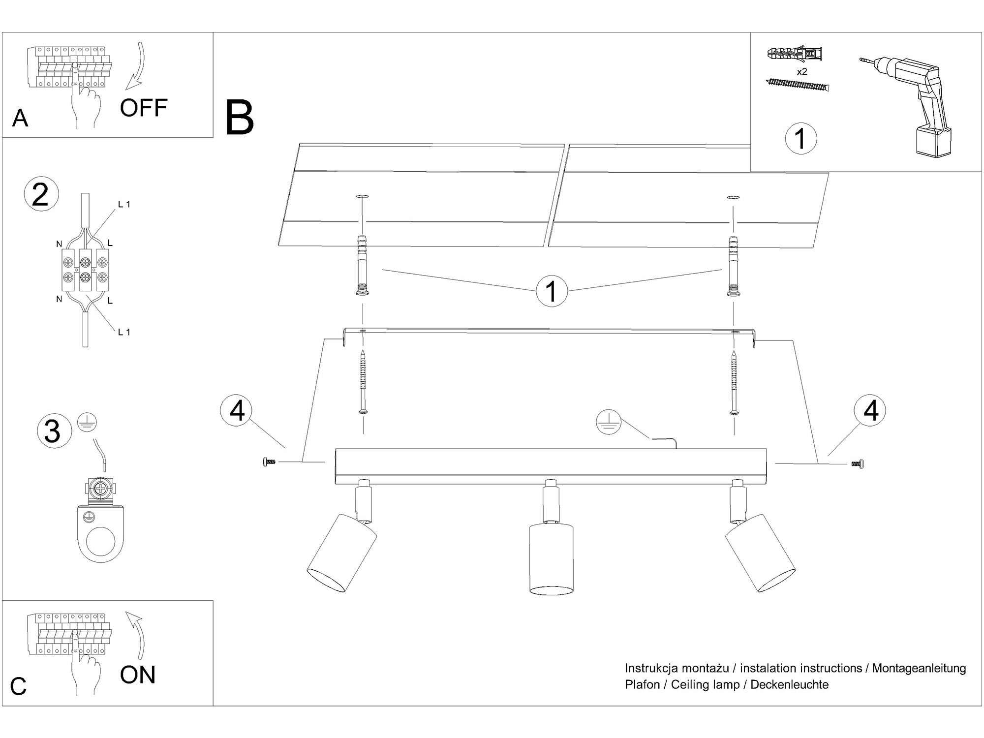 - Źródło światła: Wyposażony w trzy gniazda typu GU10, przeznaczone dla żarówek LED o maksymalnej mocy 10W każda, ~230V, 50Hz, IP20, klasa ochronności I.