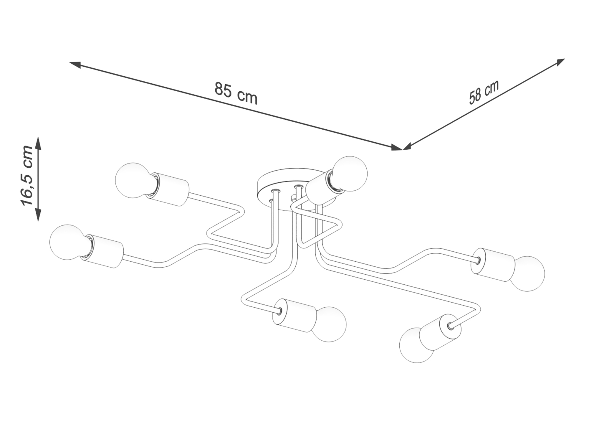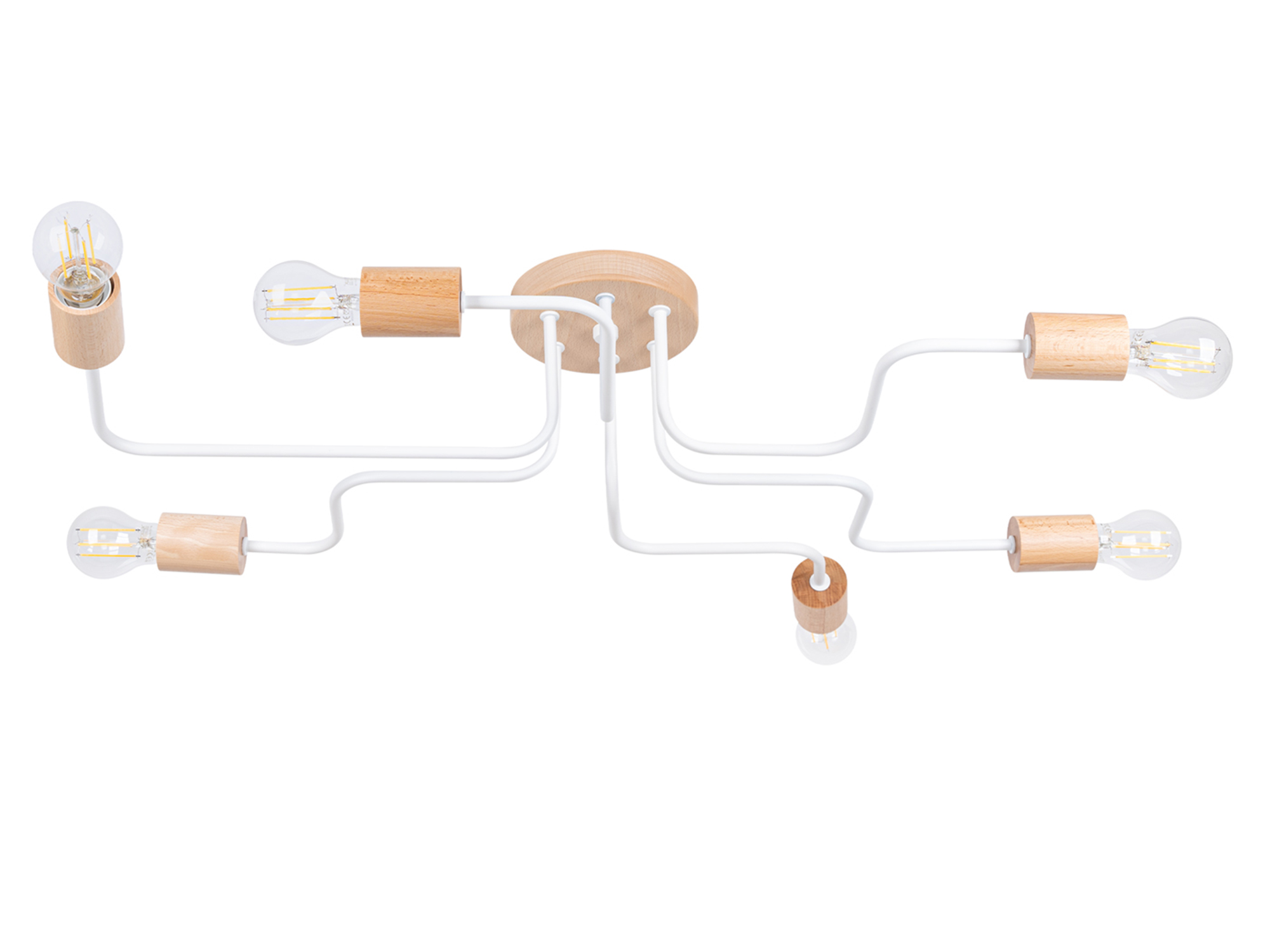 Sześć gniazd E27 daje pełną dowolność w wyborze żarówek LED. Brak źródeł światła w zestawie pozwala dopasować barwę i intensywność światła do własnych potrzeb – od ciepłego, sprzyjającego relaksowi, po neutralne, idealne do pracy i codziennych aktywności.