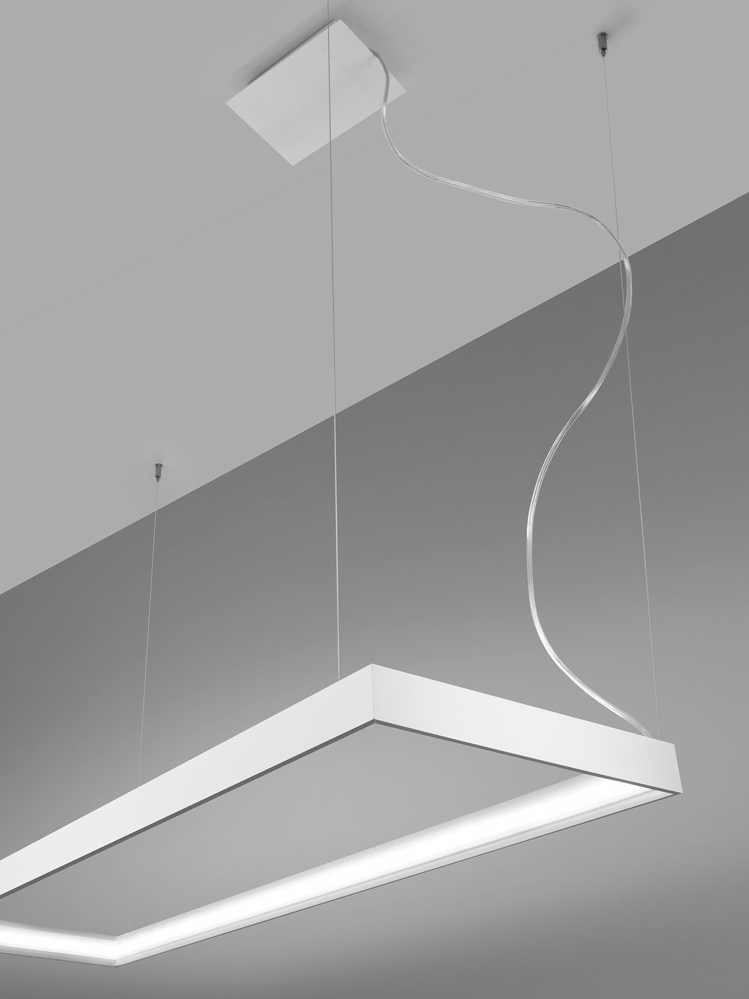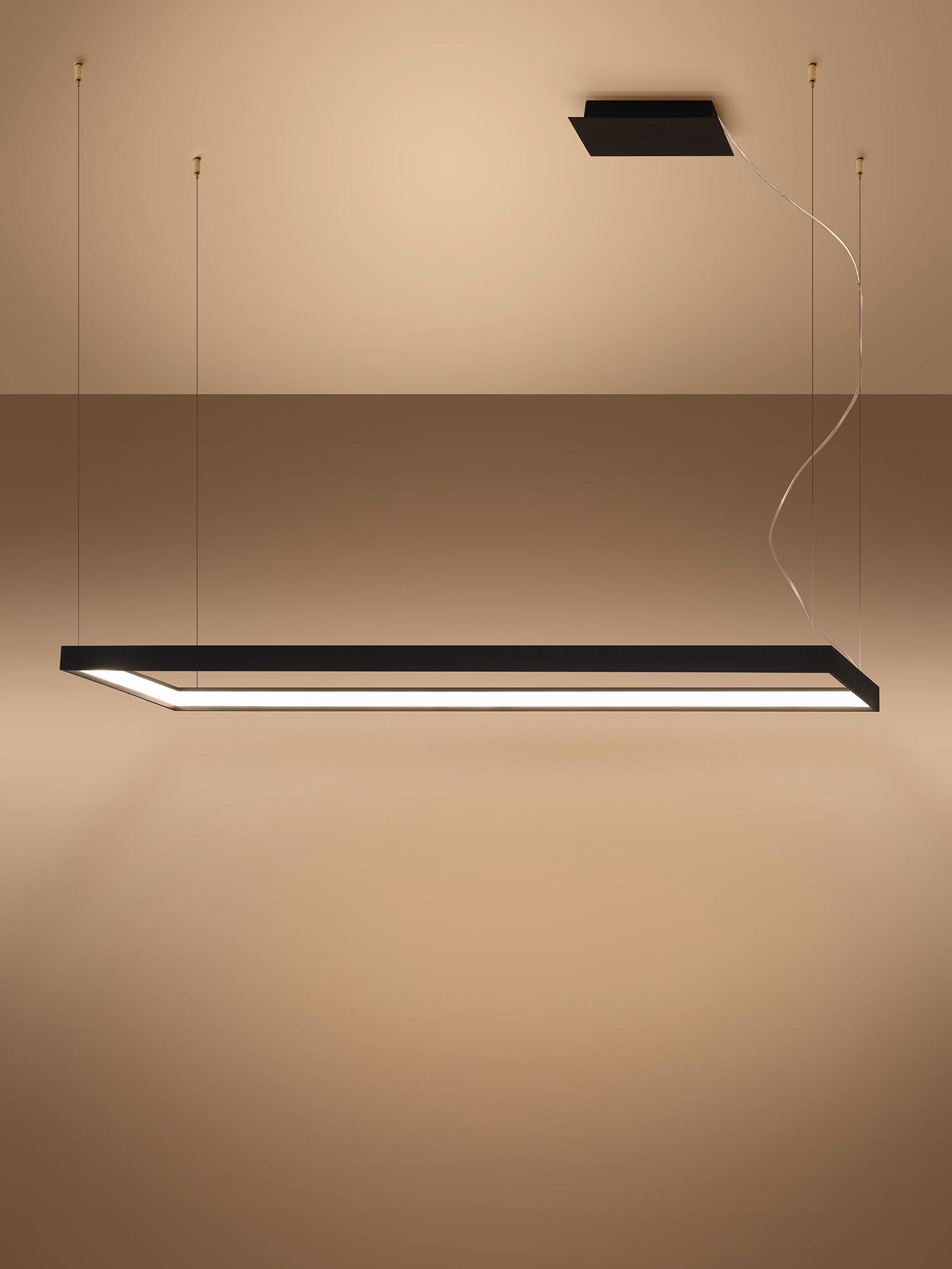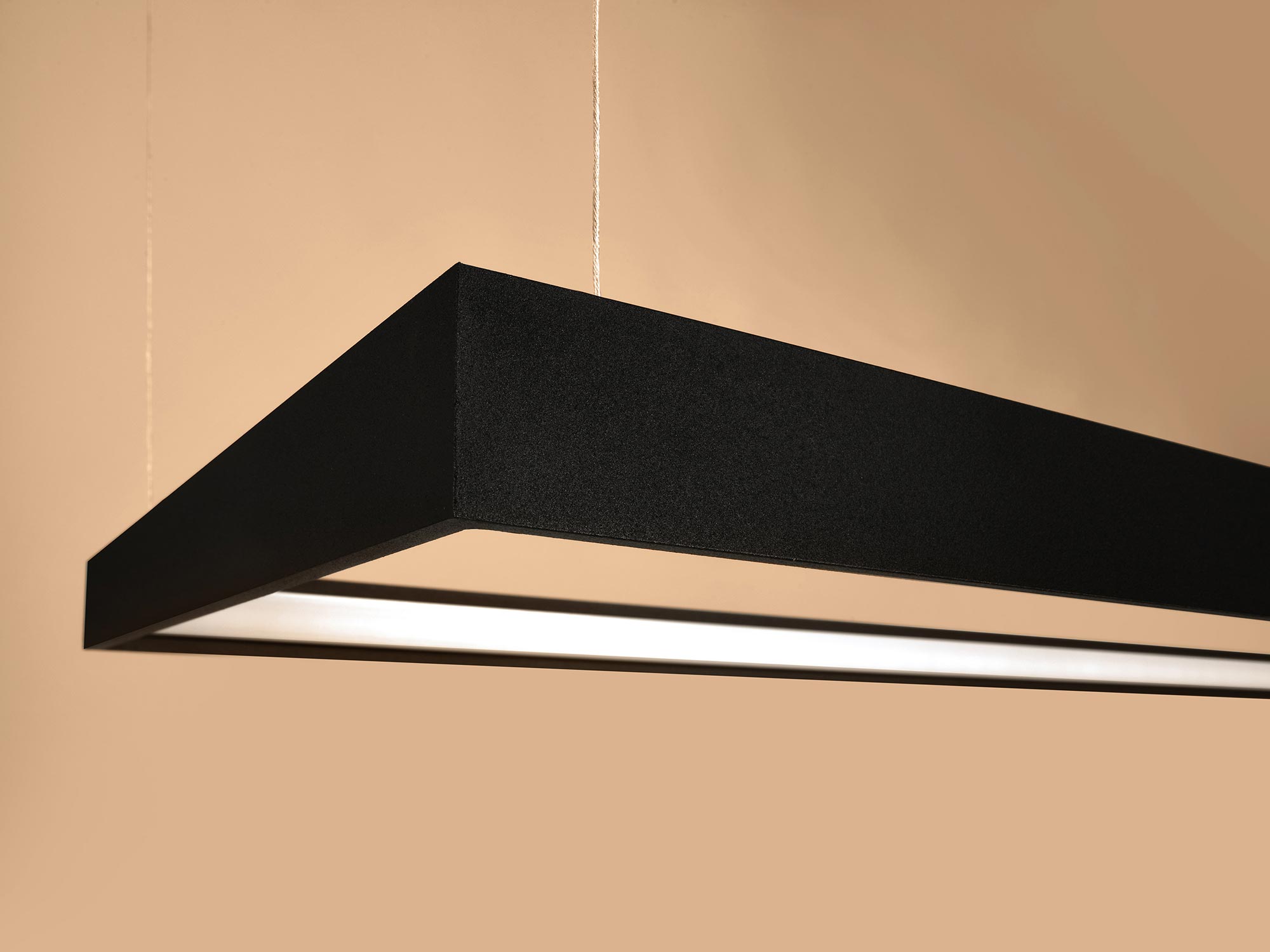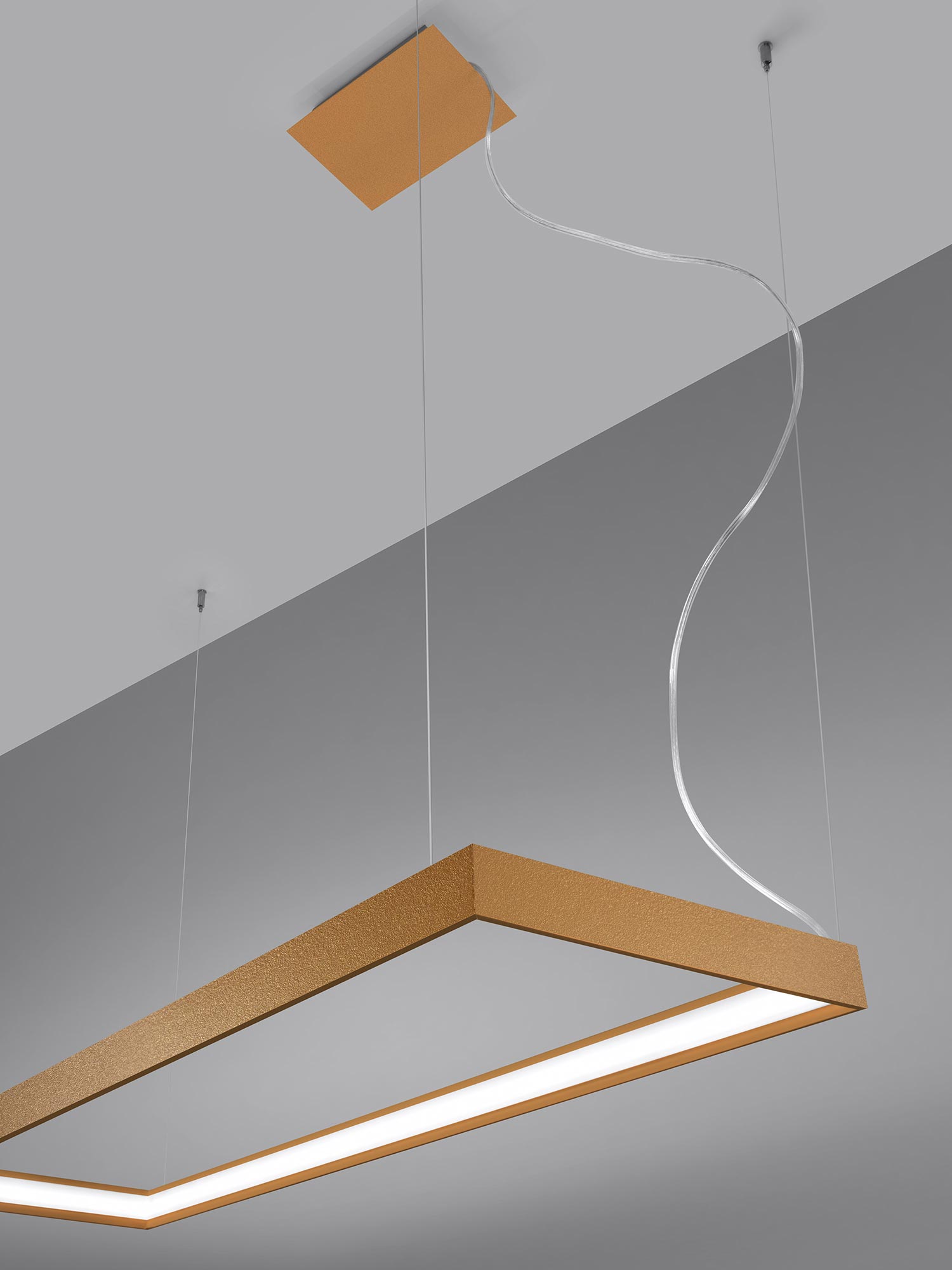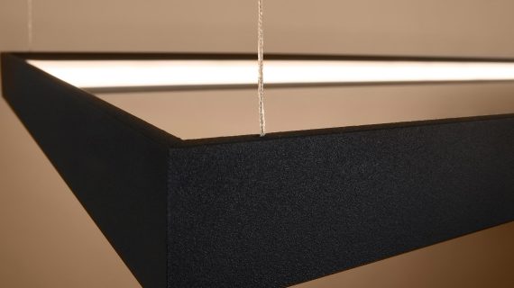 Esencją kolekcji TURIN jest prostokątna, smukła oprawa połączona z fantazyjnym zawiesiem. Minimalistyczny profil wygląda lekko, niemal jak zawieszony w powietrzu, a jednocześnie kryje w sobie moduł LED o rozproszonym świeceniu. Zamiast punktowego „placka” światła otrzymujesz równą, miękką poświatę, która sprzyja rozmowom, relaksowi i codziennym rytuałom. To światło, które nie męczy wzroku i pięknie wydobywa kolory materiałów.