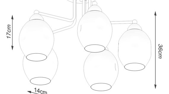 Proporcje lampy (ok. 59/59/36 cm) sprawiają, że YUMA 5 świetnie czuje się w średnich i większych pomieszczeniach. Klosze (ok. 17/15 cm) proporcjonalnie „rysują” przestrzeń – są widoczne, ale nie dominują. Podsufitka (14/14/3 cm) porządkuje instalację i estetycznie maskuje podłączenie. Całość jest przyjemnie „czysta w linii”, co docenią miłośnicy minimalizmu.