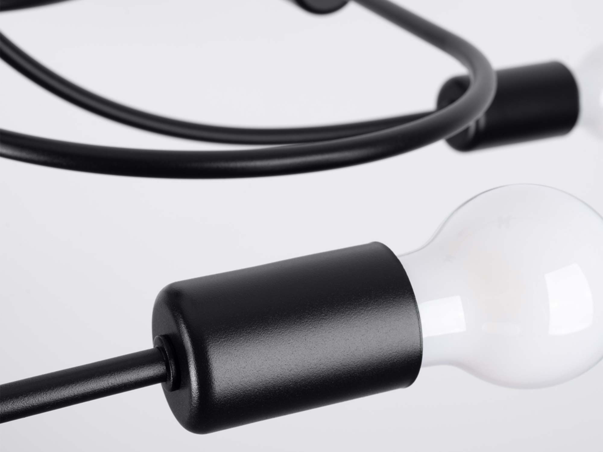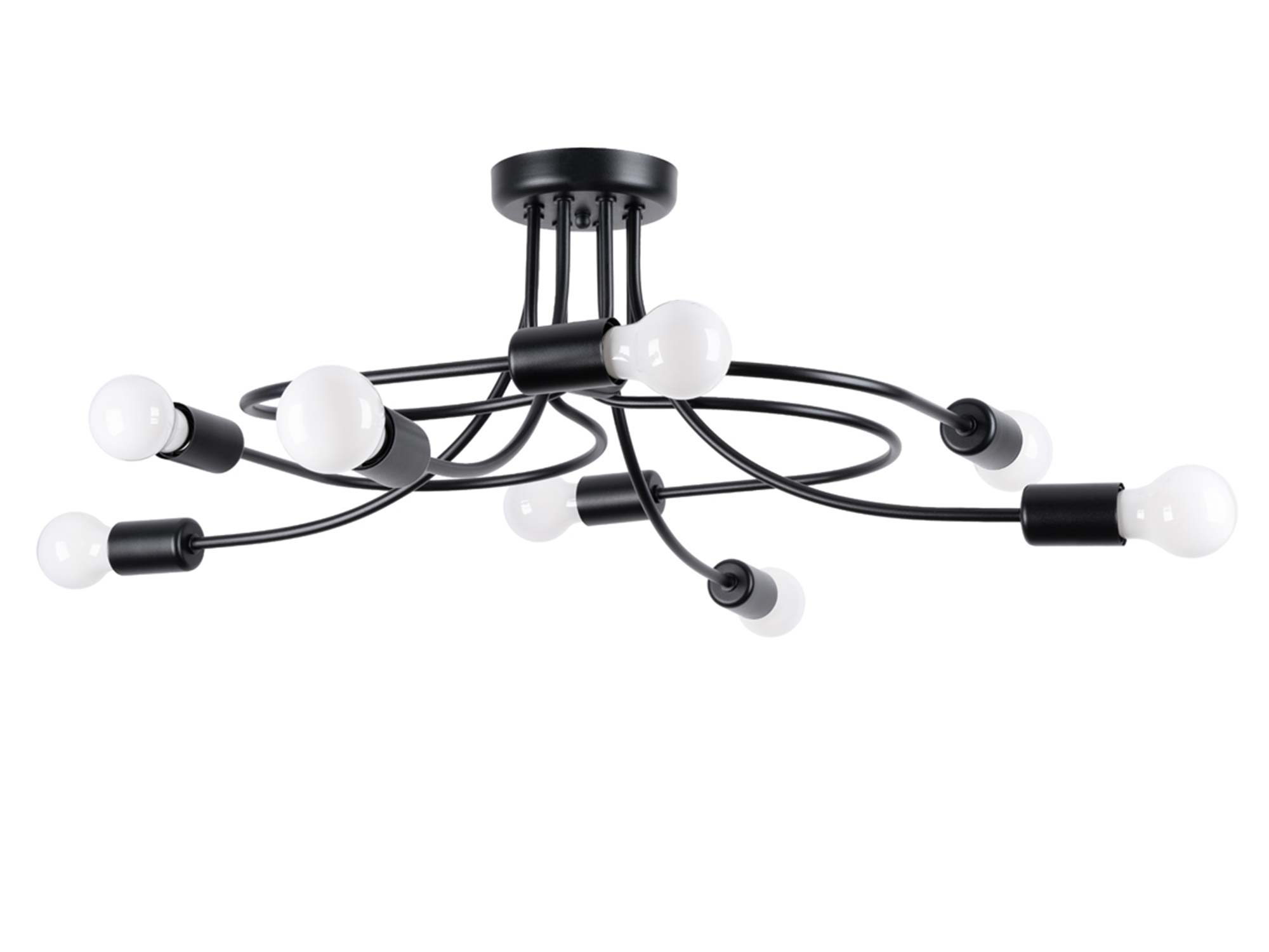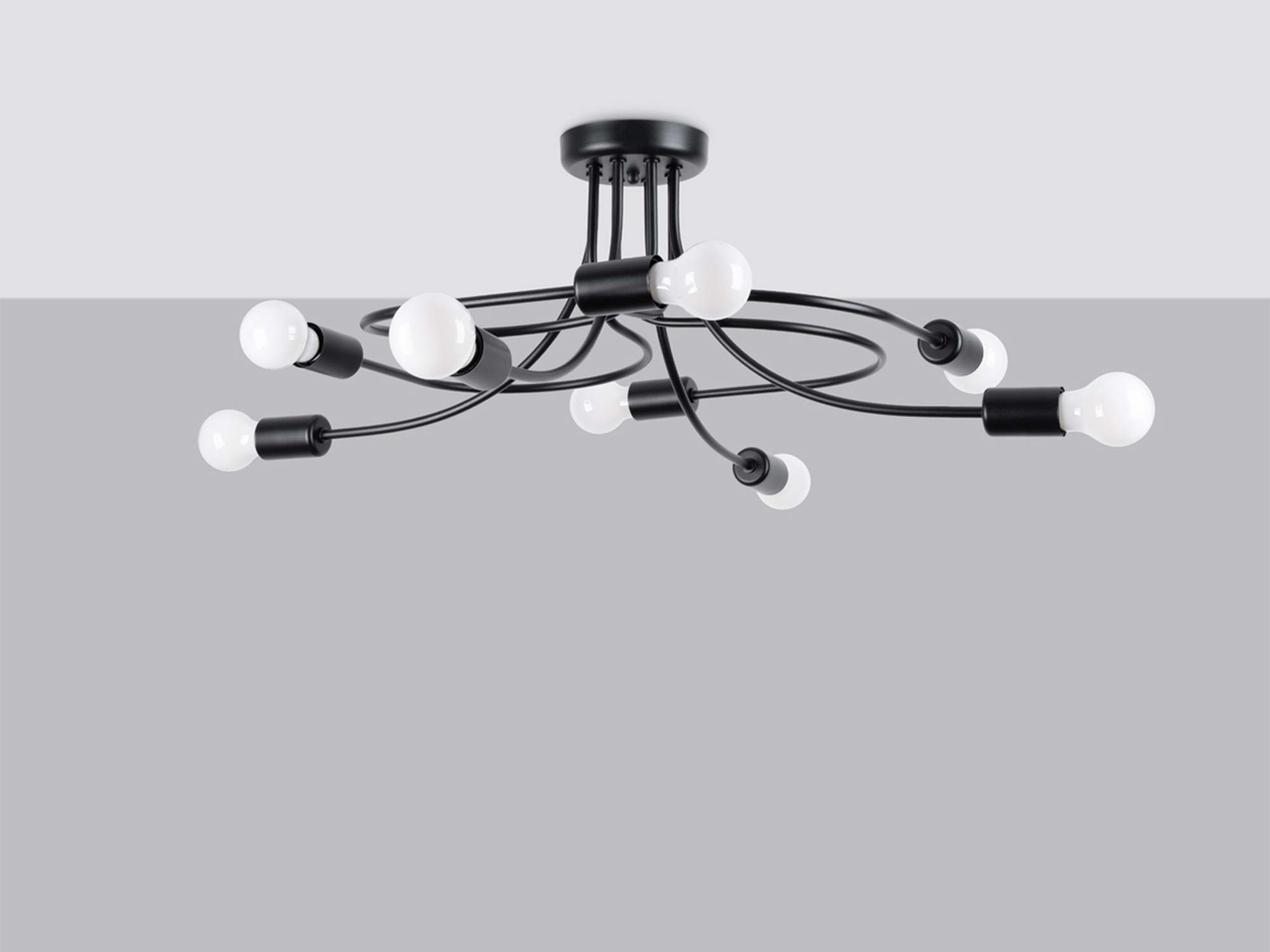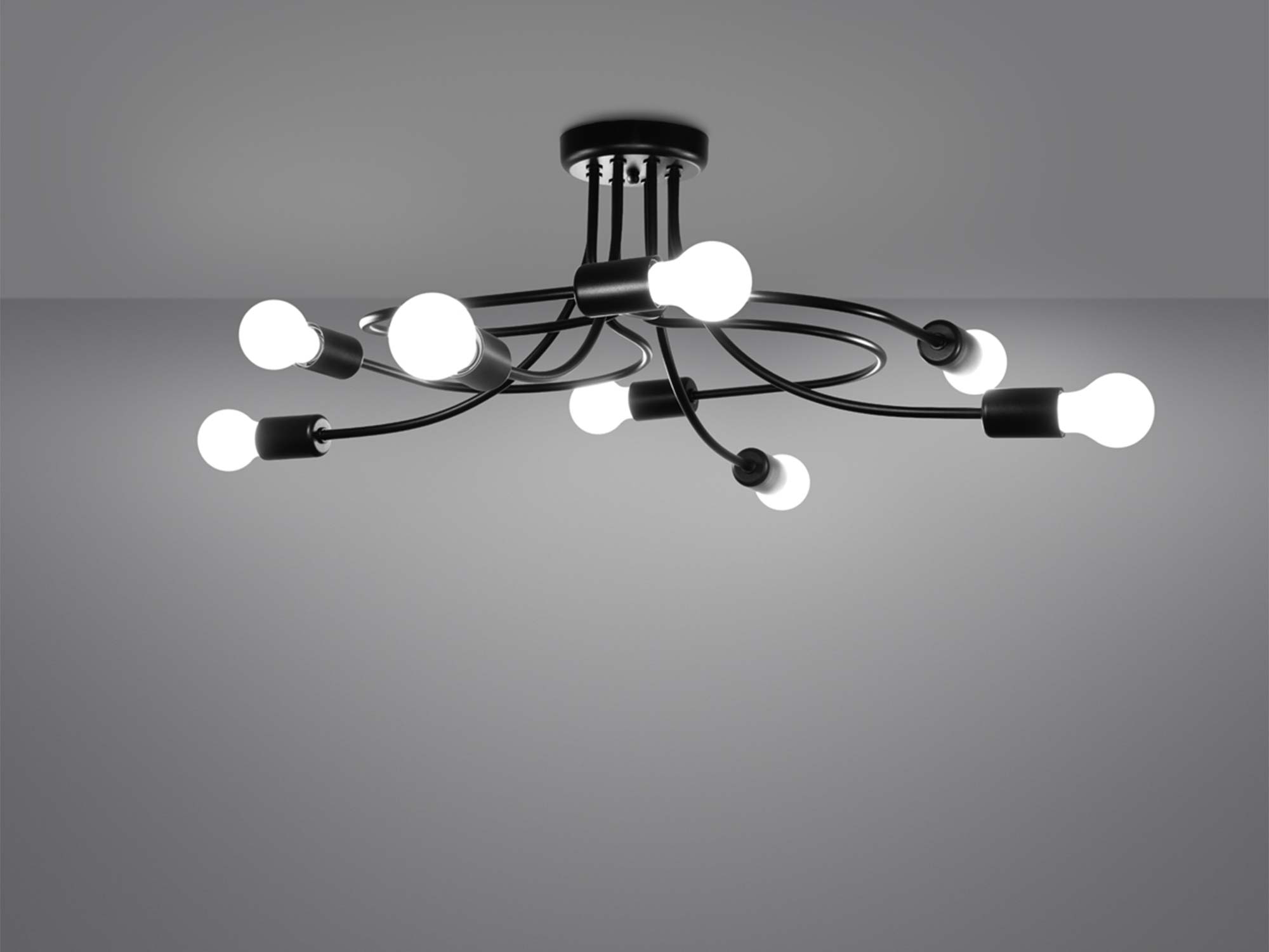 Czarna kolorystyka podkreśla jego uniwersalny charakter i pozwala na dopasowanie do jasnych oraz ciemniejszych wnętrz. Osiem punktów świetlnych z gwintem E27 daje dużą swobodę w doborze żarówek – możesz zdecydować się na ciepłe światło tworzące nastrojowy klimat, albo neutralne, które będzie idealne do codziennych aktywności.