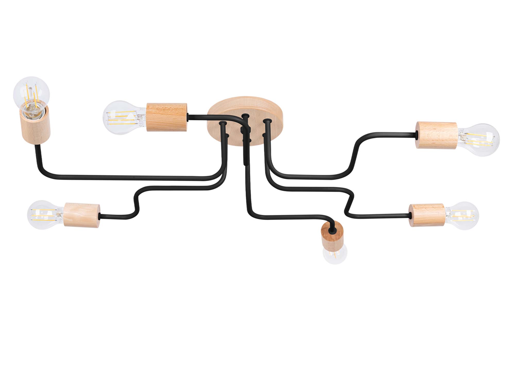 Żyrandol TIMBRA 6 przyciąga uwagę swoim industrialnym charakterem. Czerń metalu nadaje mu surowego, nowoczesnego stylu, a drewniane elementy w naturalnym odcieniu wprowadzają ciepło i subtelną elegancję. To właśnie dzięki tej kontrastowej kompozycji lampa staje się wyjątkowa.