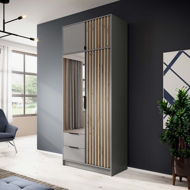 - Nowoczesna estetyka: Dostępna w kolorach Artisan, Grafit oraz Szary, nadstawka DELY wprowadza do wnętrz świeżość i współczesny charakter dzięki ozdobnym lamelom o profilu 18×18 cm.