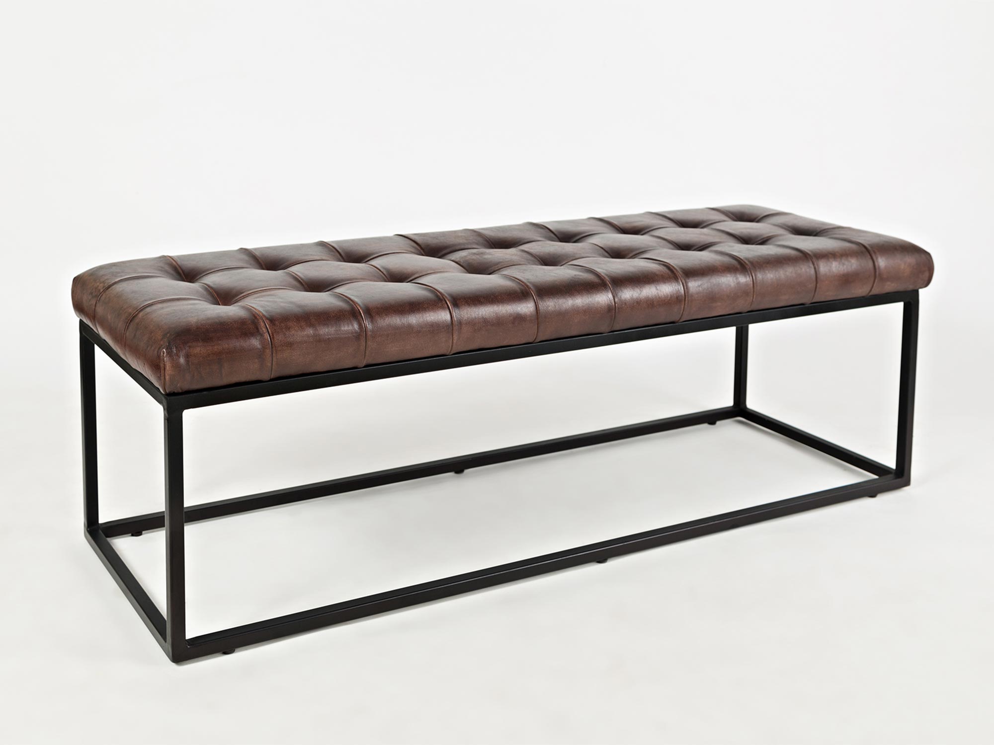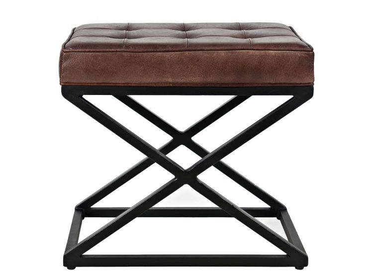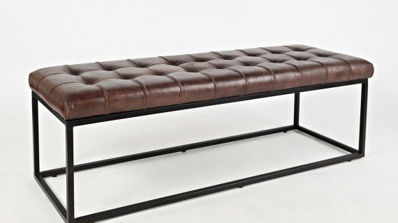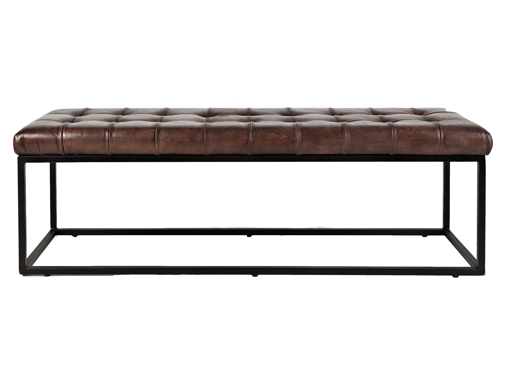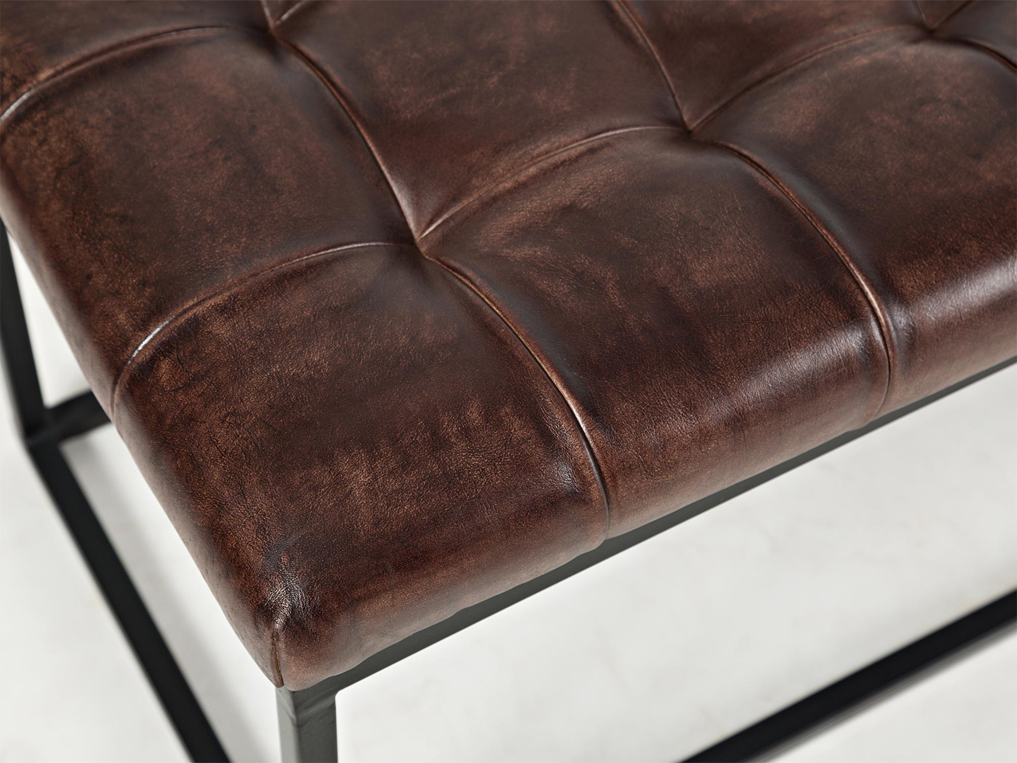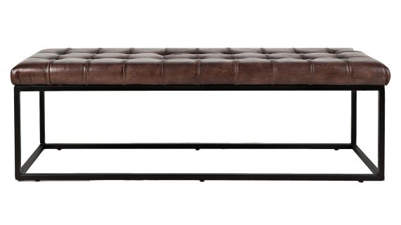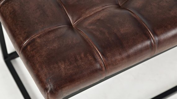 Elegancka ławka tapicerowana z naturalnej skóry w kolorze ciemnej sieny palonej, która doskonale wpisuje się w styl industrialny. Ciemne, wyraziste odcienie skórzanego siedziska kontrastują z czarnym metalowym stelażem, tworząc wyjątkowy i elegancki element wyposażenia. Pikowane siedzisko zapewnia komfort i trwałość, a solidna konstrukcja z metalowymi nogami gwarantuje stabilność. Idealna do salonu, przedpokoju lub przestrzeni o industrialnym charakterze.