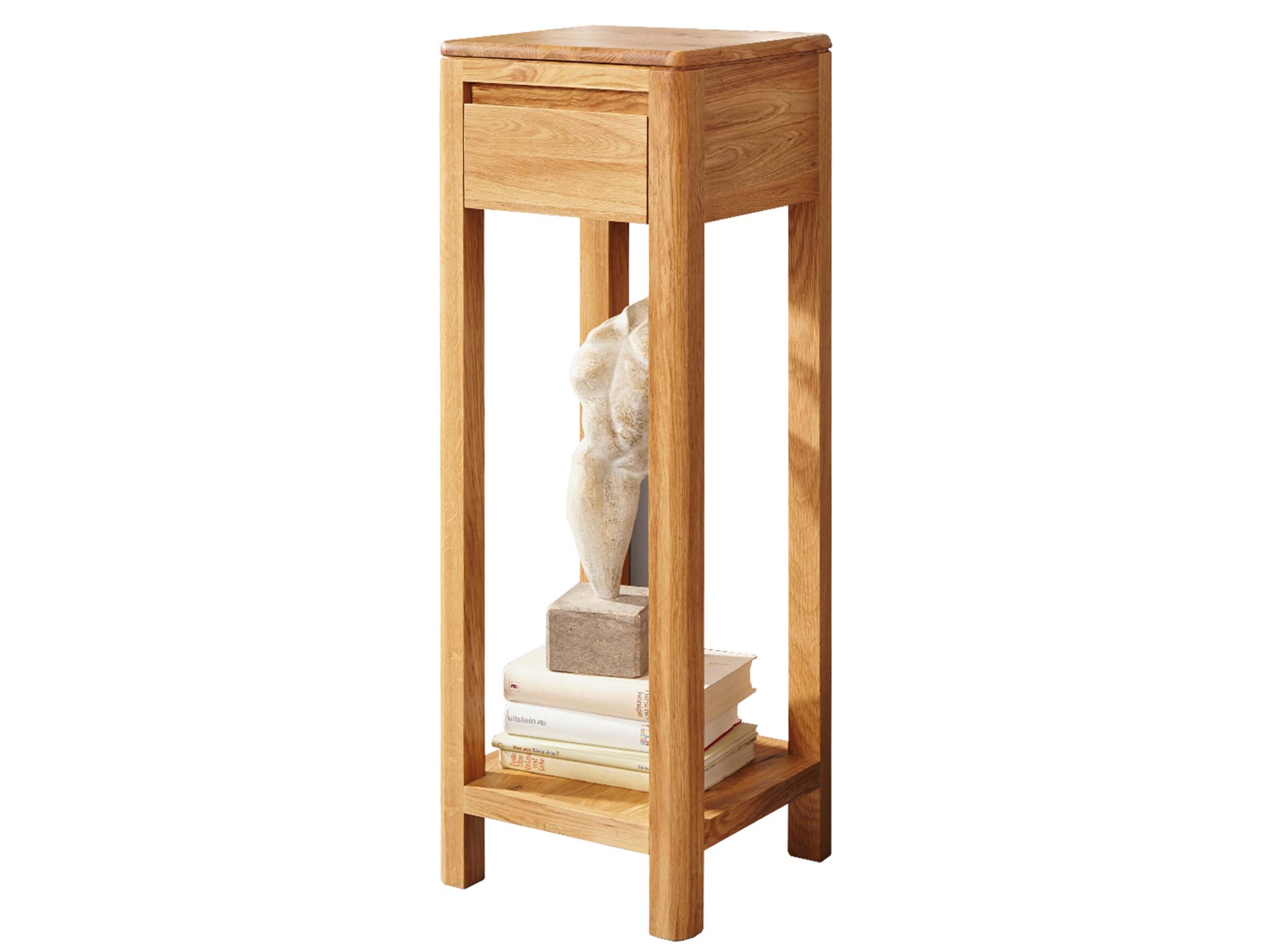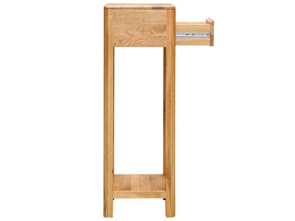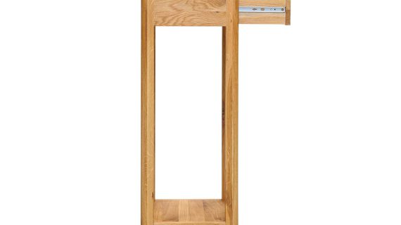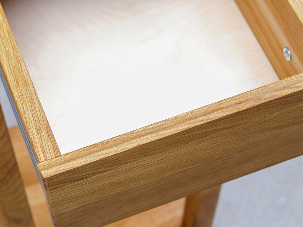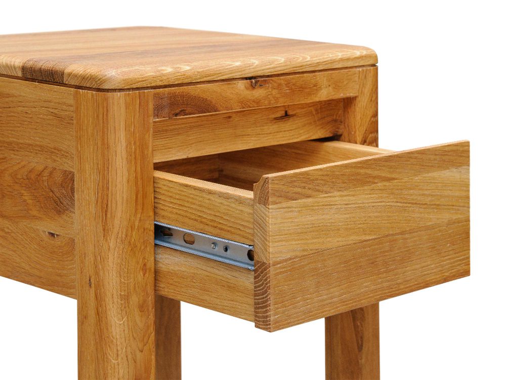 Mocną stroną modelu jest lite drewno dębowe – materiał, który od lat pozostaje synonimem jakości i trwałości. Naturalne słoje i sęki sprawiają, że każdy egzemplarz jest unikalny, a olejowane wykończenie podkreśla rysunek drewna, nie tworząc plastikowej powłoki. Smukła bryła o wymiarach 90 × 30 × 30 cm łatwo odnajdzie się w salonie, przedpokoju czy sypialni, a także w przestrzeniach skandynawskich, japandi i loftowych – wszędzie tam, gdzie liczą się ład, światło i naturalne materiały.