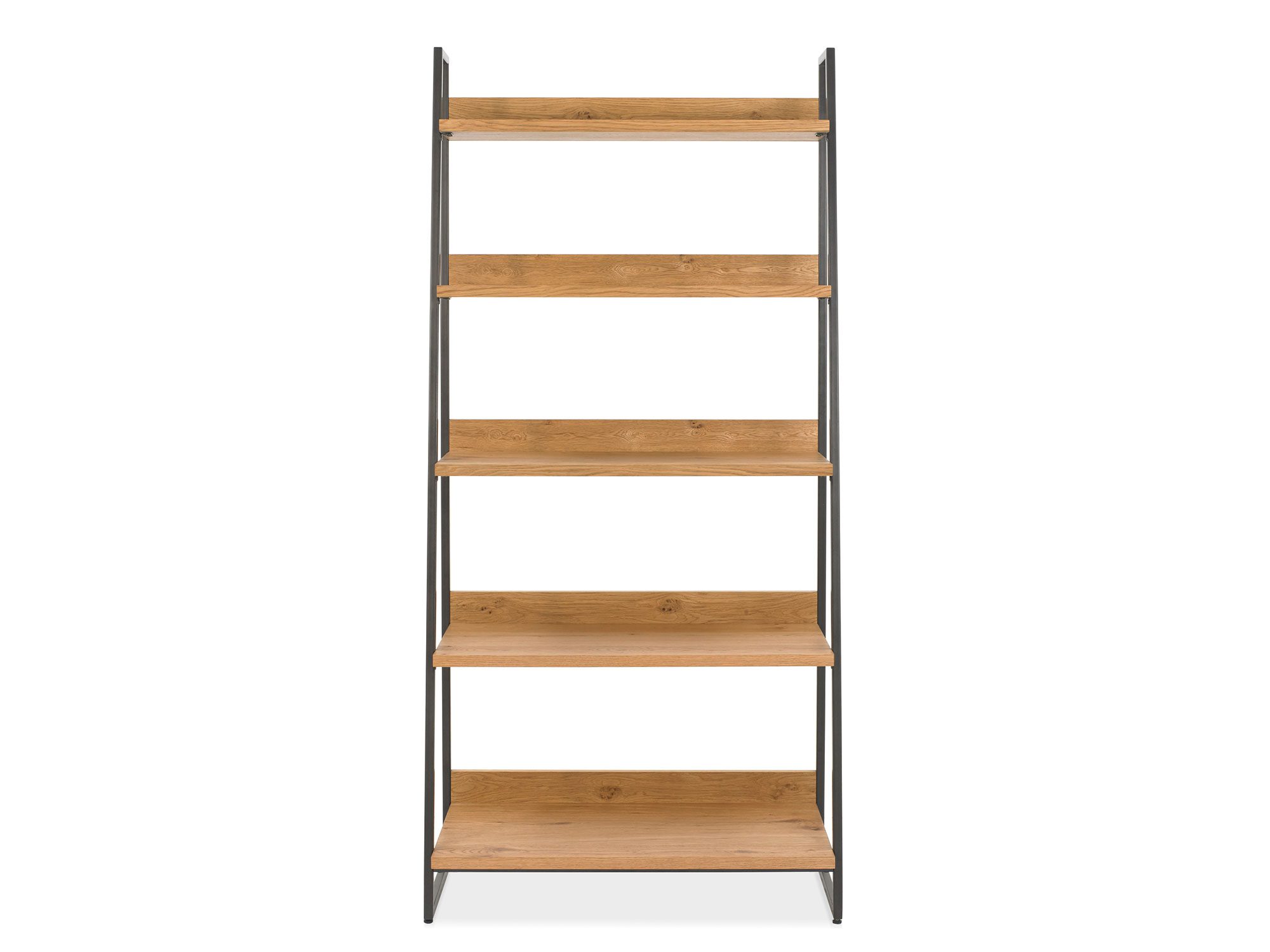 Regał otwarty industrialny z pięcioma półkami drewnianymi i czarną ramą, widok pod kątem