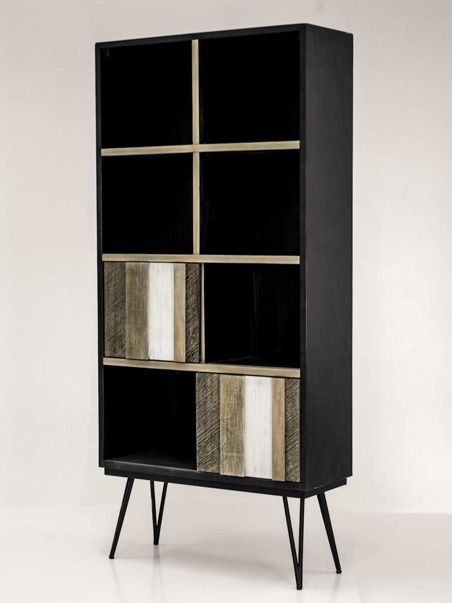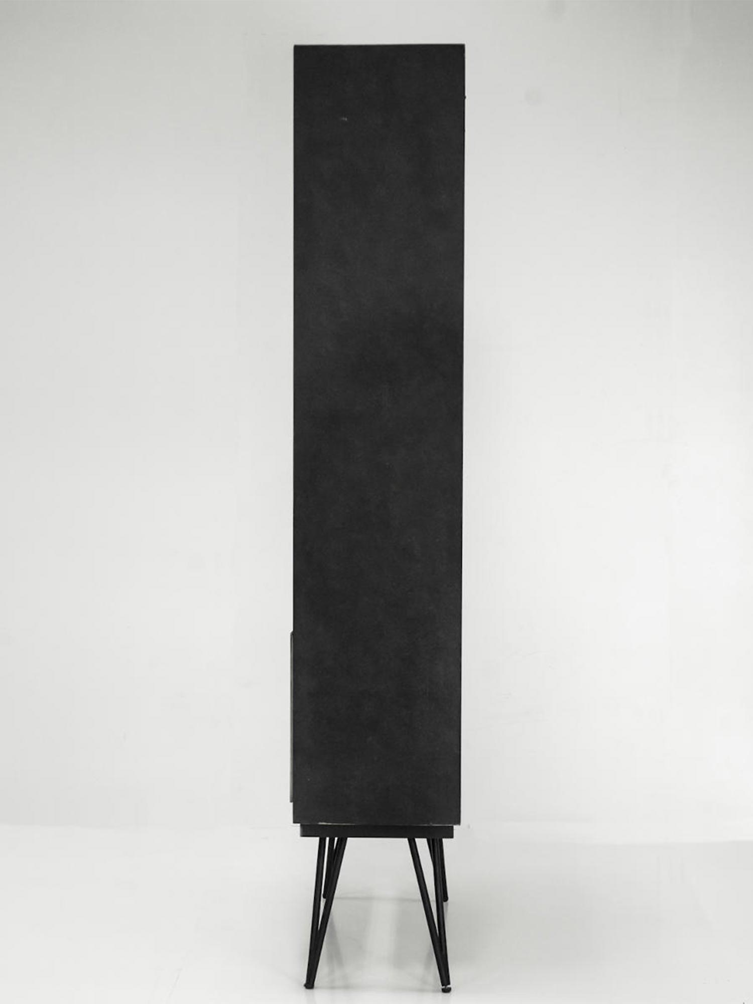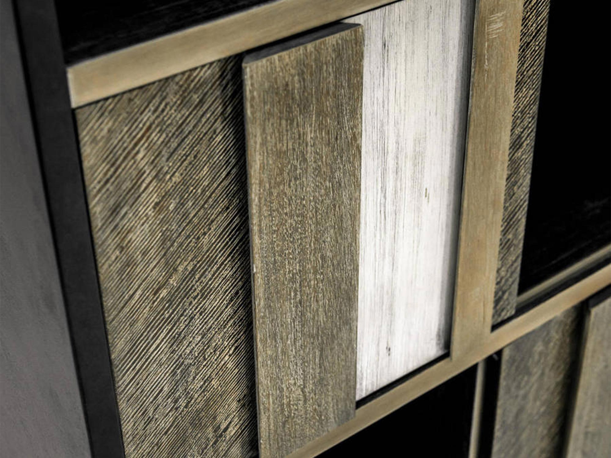 Regał Mondo to połączenie eleganckiego retro stylu z nowoczesnymi rozwiązaniami. Fronty regału zostały wykonane z litego drewna akacji, w różnych odcieniach szarości i beżu, z unikalną strukturą 3D. Takie wykończenie sprawia, że regał jest nie tylko funkcjonalnym meblem, ale także artystycznym elementem dekoracyjnym. Metalowe nogi w kolorze czarnym nadają mu stabilności i nowoczesnego wyglądu, który dobrze komponuje się w różnych aranżacjach wnętrz. Korpus wykonany z płyty MDF w kolorze czarnym stanowi doskonałe tło dla pięknych, naturalnych frontów.