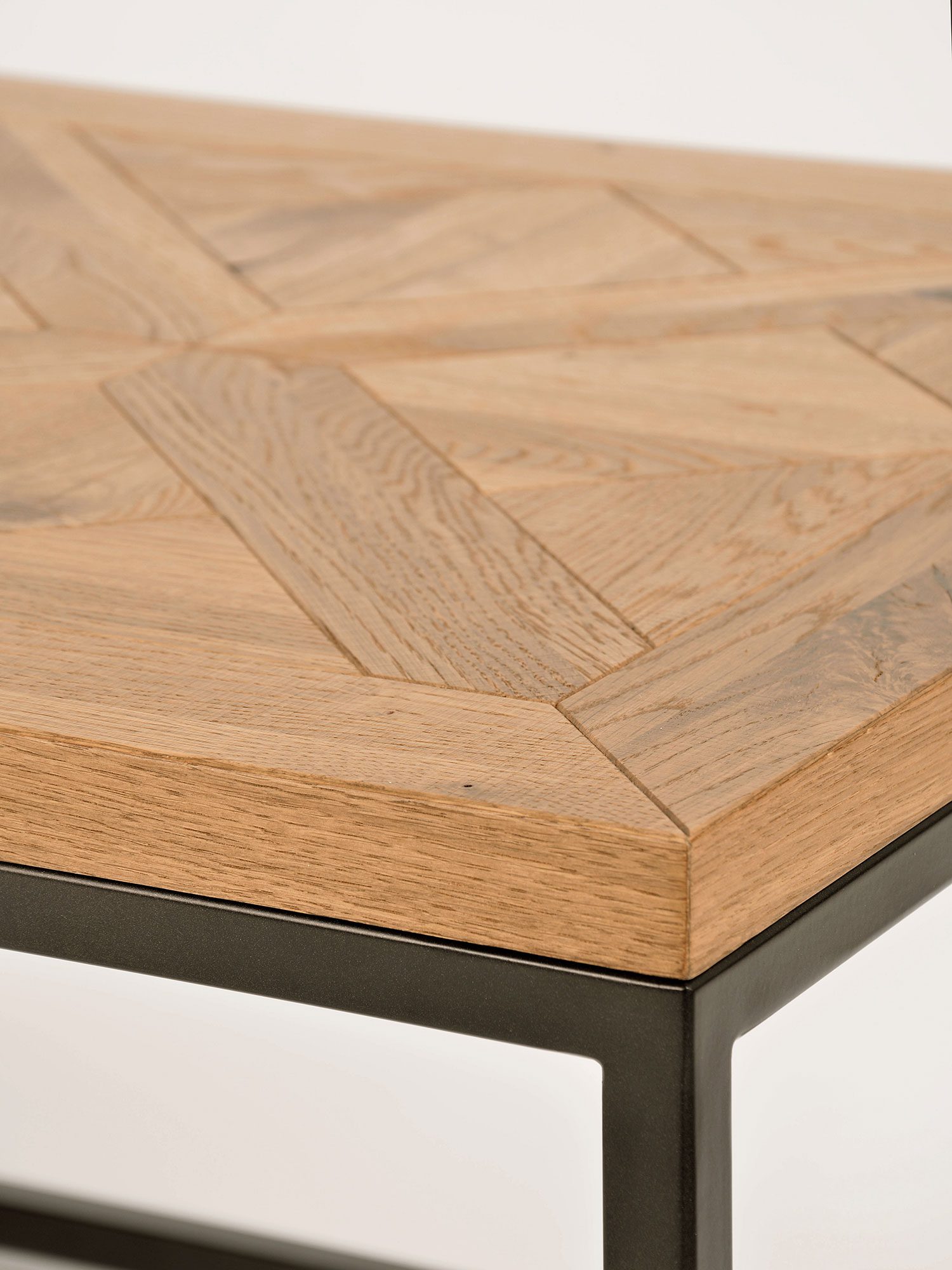 Stolik kawowy Karma to elegancka i funkcjonalna propozycja do każdego loftowego wnętrza. Wykonany z wysokiej jakości materiałów, takich jak drewno białego dębu i stal, stół łączy nowoczesny design z industrialnym stylem. Blat z intarsją w kształcie X oraz stalowa konstrukcja dodają meblowi charakteru, a jego praktyczne wymiary sprawiają, że będzie doskonałym wyborem do każdego pomieszczenia. Zainwestuj w ten stylowy stolik, który doda elegancji i funkcjonalności Twojemu wnętrzu!