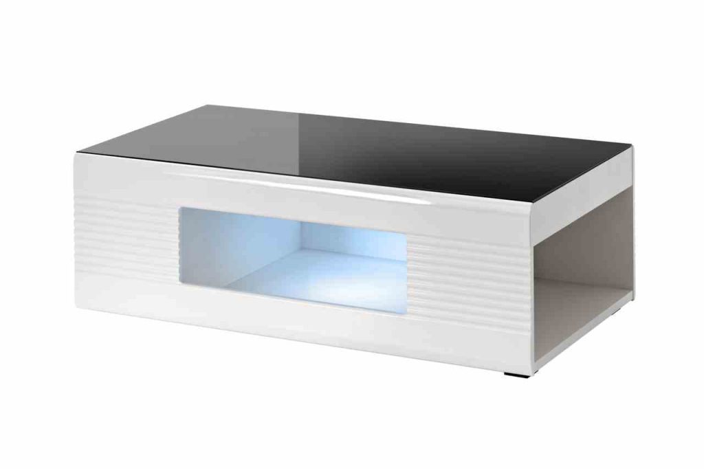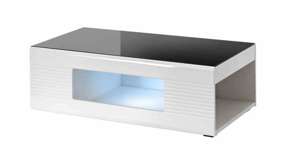 Co najważniejsze stolik kawowy Mason wykonany w nowoczesnej stylistyce w biało-czarnej kolorystyce, dzięki czemu to mebel uniwersalny i niezwykle stylowy. Ponadto wyposażono go w oświetlenie LED w kolorze niebieskim.