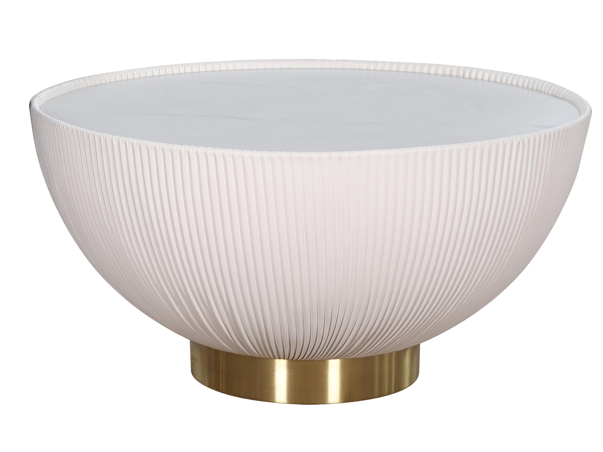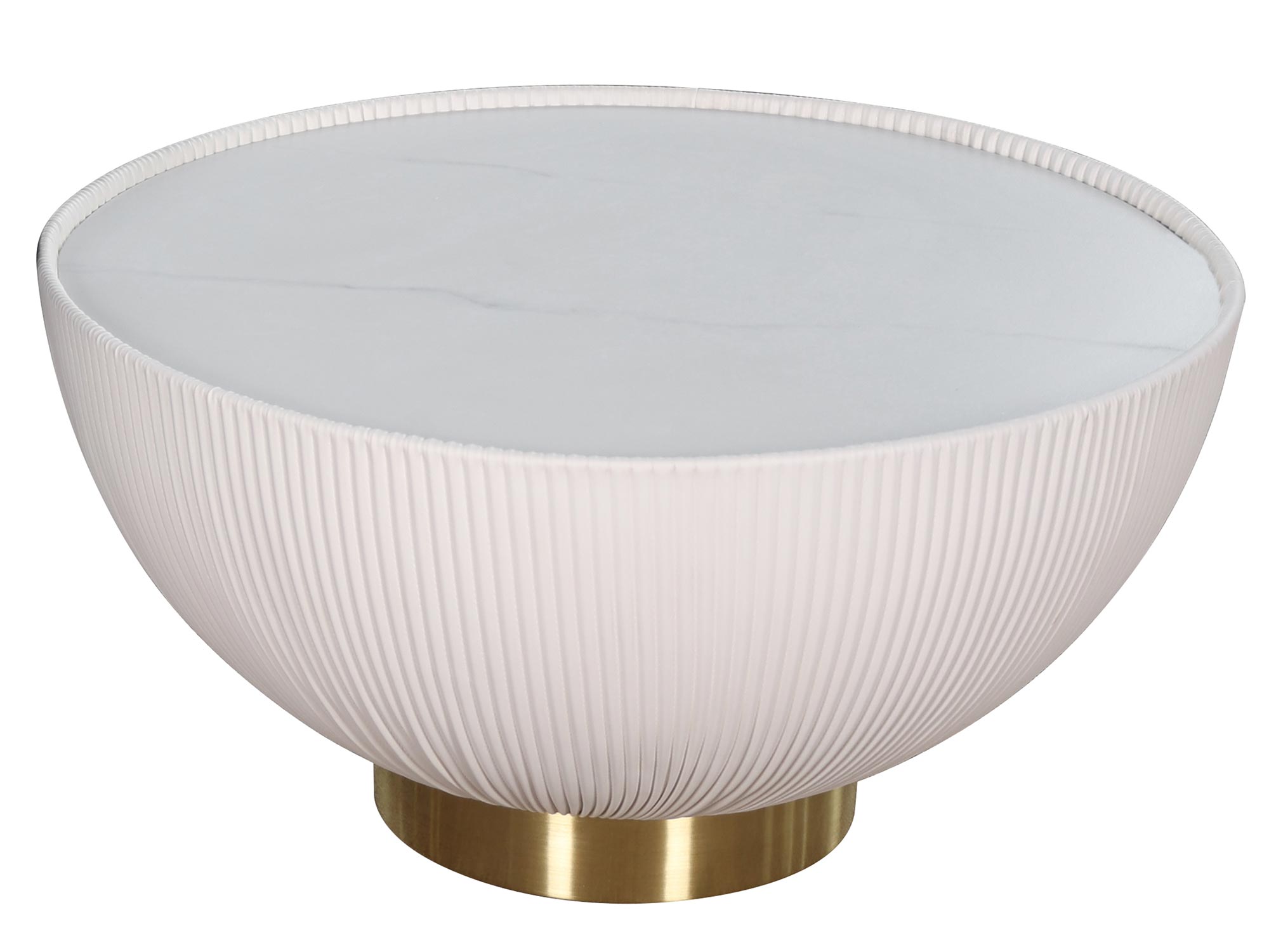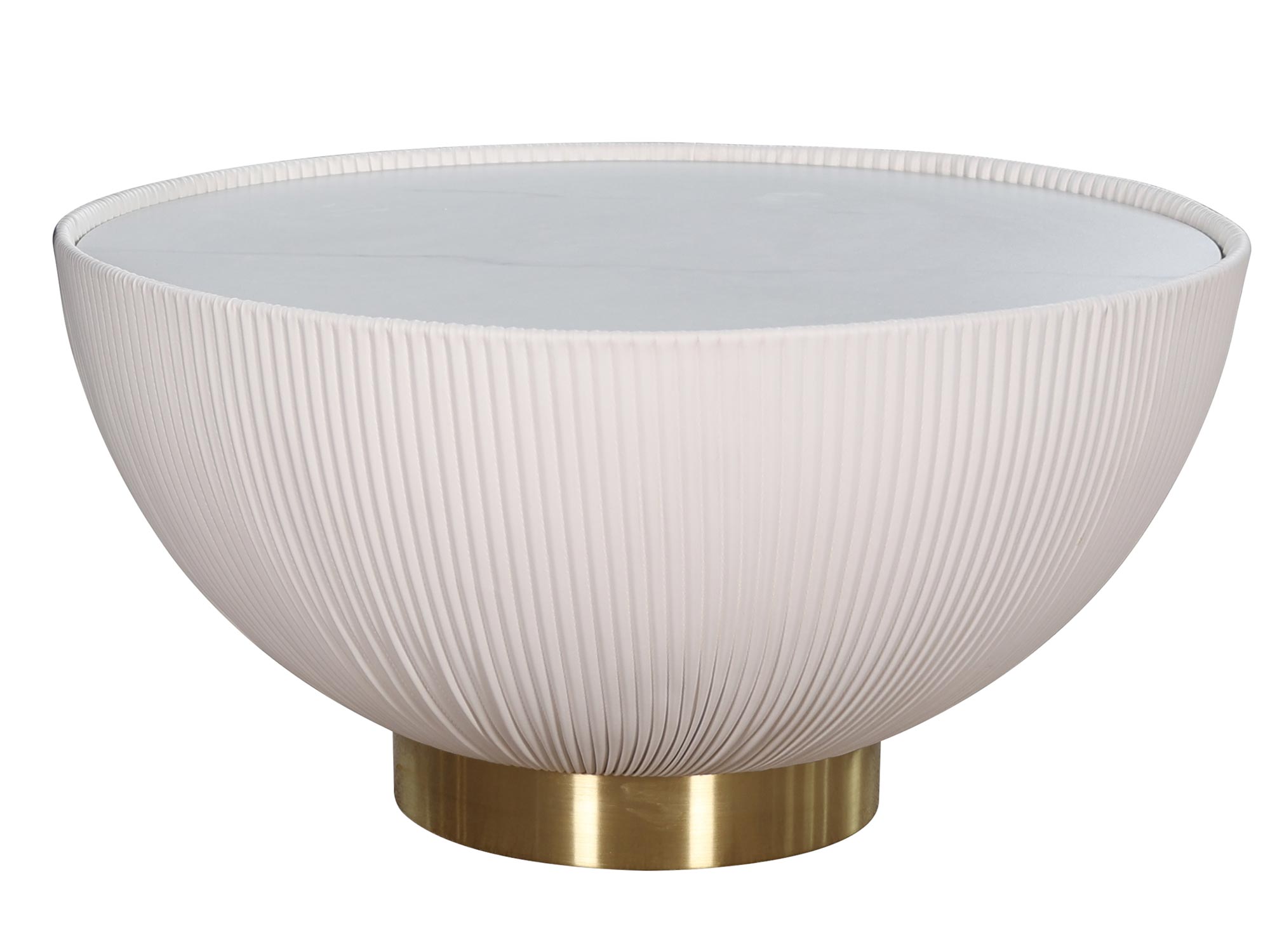 Stolik kawowy Virtus to połączenie nowoczesnego stylu z eleganckimi akcentami. Podstawa stolika wykonana jest z chromowanej stali nierdzewnej, w kształcie półkuli, pokrytej ekologiczną skórą z pionowymi plisami, zakończoną złotym akcentem, który podkreśla jej elegancję. Blat o okrągłym kształcie jest imitacją marmuru, dzięki czemu stolik idealnie wpisuje się w modne wnętrza w stylu nowoczesnym, skandynawskim, a także glamour.