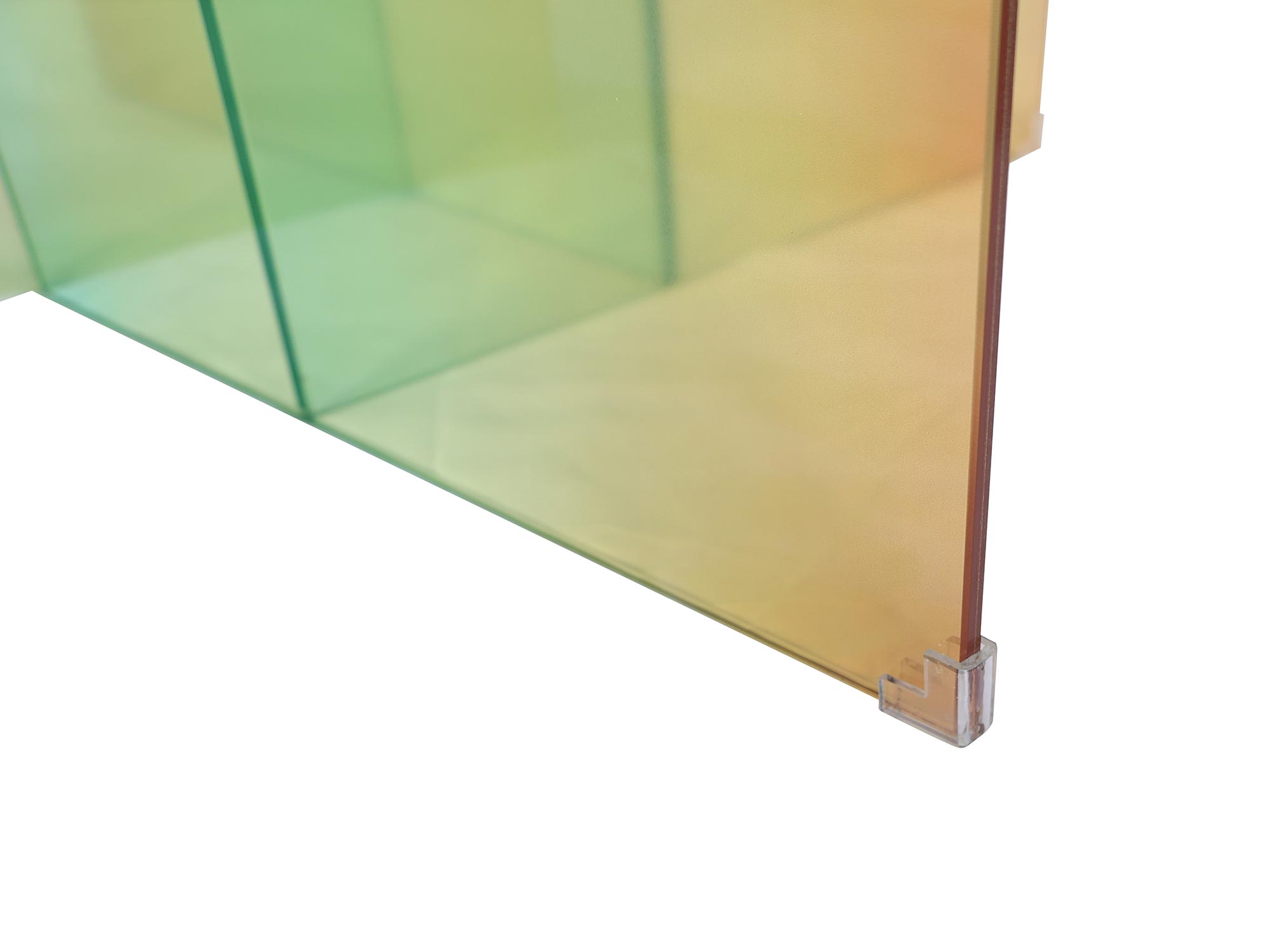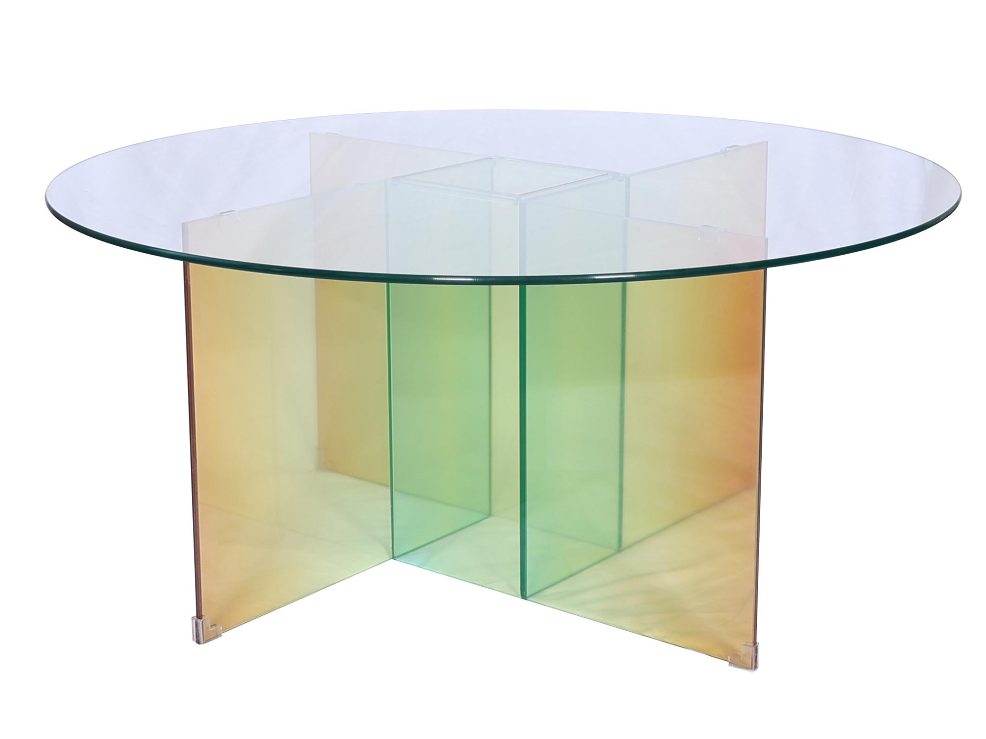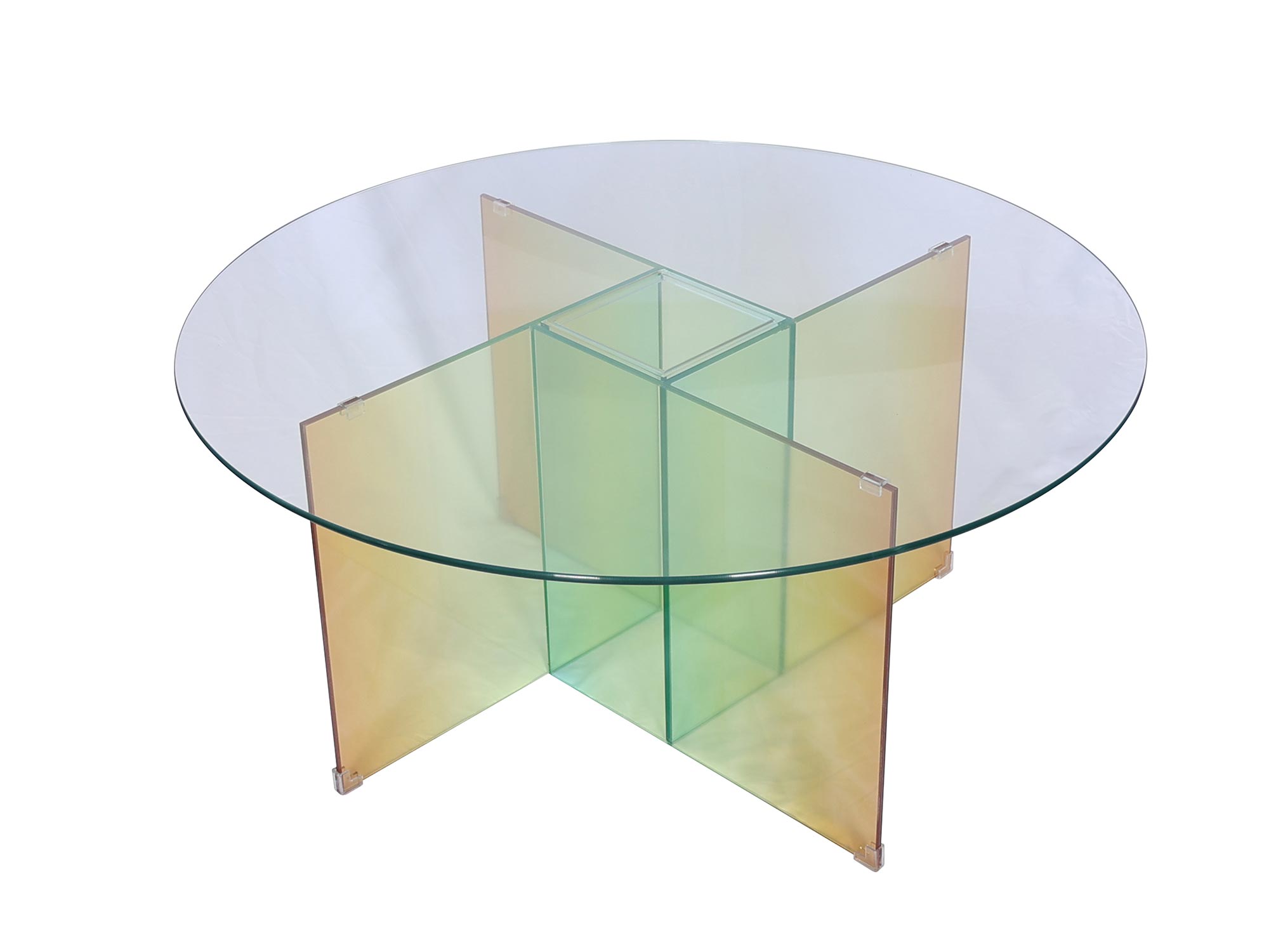 Stolik Virtus to doskonały przykład połączenia nowoczesnego designu z funkcjonalnością. Blat wykonany z przezroczystego, laminowanego szkła o opalizujących właściwościach zmienia kolor w zależności od światła, co nadaje meblowi wyjątkowy charakter. Jego elegancka forma oraz solidna konstrukcja sprawiają, że jest idealnym wyborem do nowoczesnych wnętrz, które wymagają wyjątkowych akcentów.
