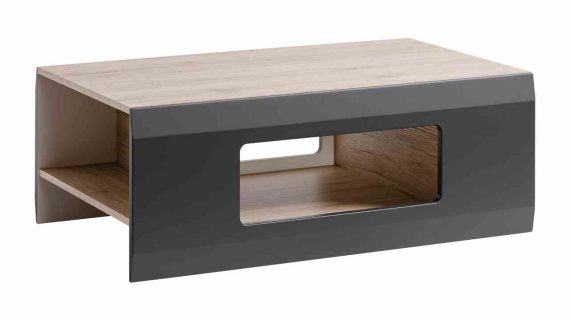 Nowoczesny stolik kawowy z półką Olivier, o oryginalnej formie dostępny w dwóch wariantach kolorystycznych, dzięki czemu z łatwością dopasuje się do niejednego wnętrza.
