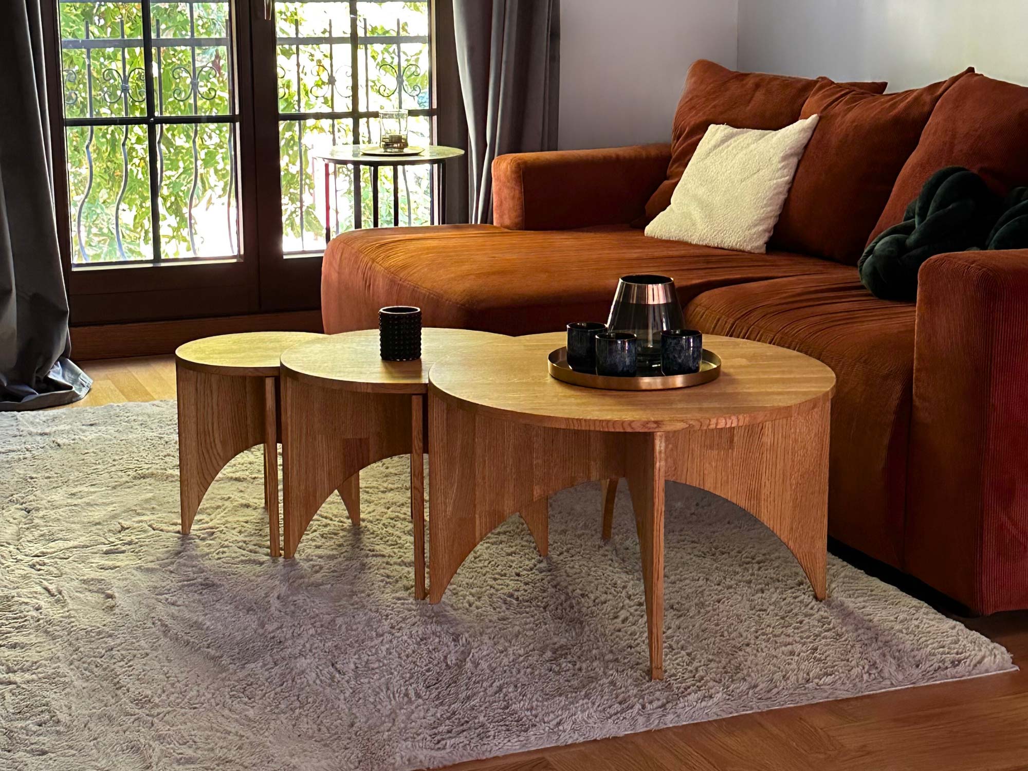 Taverno 3w1 to trzy okrągłe stoliki kawowe, które wprowadzą do Twojego salonu harmonię, światło i naturalne ciepło dębu. Wyobraź sobie poranek z kawą na największym blacie, popołudnie z książką przy średnim i wieczór z kieliszkiem wina na najmniejszym, przysuniętym tuż przy sofę. Ten zestaw daje Ci pełną swobodę aranżacji bez kompromisów między estetyką a wygodą. To meble, które najpierw uwodzą wyglądem, a chwilę później przekonują praktycznymi możliwościami ustawienia i codzienną trwałością.