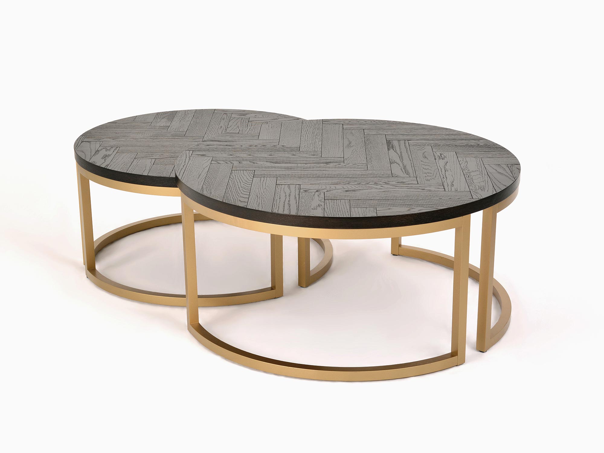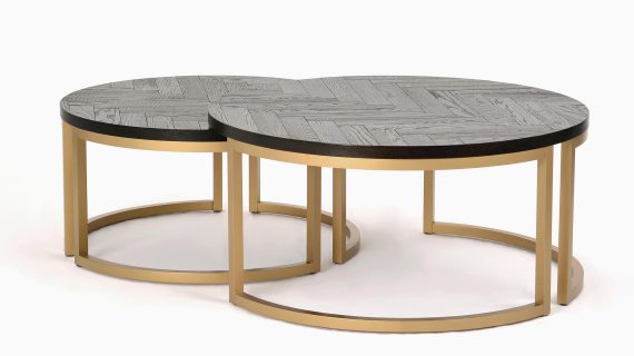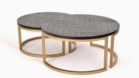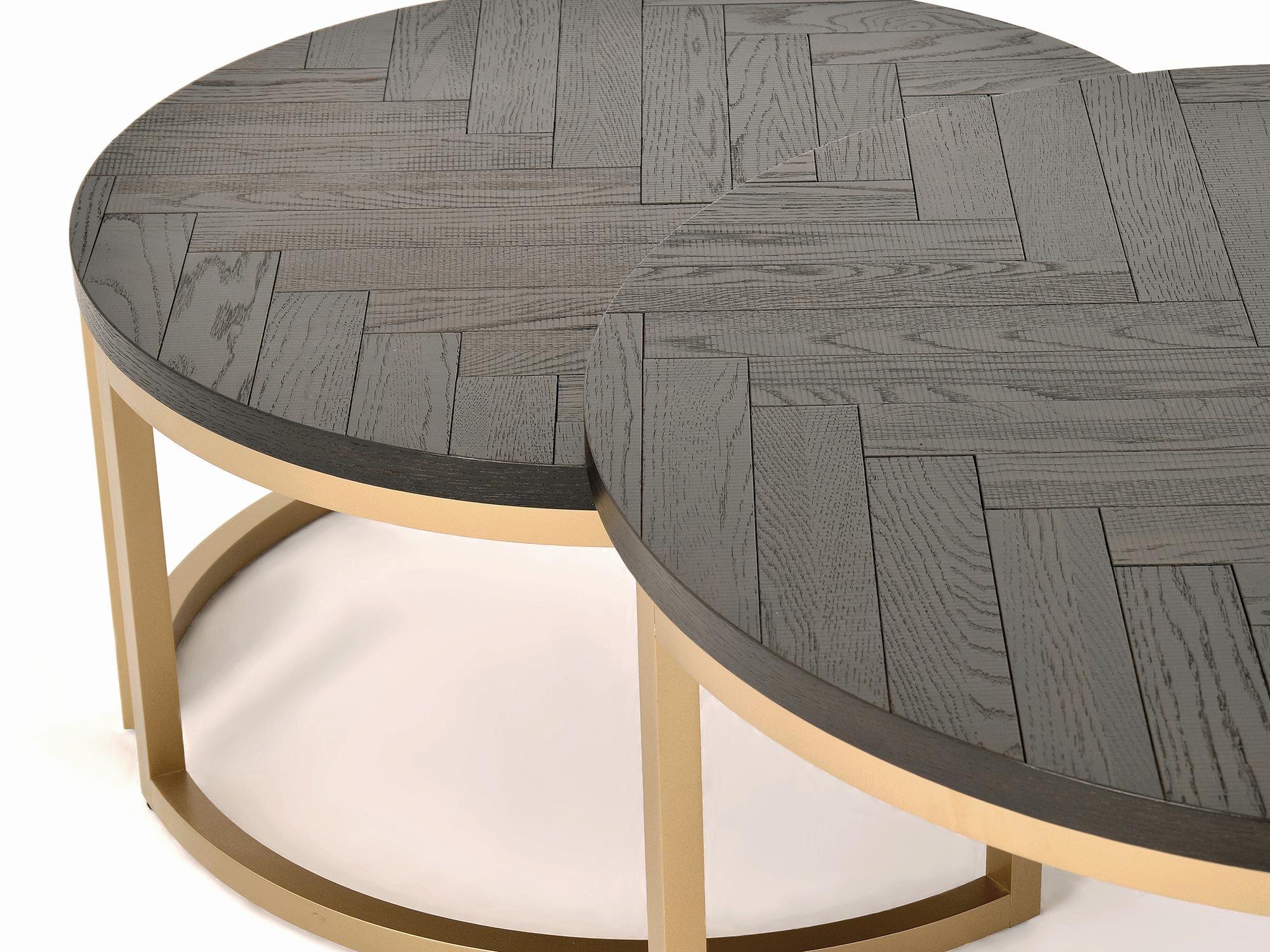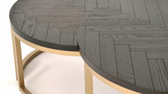 Stylowe stoliki kawowe Andaluzja to wyjątkowa propozycja łącząca nowoczesność, retro i glamour. Okrągły blat z intarsją w jodełkę w eleganckim czarnym połysku idealnie komponuje się z mosiężnymi nogami, nadając całemu meblowi szlachetności i charakteru. Stoliki wykonane z drewna bukowego oraz litego drewna dębowego są gwarancją solidności oraz luksusowego wyglądu. Doskonałe do nowoczesnych i klasycznych wnętrz, które wymagają subtelnej elegancji.