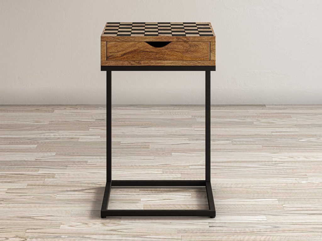 Kwadratowy stolik z szufladą i blatem w szachownicę z drewna