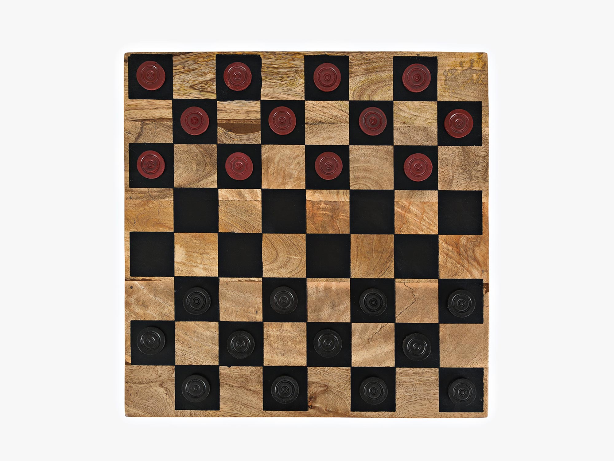 Drewniany stolik z szufladą i planszą do gry w warcaby