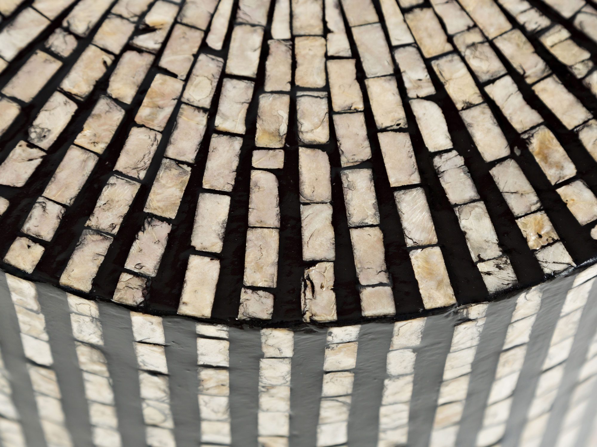Oryginalny stolik wykonany z naturalnej muszli morskiej, z ręcznie nanoszonym wzorem, stanowi wyjątkowy akcent do każdego wnętrza. Jego czarny kolor z piaskowymi akcentami w połączeniu z naturalnym materiałem sprawiają, że mebel jest zarówno elegancki, jak i nietuzinkowy. Idealny do salonu, sypialni czy innych przestrzeni, w których chcemy dodać unikalnego charakteru.