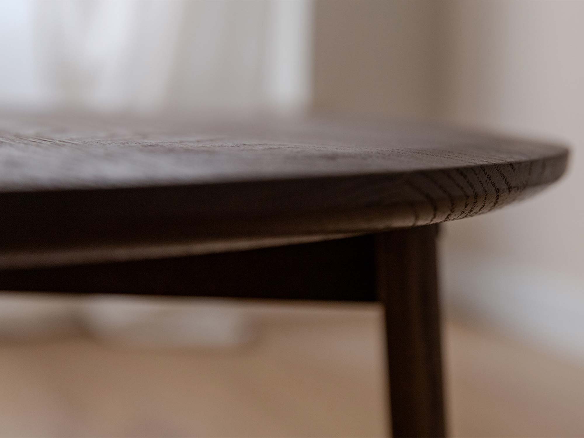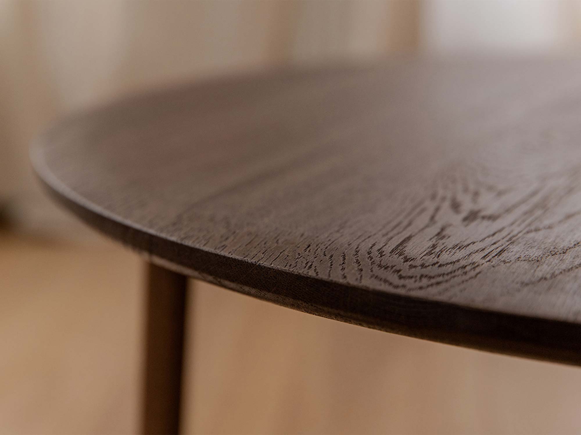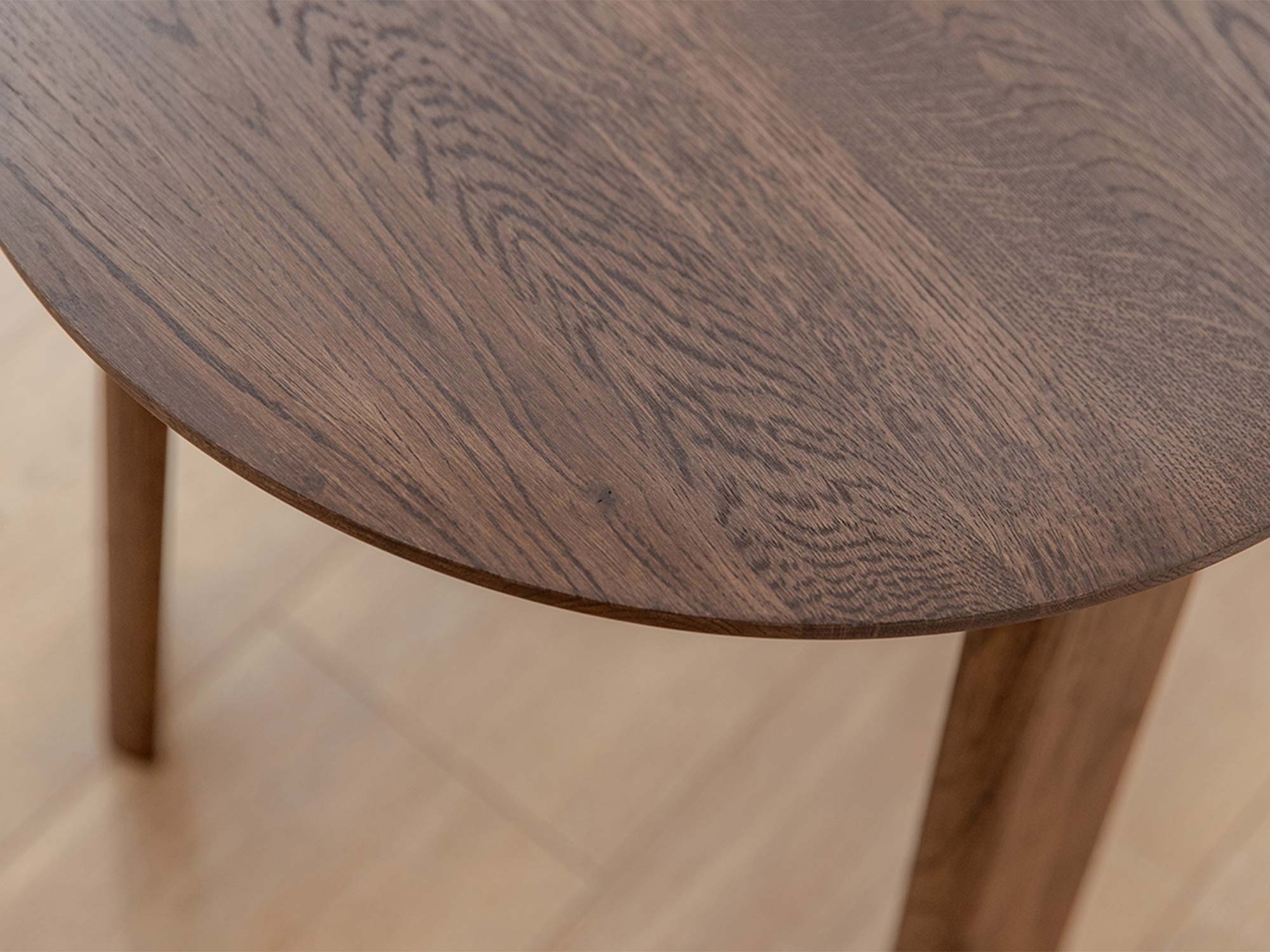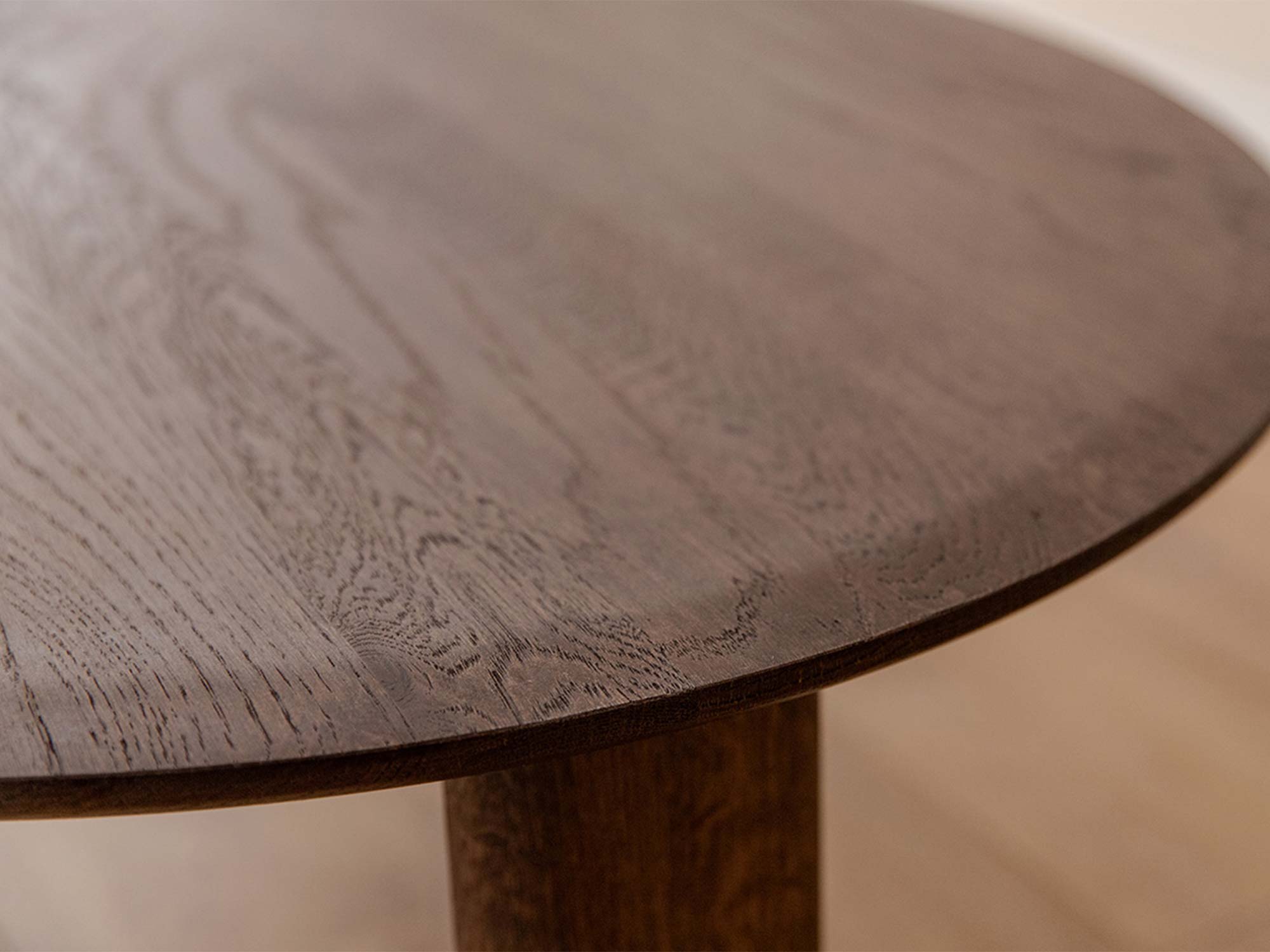 W kolekcji Asento pierwsze skrzypce gra lity dąb – szlachetny i trwały. Gładki, okrągły blat eksponuje naturalny rysunek słojów i subtelnych sęków, które nigdy nie powtarzają się w ten sam sposób. To dlatego każdy stolik ma swój charakter, a Ty zyskujesz unikat we wnętrzu. Olejowane wykończenie w kolorze tabacco podkreśla piękno drewna, nadaje powierzchni przyjemny, satynowy dotyk i ułatwia pielęgnację na co dzień.
