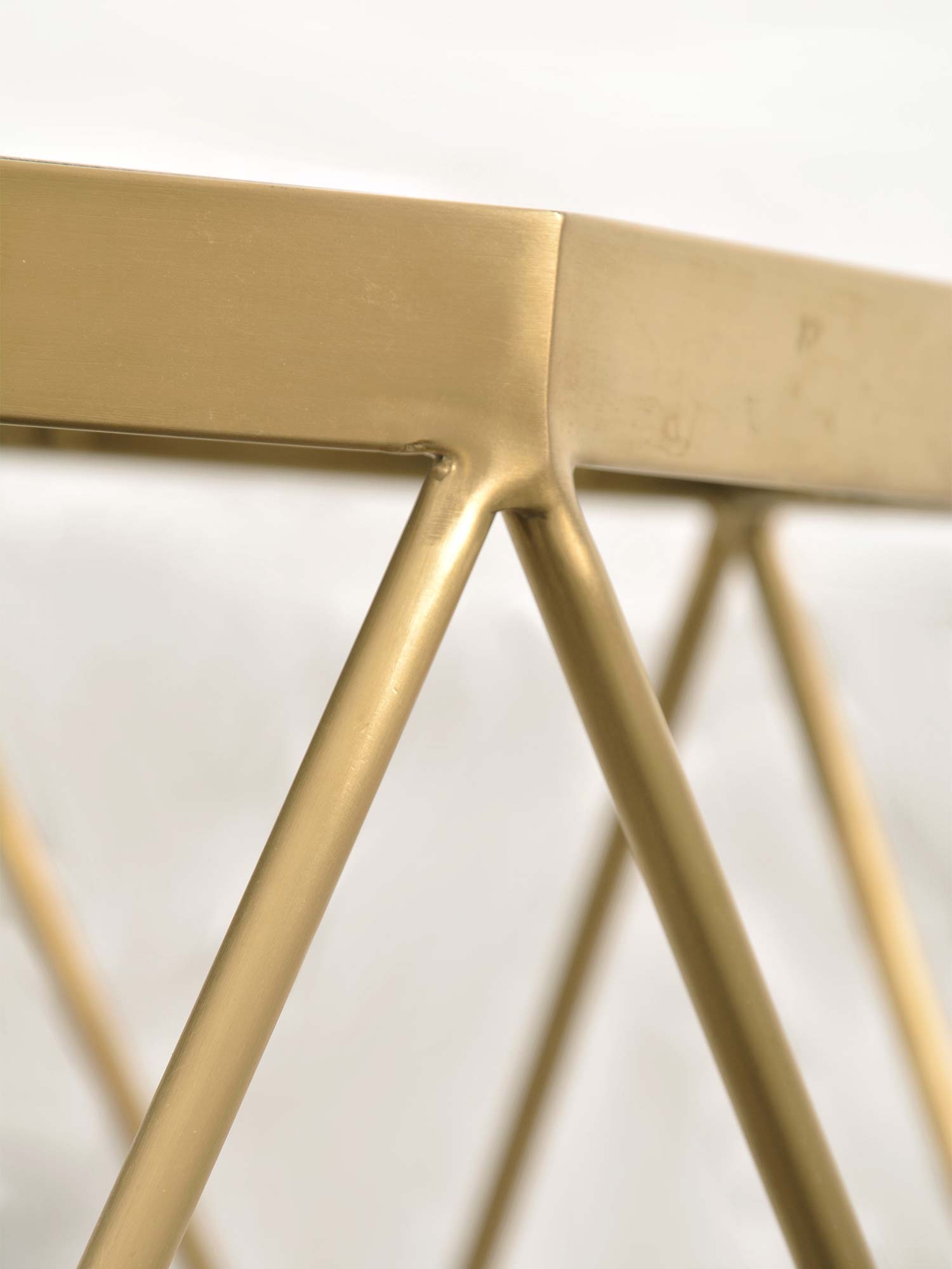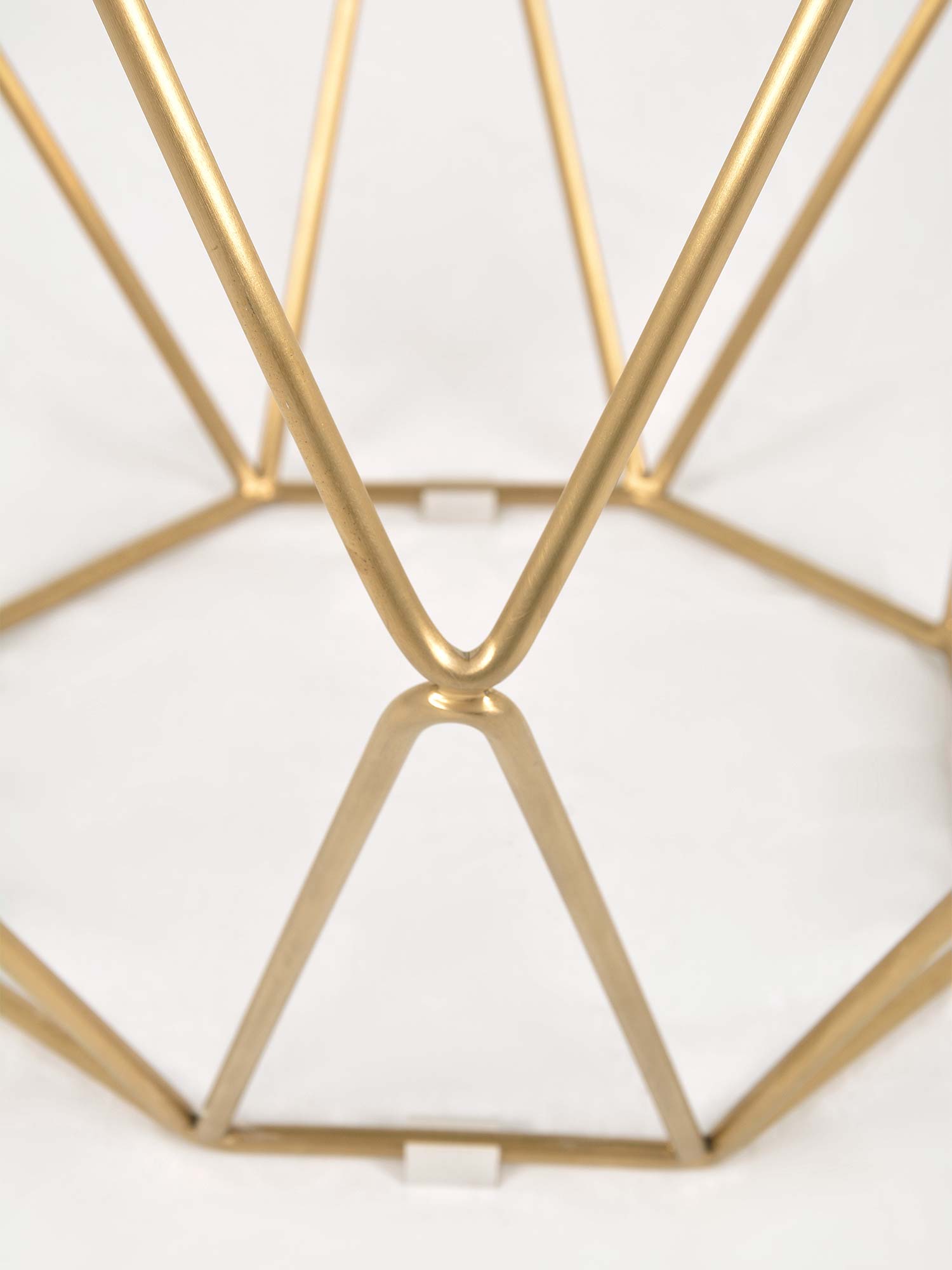 - Elegancka geometryczna rama ze stali nierdzewnej w kolorze złotym, która nadaje meblowi luksusowy wygląd.