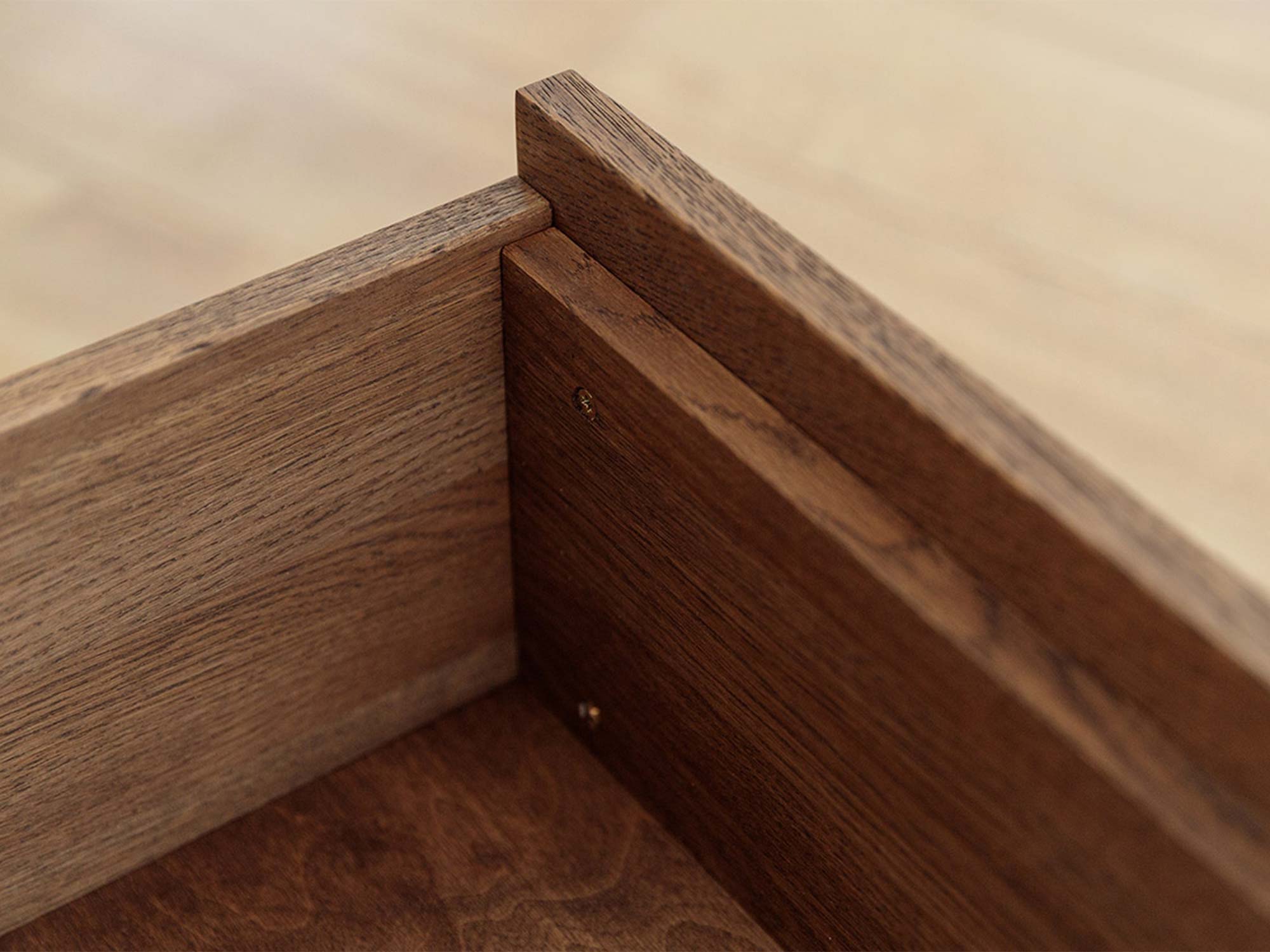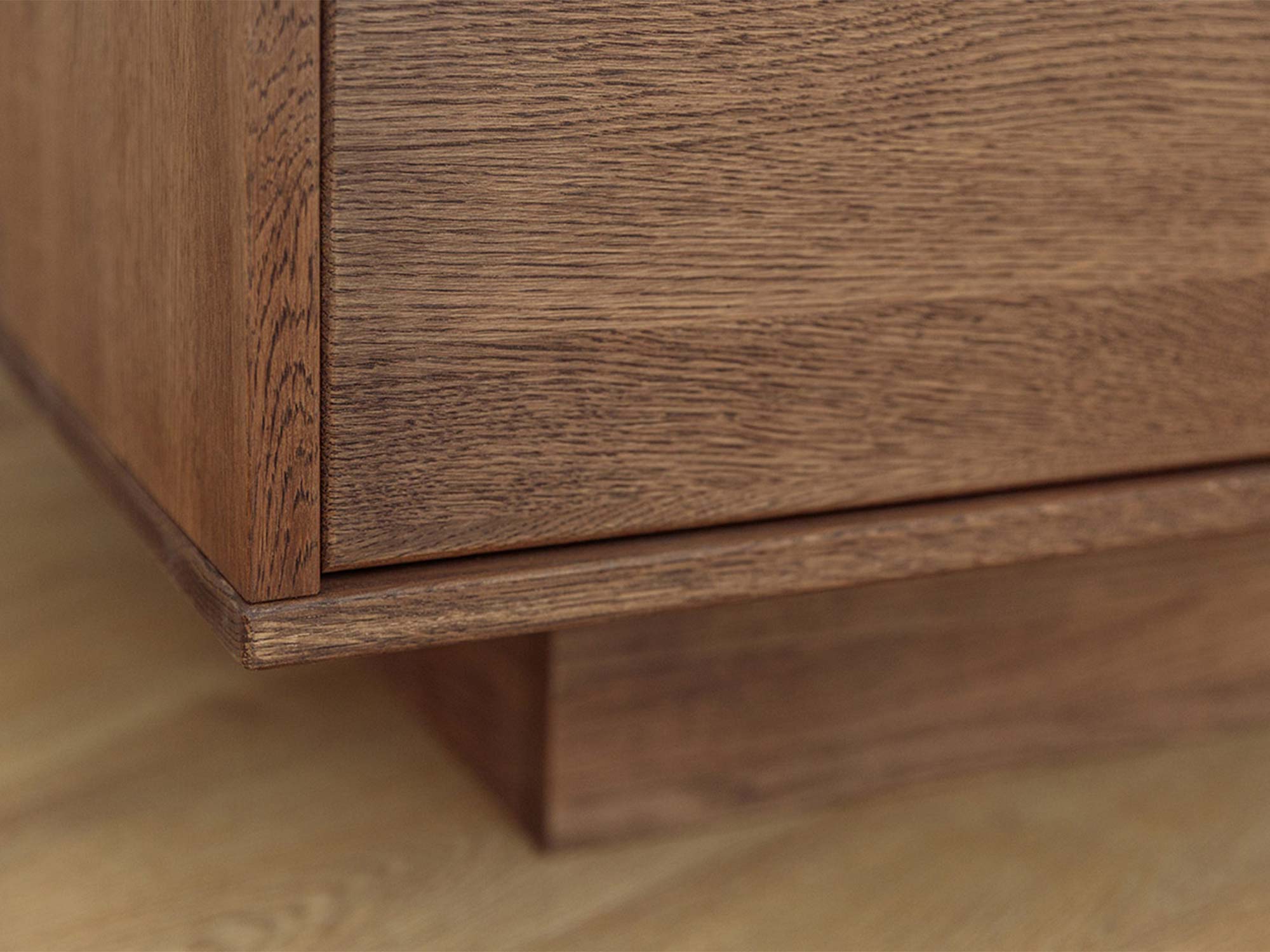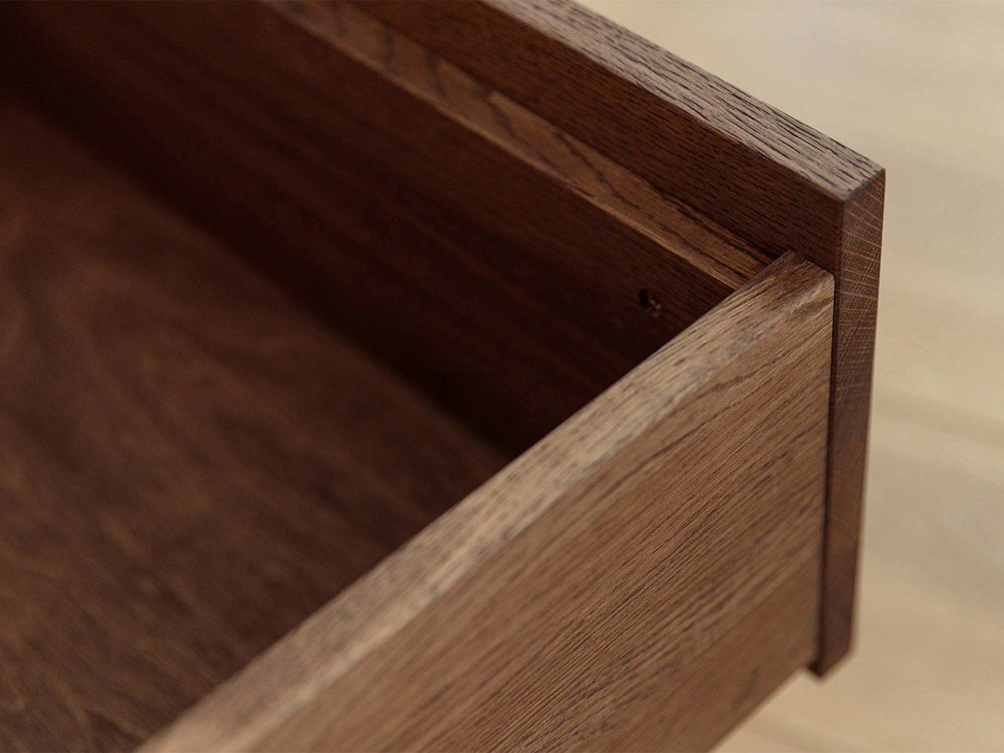 Forma ławy jest świadomie prosta i geometryczna: proporcje blatu, otwartej półki i frontu szuflady tworzą spójną, ponadczasową bryłę.