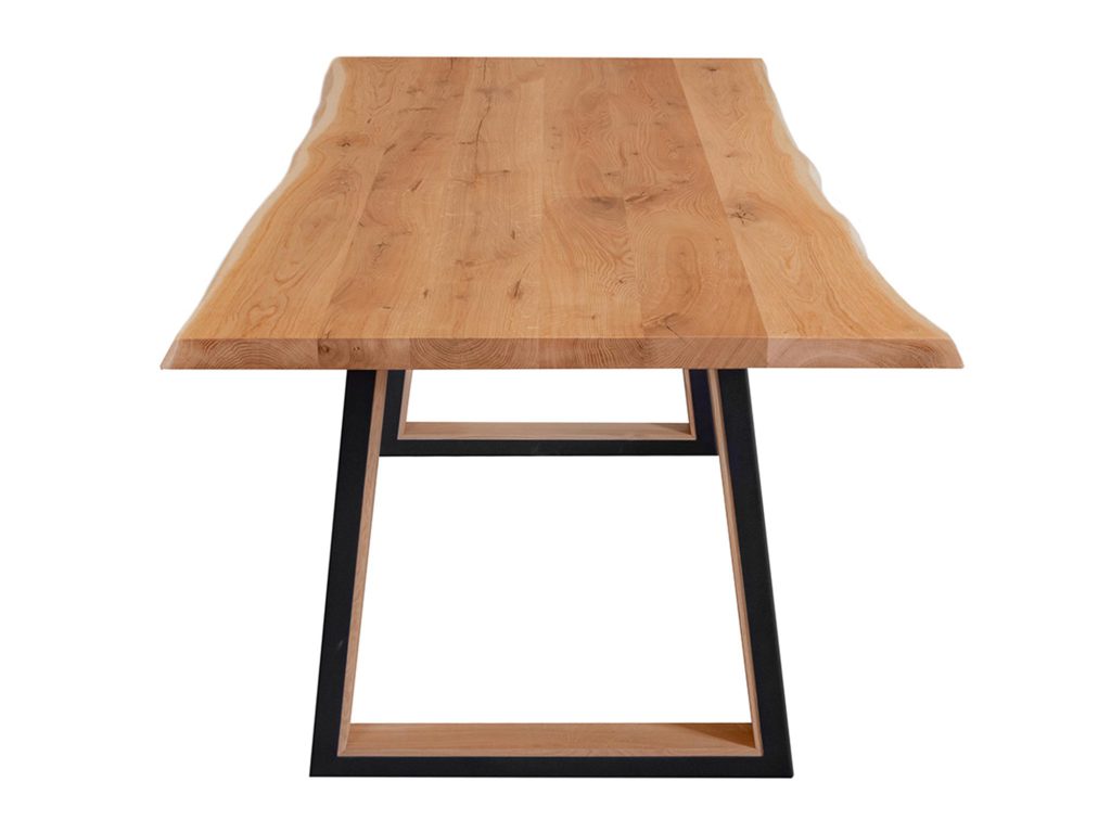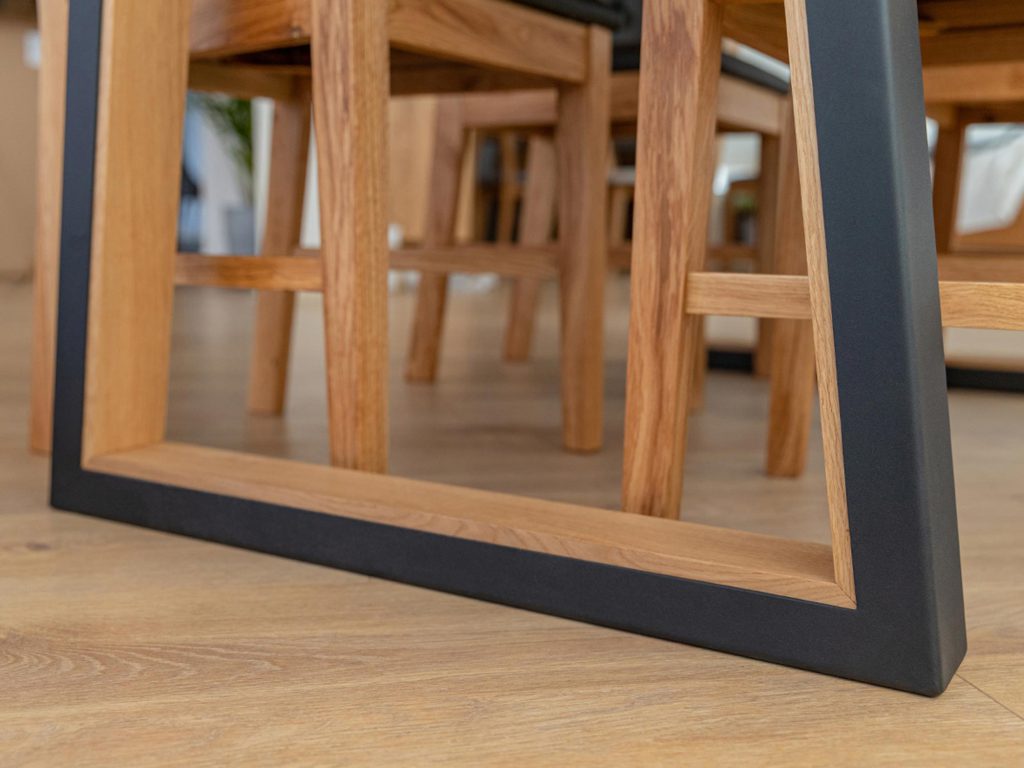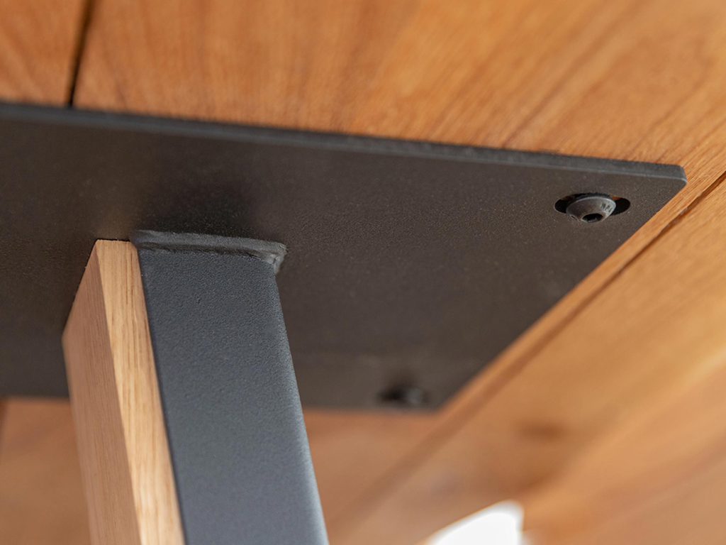 Powierzchnia została zabezpieczona ekologicznym olejem, który wydobywa ciepły ton dębu i wspiera codzienną pielęgnację. Jeśli coś się rozleje – wystarczy szybkie przetarcie miękką ściereczką. Charakter loftu podkreślają czarne nogi z metalu malowanego proszkowo: to trwała, odporna powłoka o eleganckim, matowym wykończeniu. Smukła geometria podstawy nadaje bryle wizualnej lekkości i nie blokuje miejsca na nogi, dzięki czemu krzesła wsuniesz wygodnie zarówno po bokach, jak i na szczytach.