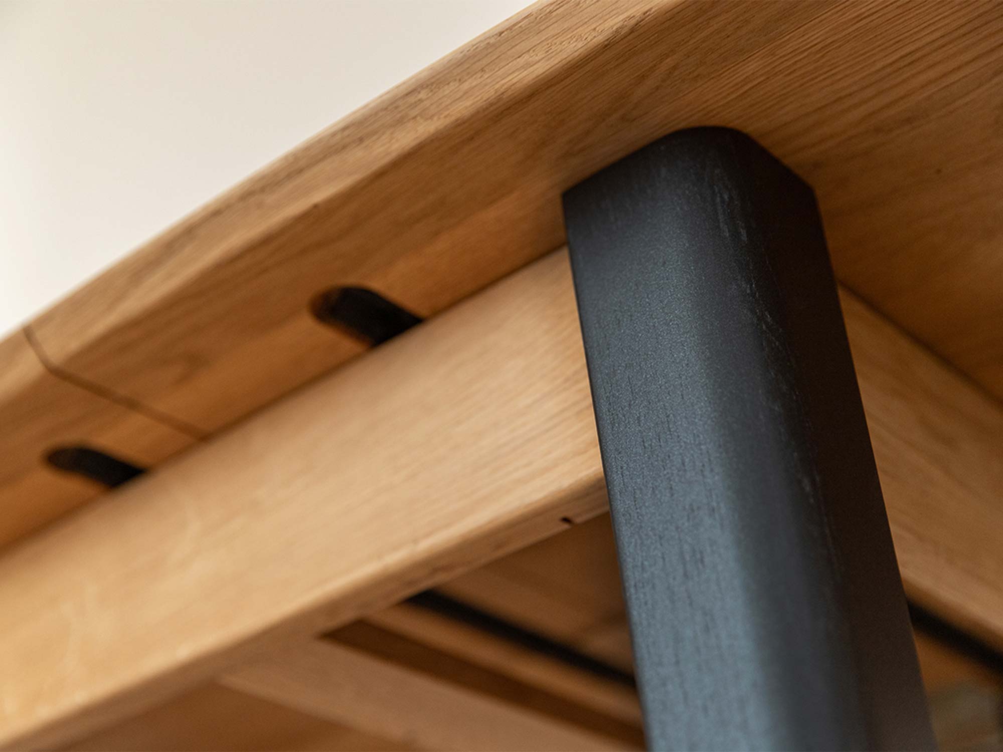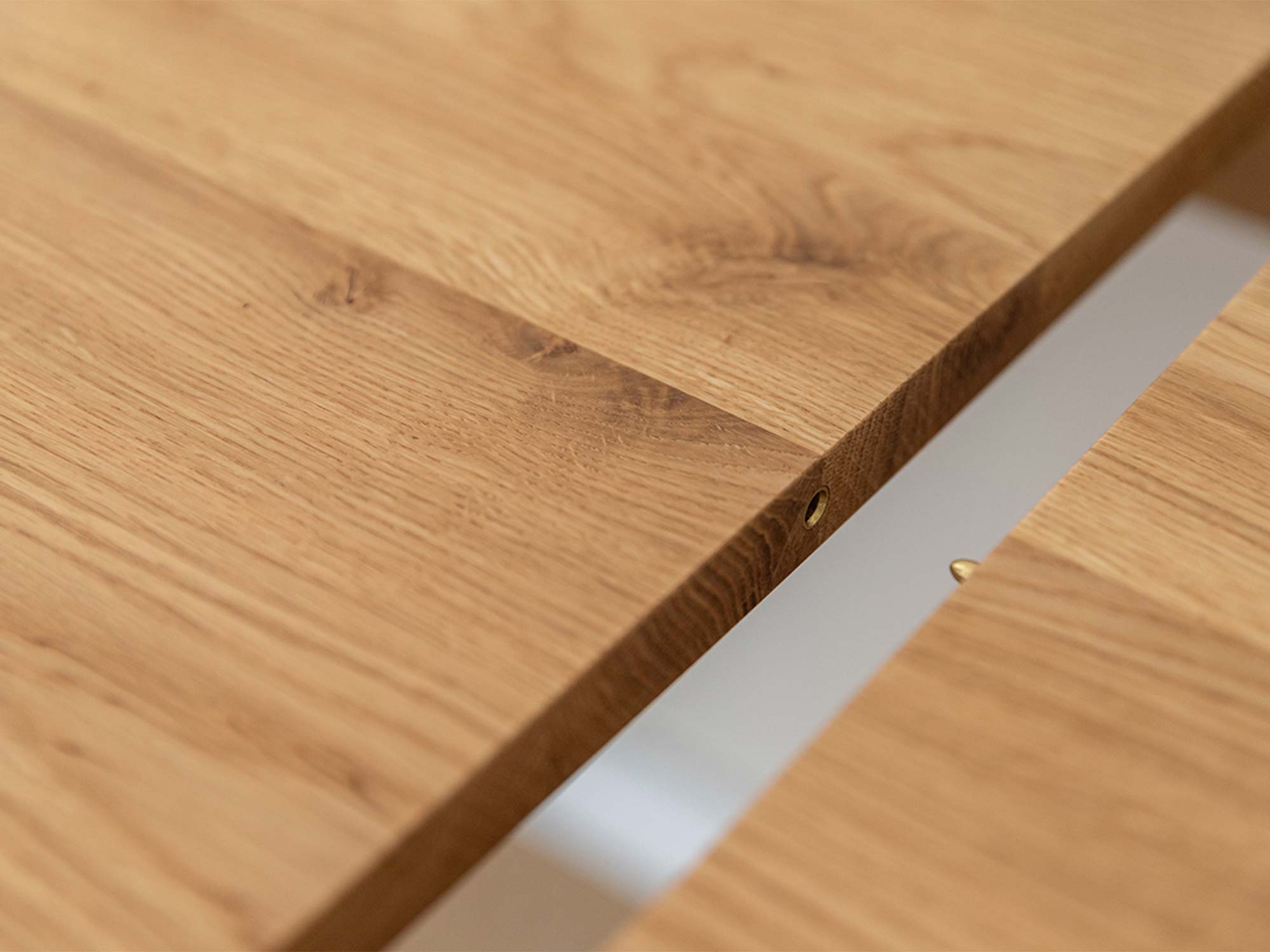 Serce tego projektu to naturalne drewno dębu — materiał o wysokiej gęstości, niezawodny w codziennym użytkowaniu. Olejowane wykończenie wydobywa głębię barwy, eksponuje rysunek słojów i pozostawia przyjemnie gładką powierzchnię. Każdy blat jest unikatem: sęki i niuanse kolorystyczne są jak odcisk palca natury — nie ma dwóch identycznych egzemplarzy.