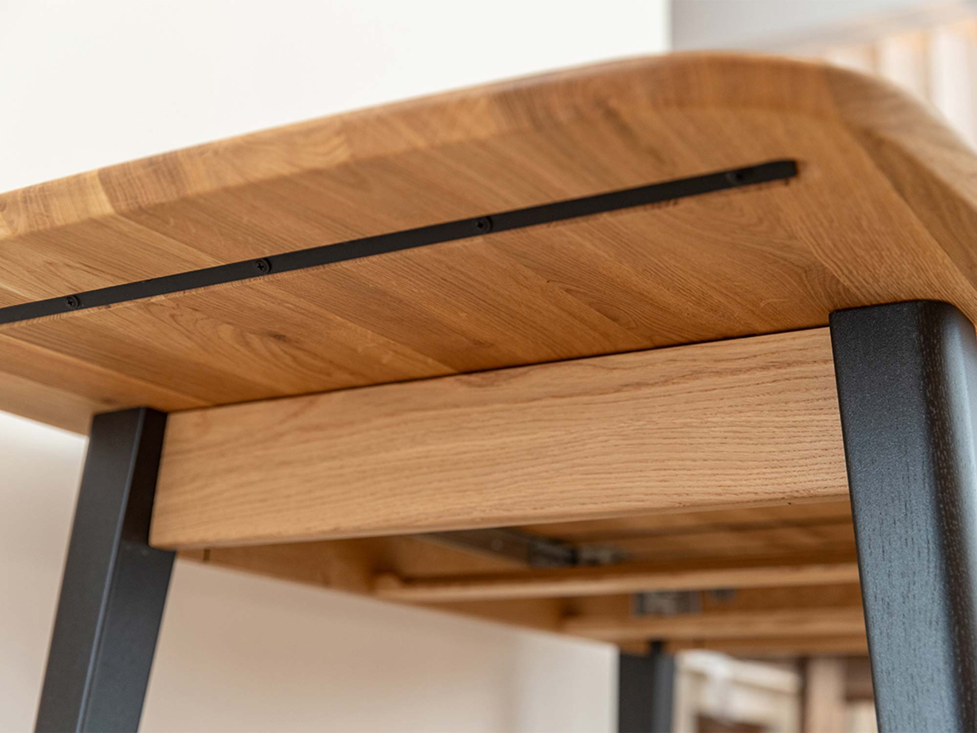 Czarne nogi nadają bryle rytm i wrażenie lekkości. Ich smukły profil podbija nowoczesny charakter stołu, a kontrast z ciepłem dębu jest tak „insta-ready”, że stylizacja z lampą z czarnego metalu czy krzesłami z grafitowym stelażem powstaje jakby sama. To świetny wybór także do mniejszych przestrzeni: stół wygląda lekko, nie przytłacza, a przy tym zachowuje stabilność, której oczekujesz od mebla użytkowego.