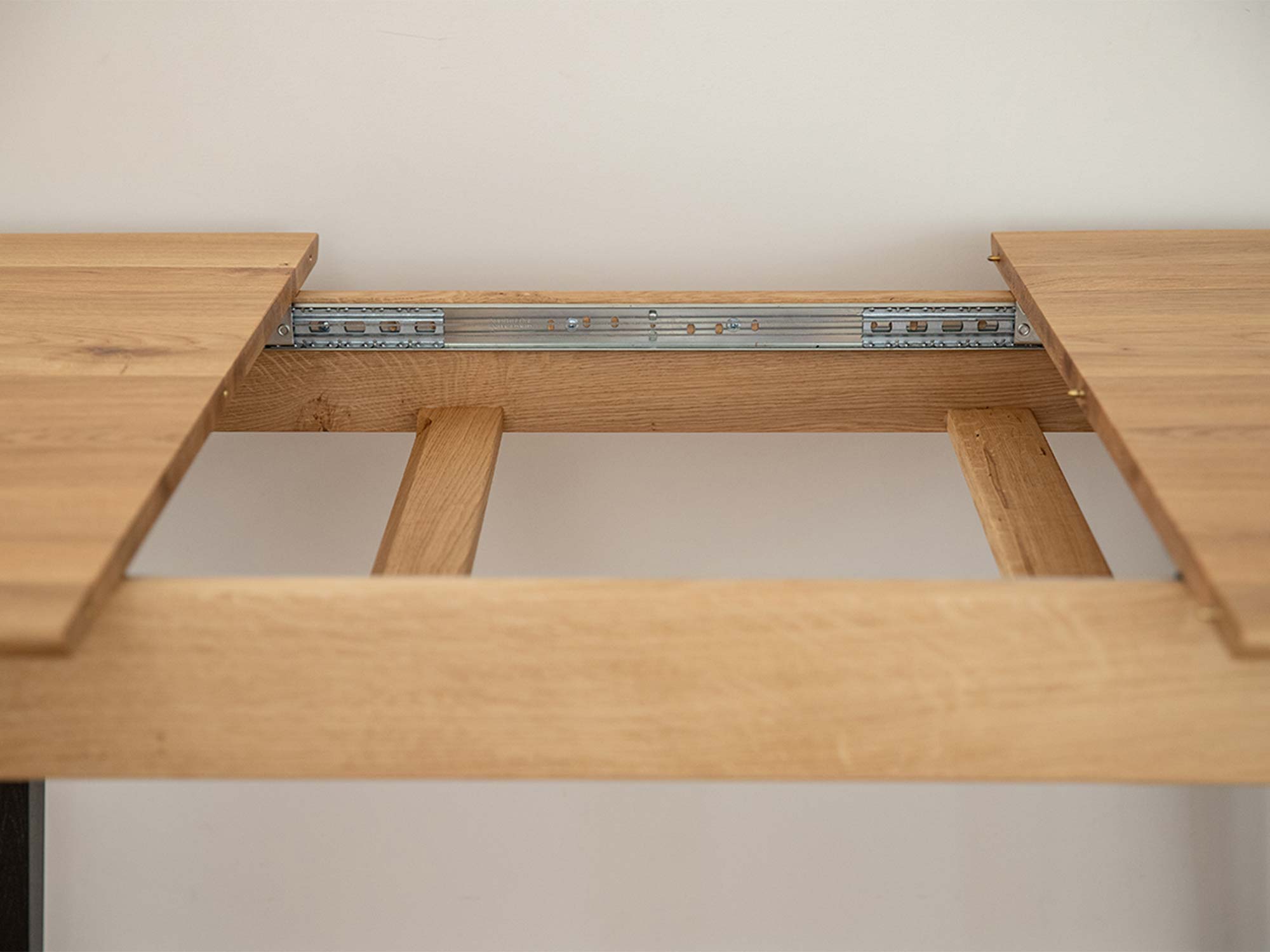 Drewniany stół minimalistyczny 120 cm Basic to przemyślany balans pomiędzy formą a funkcją: naturalny, olejowany dąb, czarne nogi o nowoczesnej linii i rozkładany blat do 165 cm. Niezawodnie służy w codzienności, a gdy zapraszasz bliskich — rośnie razem z Waszym apetytem na wspólny czas. Jeśli szukasz stołu, który wniesie estetykę i spokój do Twojego domu, dodaj go do koszyka i pokaż partnerowi — macie właśnie bazę pod piękne, wspólne chwile.