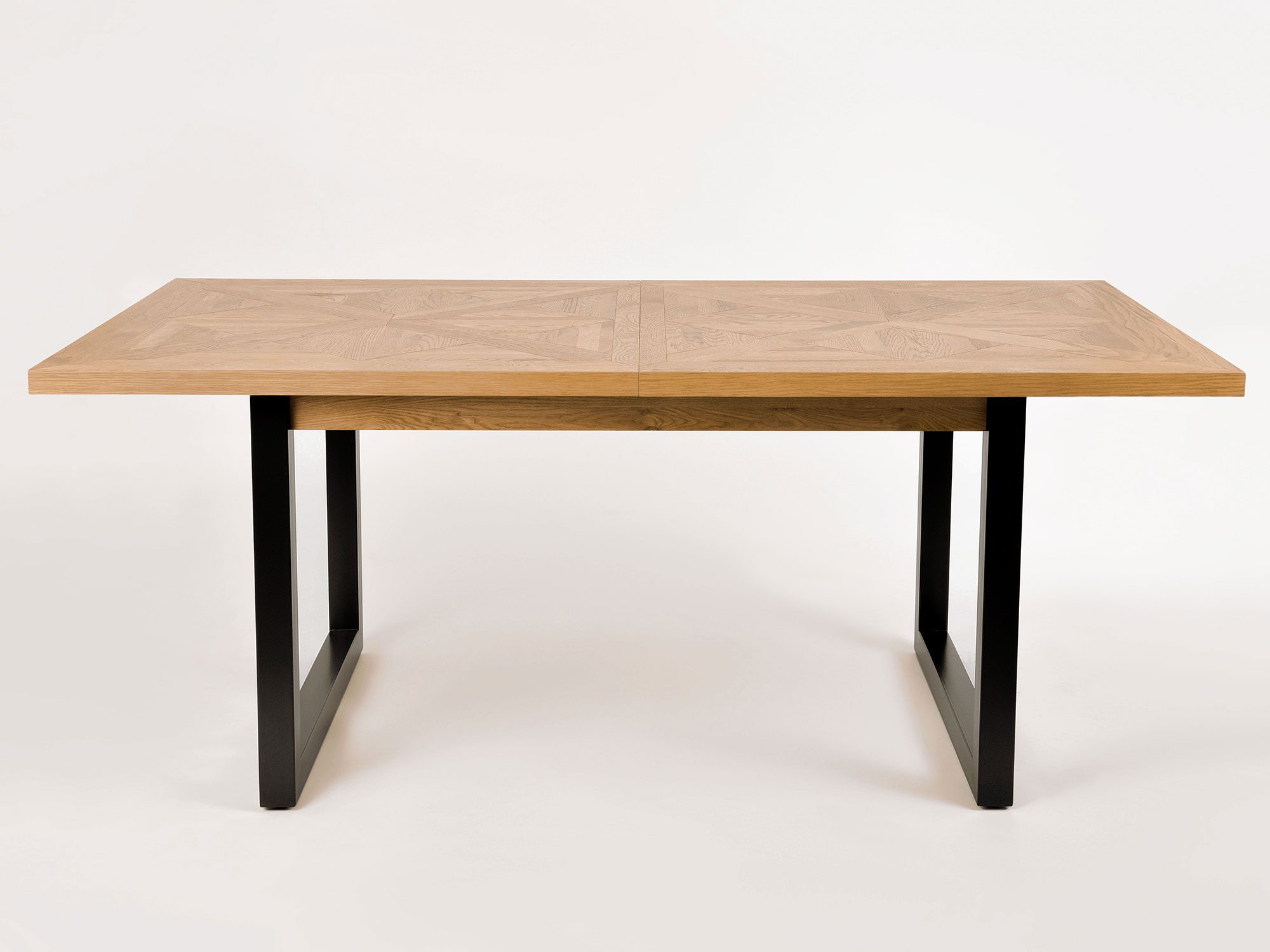 Stół rozkładany Karma to elegancka propozycja dla osób, które cenią nowoczesny, industrialny design. Dzięki stalowym nogom w kształcie litery U w ciemnografitowym kolorze oraz blatowi z litego drewna białego dębu, stół ten będzie doskonałym uzupełnieniem loftowych wnętrz. Blat, ozdobiony intarsją w kształcie X, dodaje mu wyjątkowego charakteru, a dodatkowa nadstawka o szerokości 50 cm zwiększa funkcjonalność mebla. Idealny do przestronnych jadalni czy salonów, gdzie zyska miano centralnego punktu aranżacji.