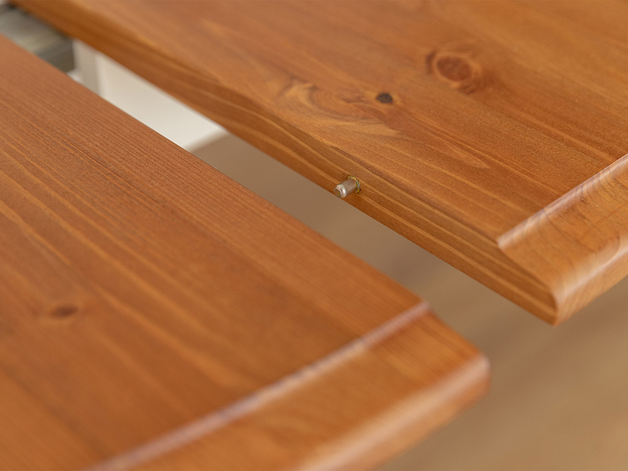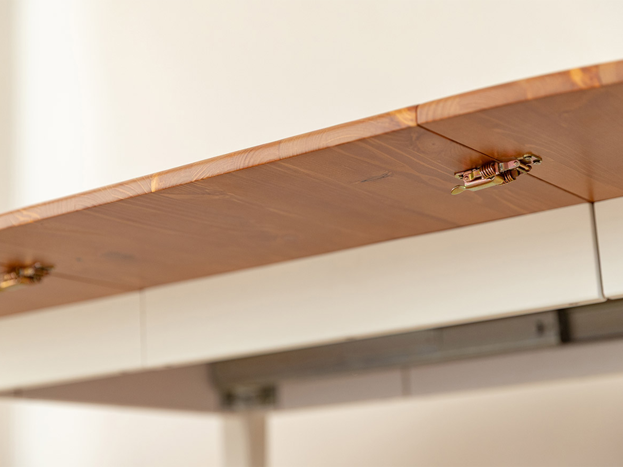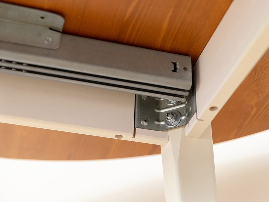 System rozkładania Ingrid to rozwiązanie z najwyższej półki. Mechanizm prowadnic pracuje płynnie i precyzyjnie, dzięki czemu dokładki idealnie pasują do głównej części blatu. Nawet w maksymalnej konfiguracji (210 cm długości) stół pozostaje stabilny i w pełni sztywny – bez efektu ugięcia czy przesunięć. To gwarancja komfortu użytkowania niezależnie od liczby gości.