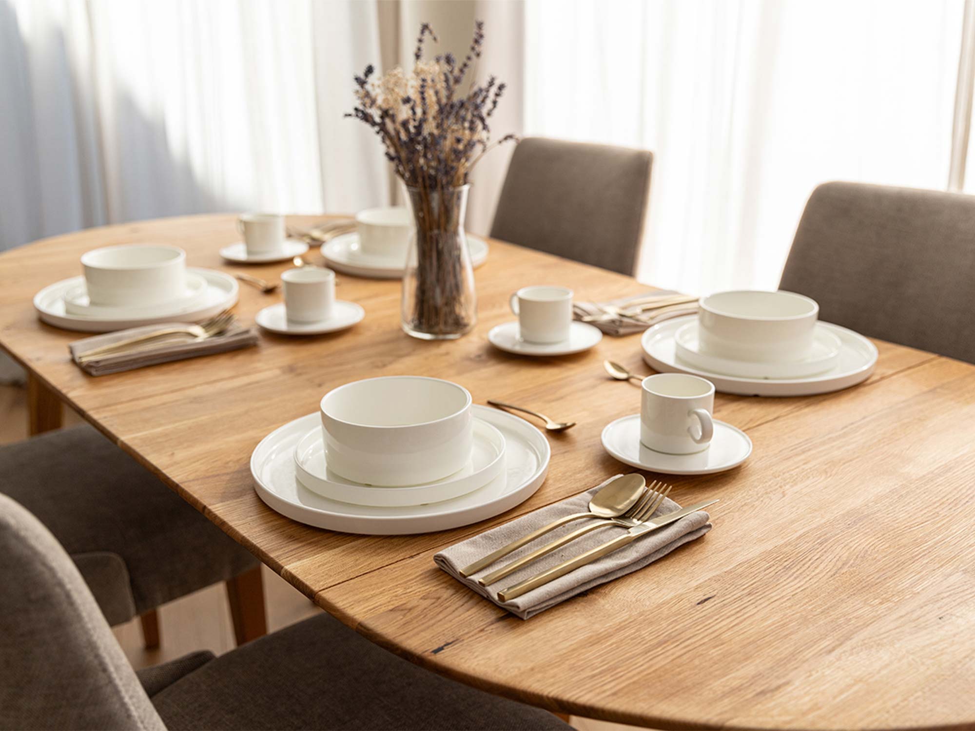 - Uniwersalny styl — od minimalizmu po rustyk; łatwo dobierzesz bieżnik, krzesła i oświetlenie.