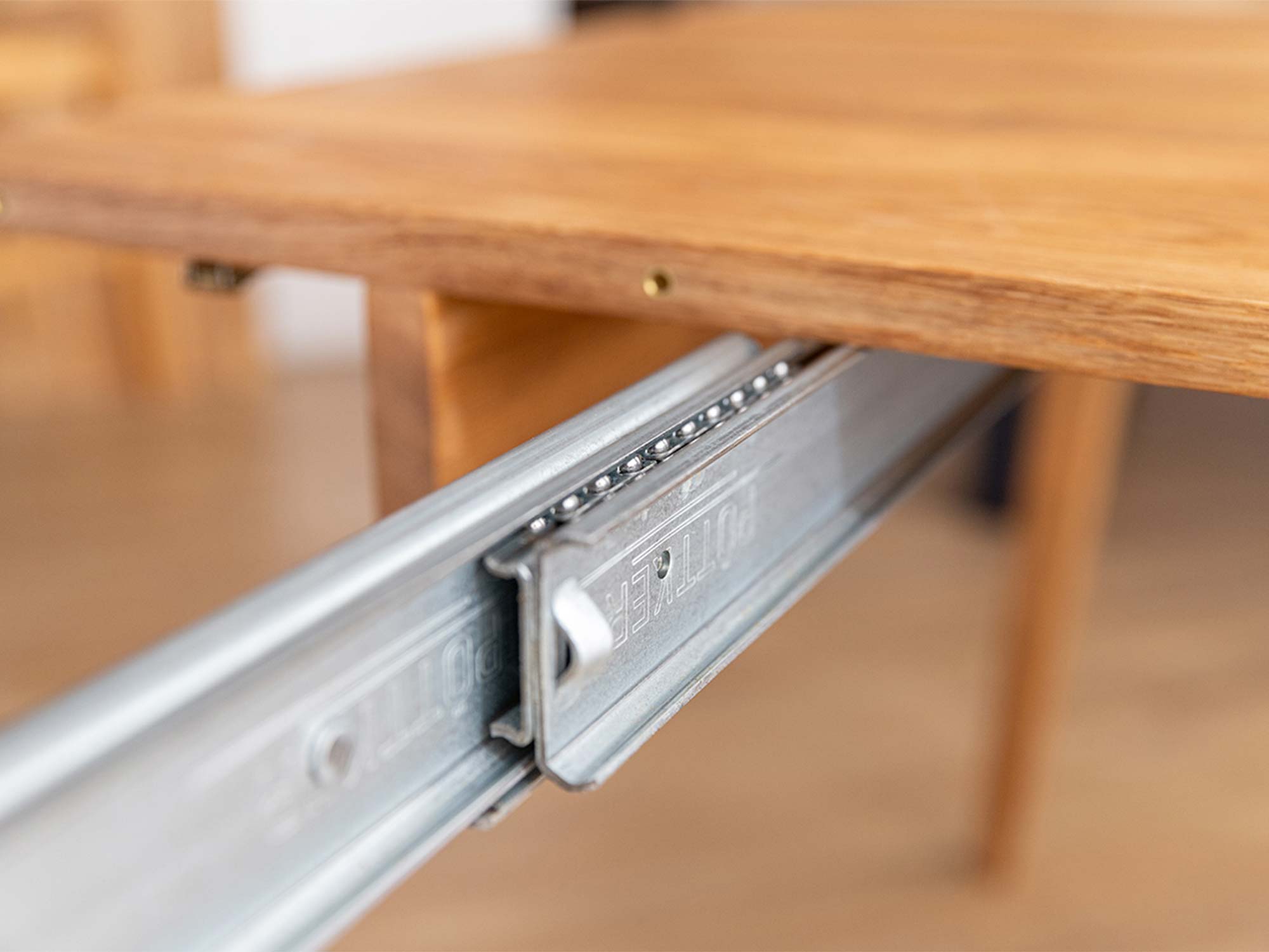 Klucz tego modelu? Płynny i intuicyjny mechanizm rozkładania. Współpracujące prowadnice pozwalają rozszerzyć blat bez szarpania i zbędnej siły. Aby zapewnić długotrwałą, bezproblemową pracę mechanizmu, w konstrukcji uwzględniono dylatację oskrzyni ≈ 5 mm — to subtelna, ale istotna rezerwa na naturalną „pracę” drewna i zmianę warunków otoczenia. Efekt? Stabilność, cisza i pewność przy każdej transformacji.