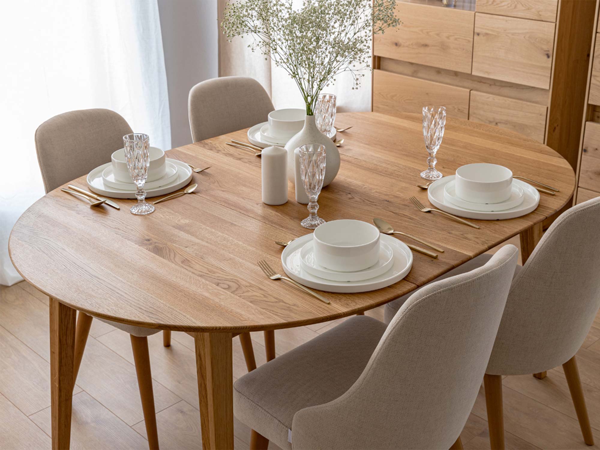 Trzonem tego modelu jest naturalne drewno dębu — szlachetne, trwałe i pięknie starzejące się. Każda deska ma swój unikalny rysunek słojów i subtelne sęki, które podkreśla olejowane wykończenie. Olej, zamiast zamykać drewno pod szklistą warstwą, eksponuje jego dotykowy charakter: aksamitny w dotyku blat zachowuje przy tym odporność na codzienne użytkowanie. Z biegiem lat drewno nabiera patyny, a Ty lubisz je jeszcze bardziej — jak ulubioną, dobrze skrojoną sukienkę, do której zawsze wracasz.