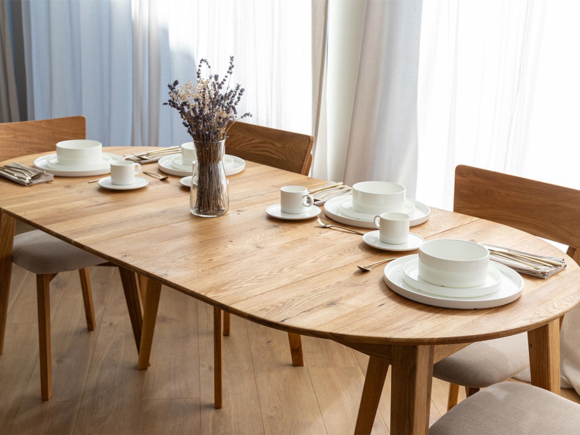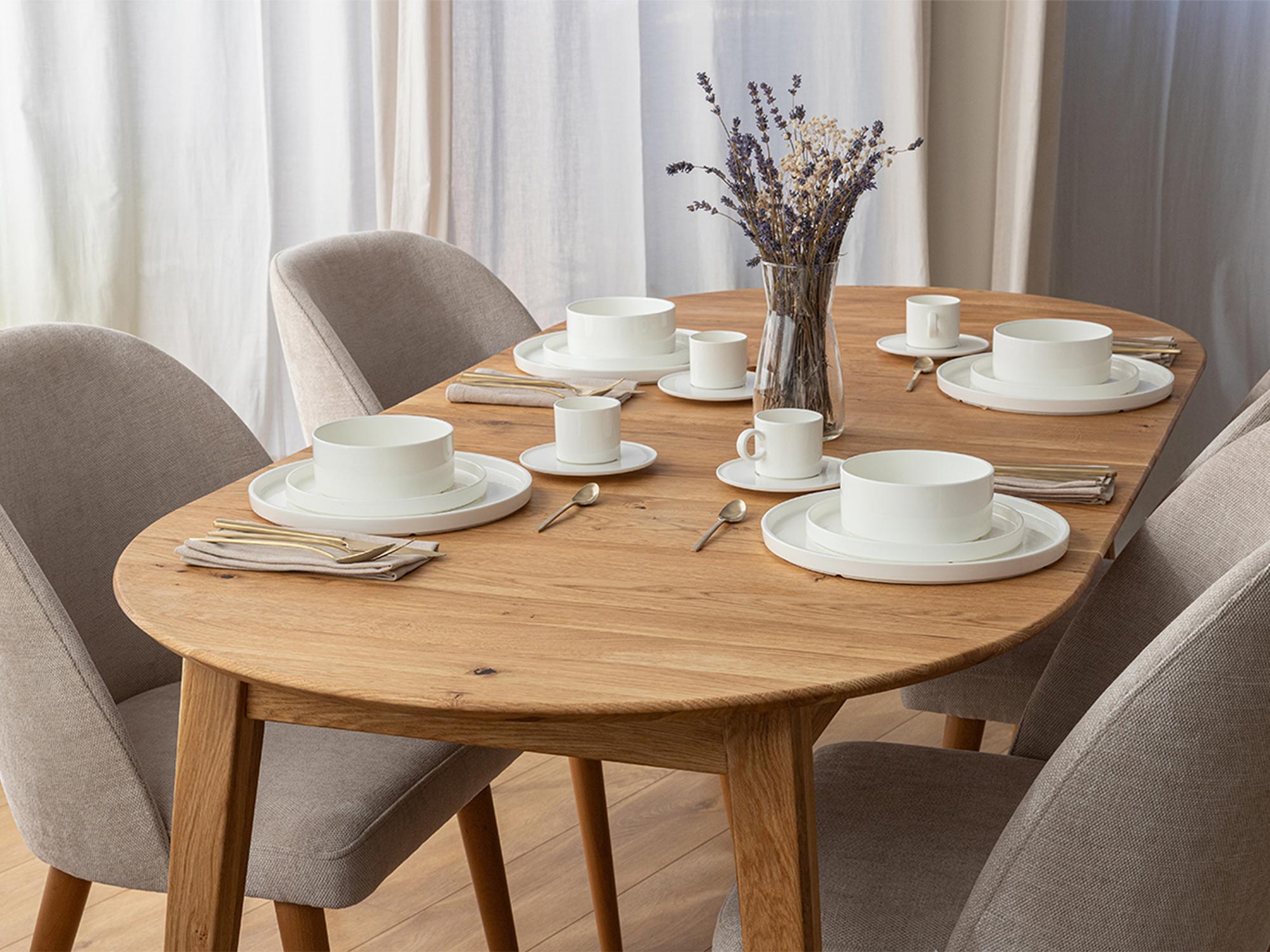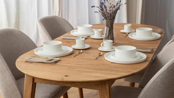 Stół Oakwood charakteryzuje się prostą i elegancką formą, która sprawia, że jest idealnym dopełnieniem każdego wnętrza. Jego okrągły blat o średnicy 90 cm można łatwo rozsunąć do 190 cm, co zapewnia komfort użytkowania, umożliwiając swobodne rozmieszczenie krzeseł wokół stołu. Dzięki temu stół ten jest idealnym rozwiązaniem do codziennych posiłków, a także spotkań z rodziną i przyjaciółmi.
