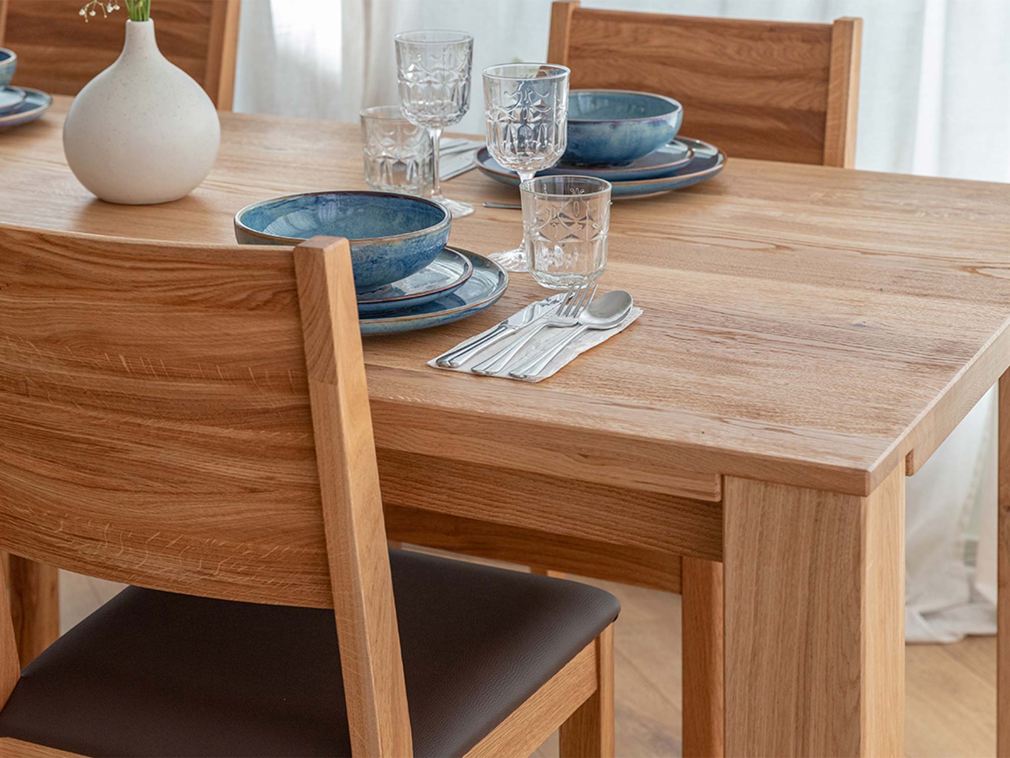 Naturalny dąb, zabezpieczony olejem i woskiem, zapewnia długowieczność, a proporcje blatu 140 × 90 cm dają komfort na co dzień.
