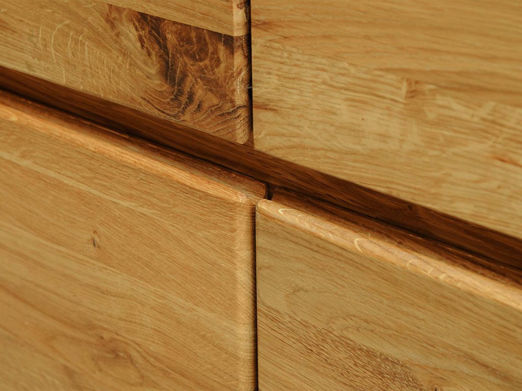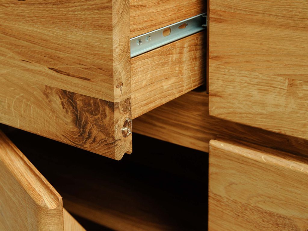 Serce tej szafki to lity dąb – szlachetny materiał, który słynie z twardości, stabilności i ponadczasowego wyglądu. Ochronna powłoka olejowa wydobywa naturalne słoje i jednocześnie ułatwia pielęgnację. Fronty i korpus są proste, bez zbędnych zdobień, dzięki czemu Bagan pasuje do wnętrz skandynawskich, japandi, nowoczesnych, a nawet rustykalnych.