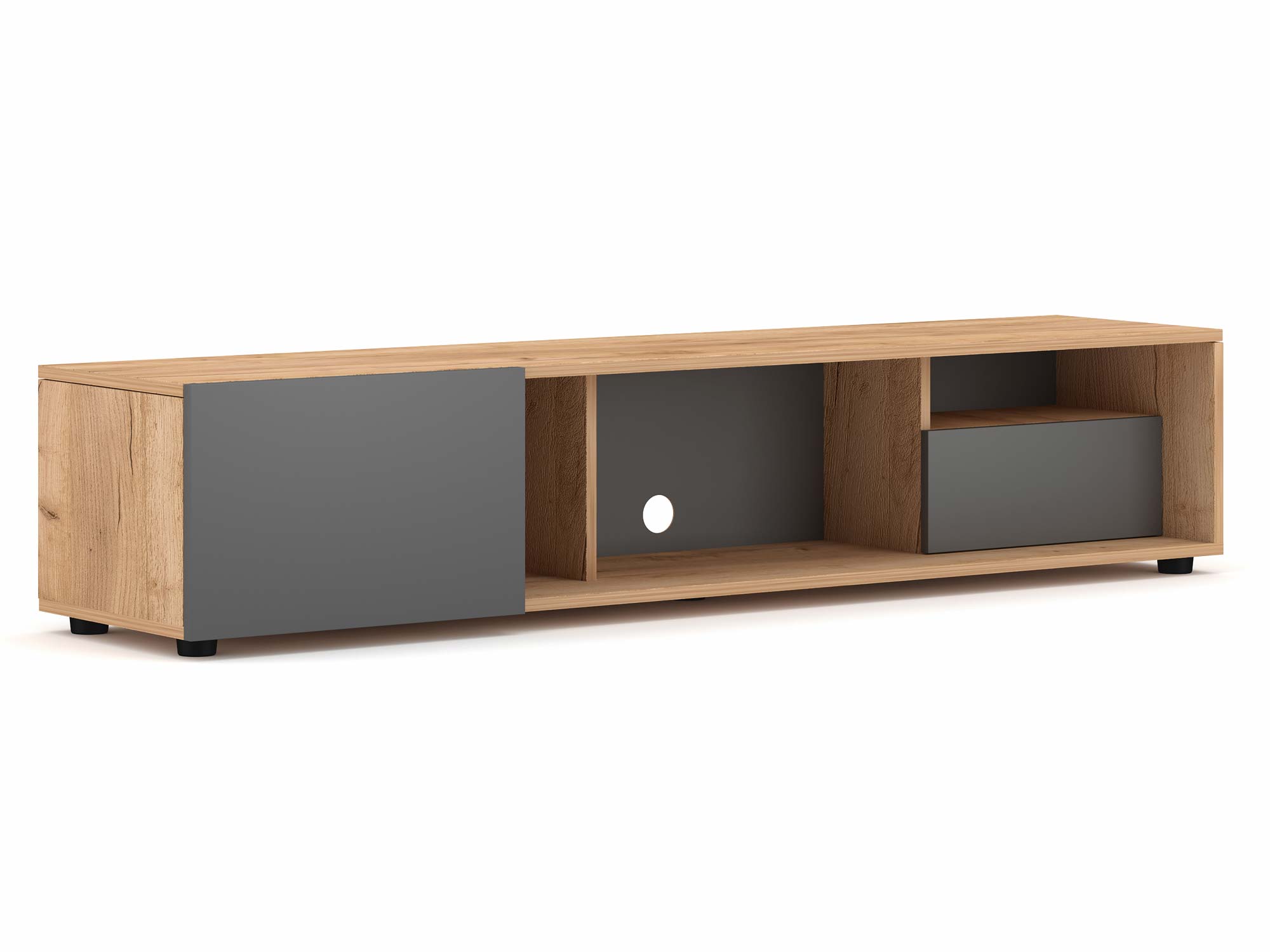 Otwarta wnęka, zamykana szafka oraz boczne przegródki to odpowiedź na potrzeby nowoczesnych domowników. Piloty, kable, konsole, pamiątki – wszystko znajdzie tu swoje miejsce, a jednocześnie pozostanie w zasięgu ręki. Dzięki wysokiej jakości laminowanej płycie 16 mm i obrzeżom zabezpieczonym ABS-em, DARLA nie tylko pięknie wygląda, ale też świetnie znosi codzienne użytkowanie.