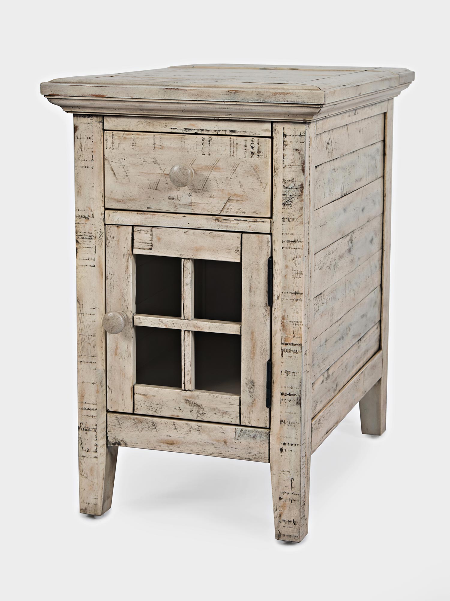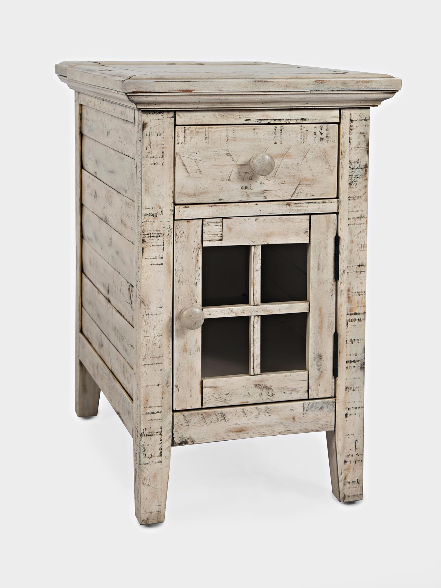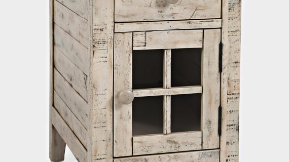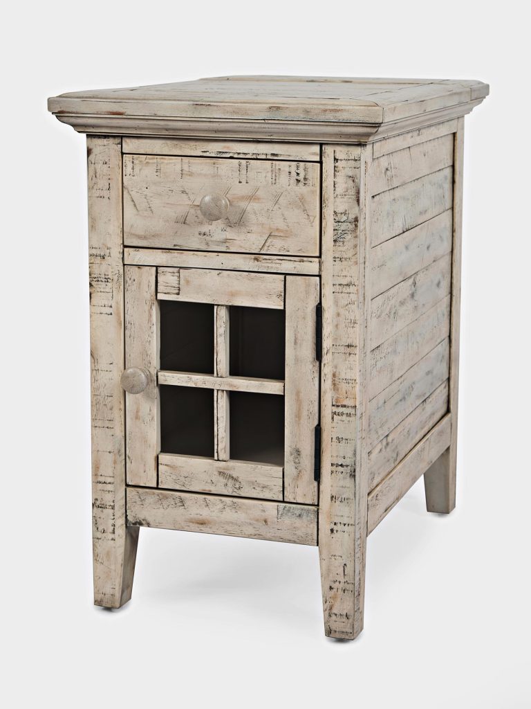 Mała szafka nocna w bielonym wykończeniu z pojedynczą szufladą