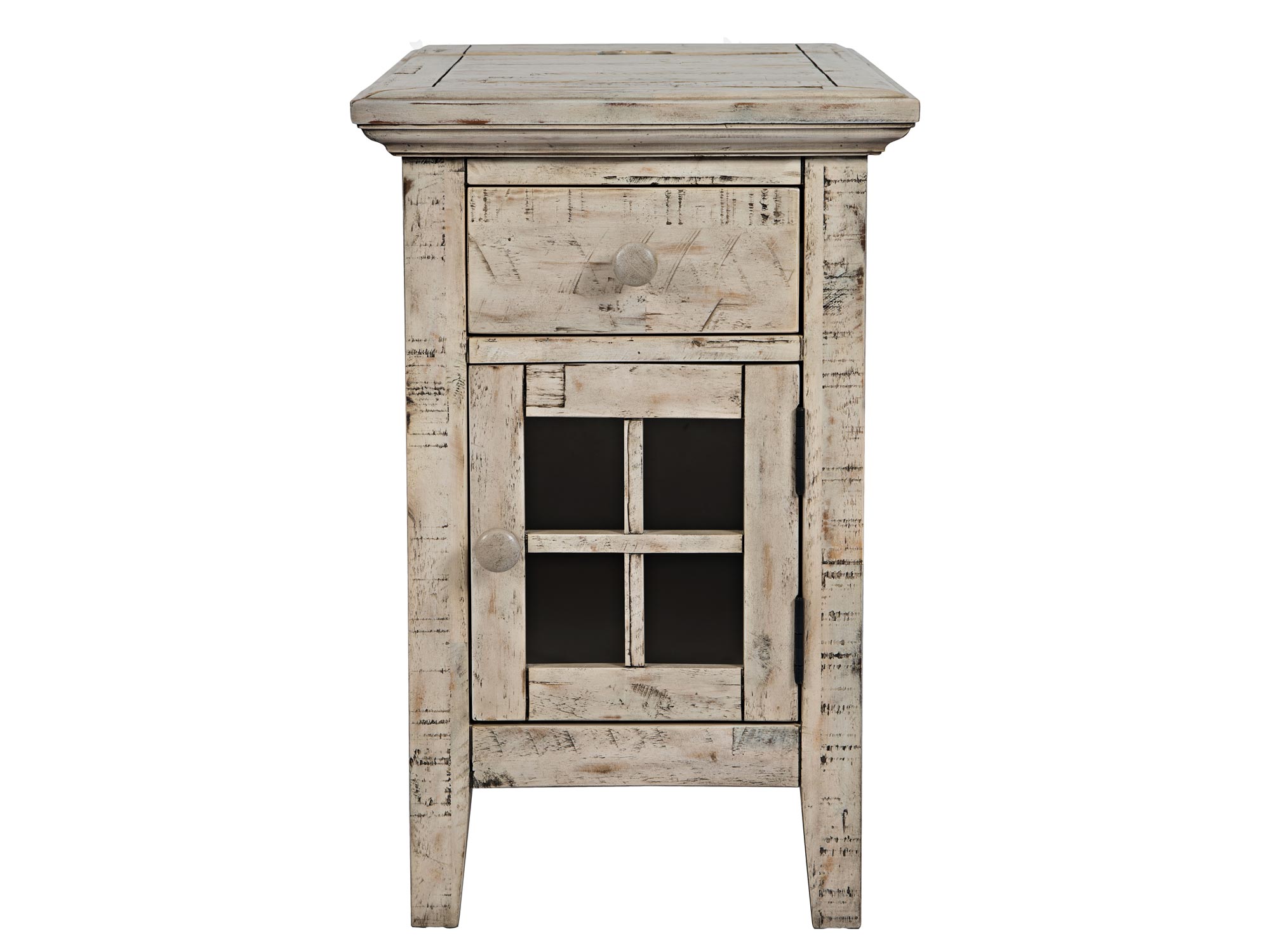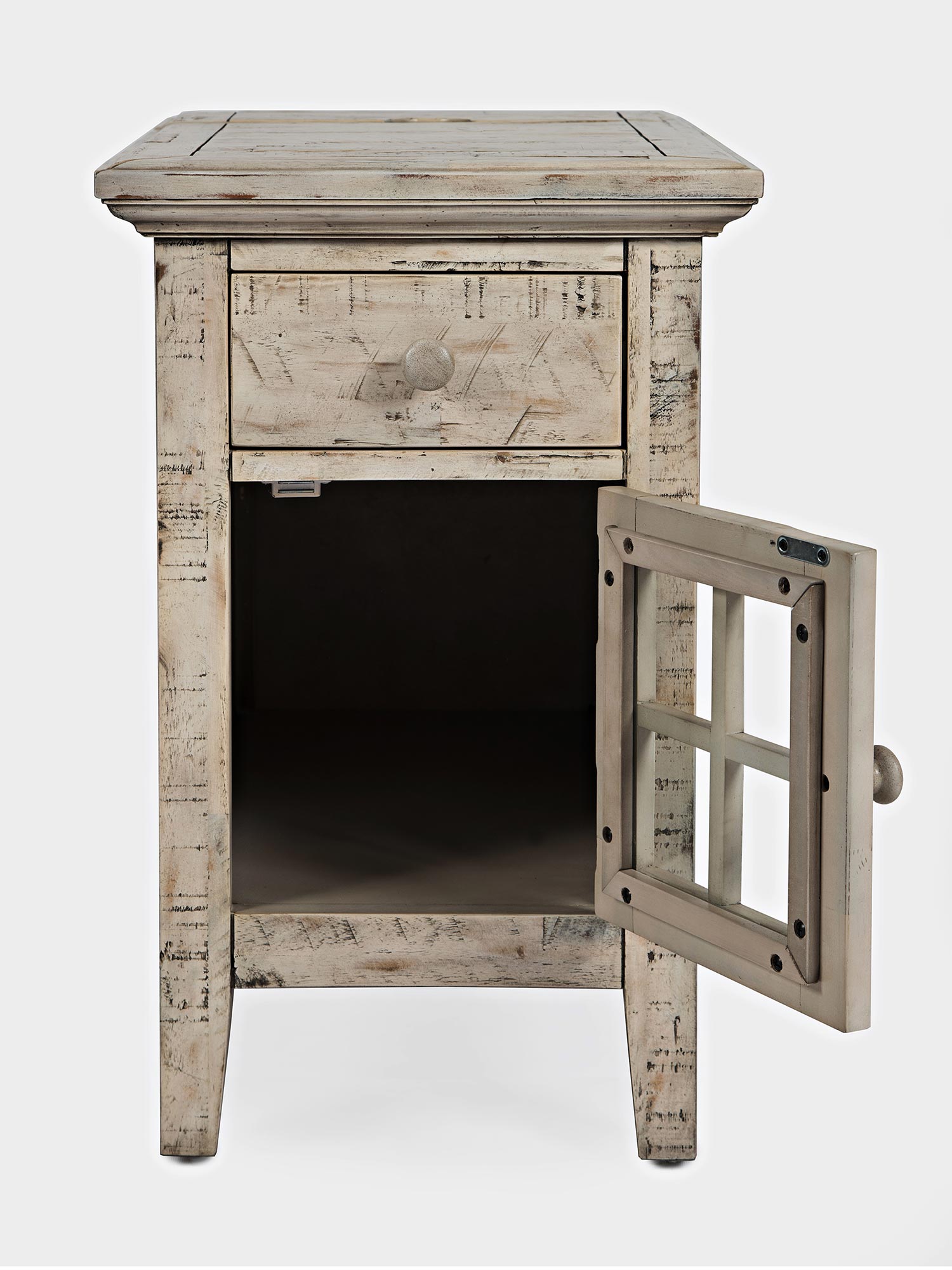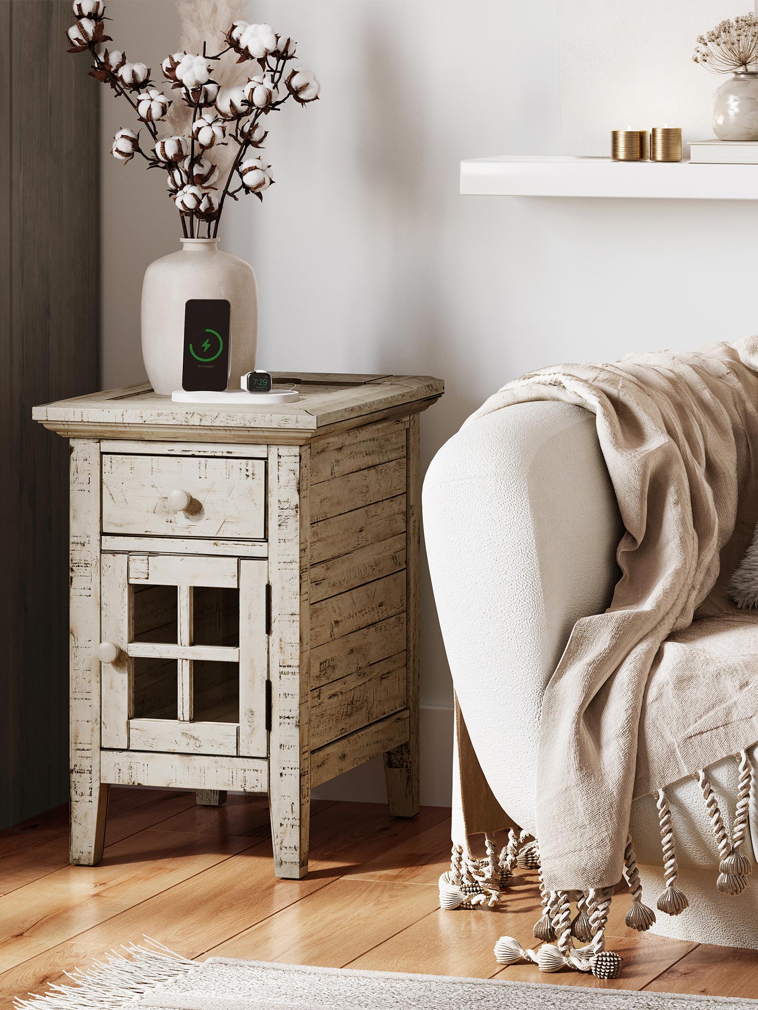 Mała szafka nocna w bielonym wykończeniu z pojedynczą szufladą