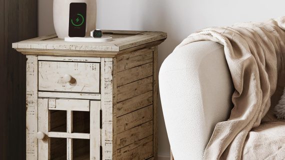 Stylowa i funkcjonalna szafka nocna w kolorze kości słoniowej, która idealnie wkomponuje się w każde rustykalne wnętrze. Wykonana z wysokiej jakości drewna akacji, z charakterystycznymi przetarciami w stylu shabby chic. Dzięki wbudowanemu gniazdu USB, szafka staje się nie tylko elegancka, ale i niezwykle praktyczna – doskonała do sypialni, gdzie funkcjonalność idzie w parze z estetyką. Idealny wybór dla osób, które szukają mebla łączącego klasyczny wygląd z nowoczesnymi rozwiązaniami.
