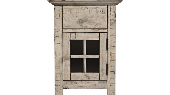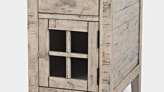 Szafka nocna otwierana z przeszklonym frontem w bielonym wykończeniu