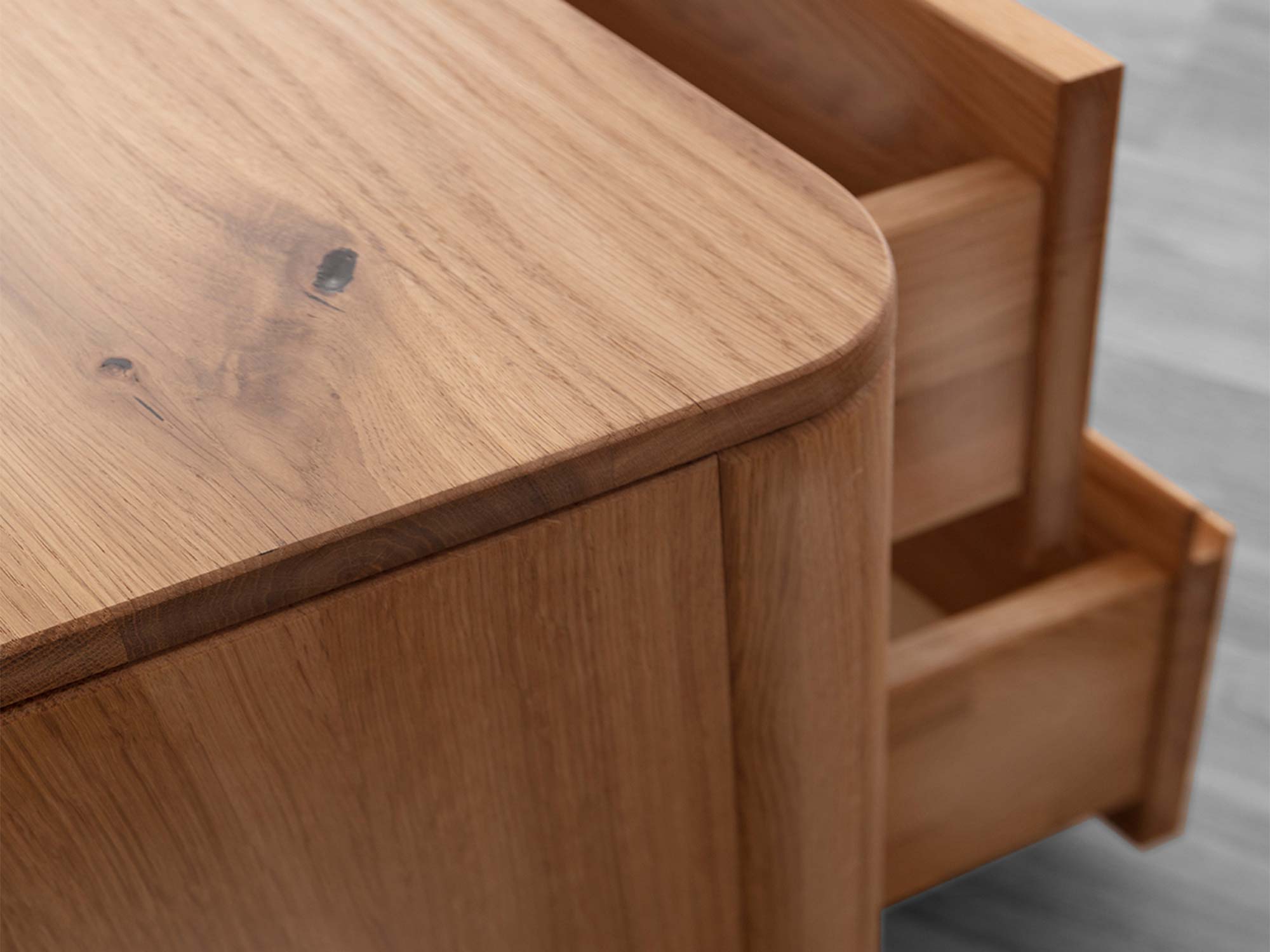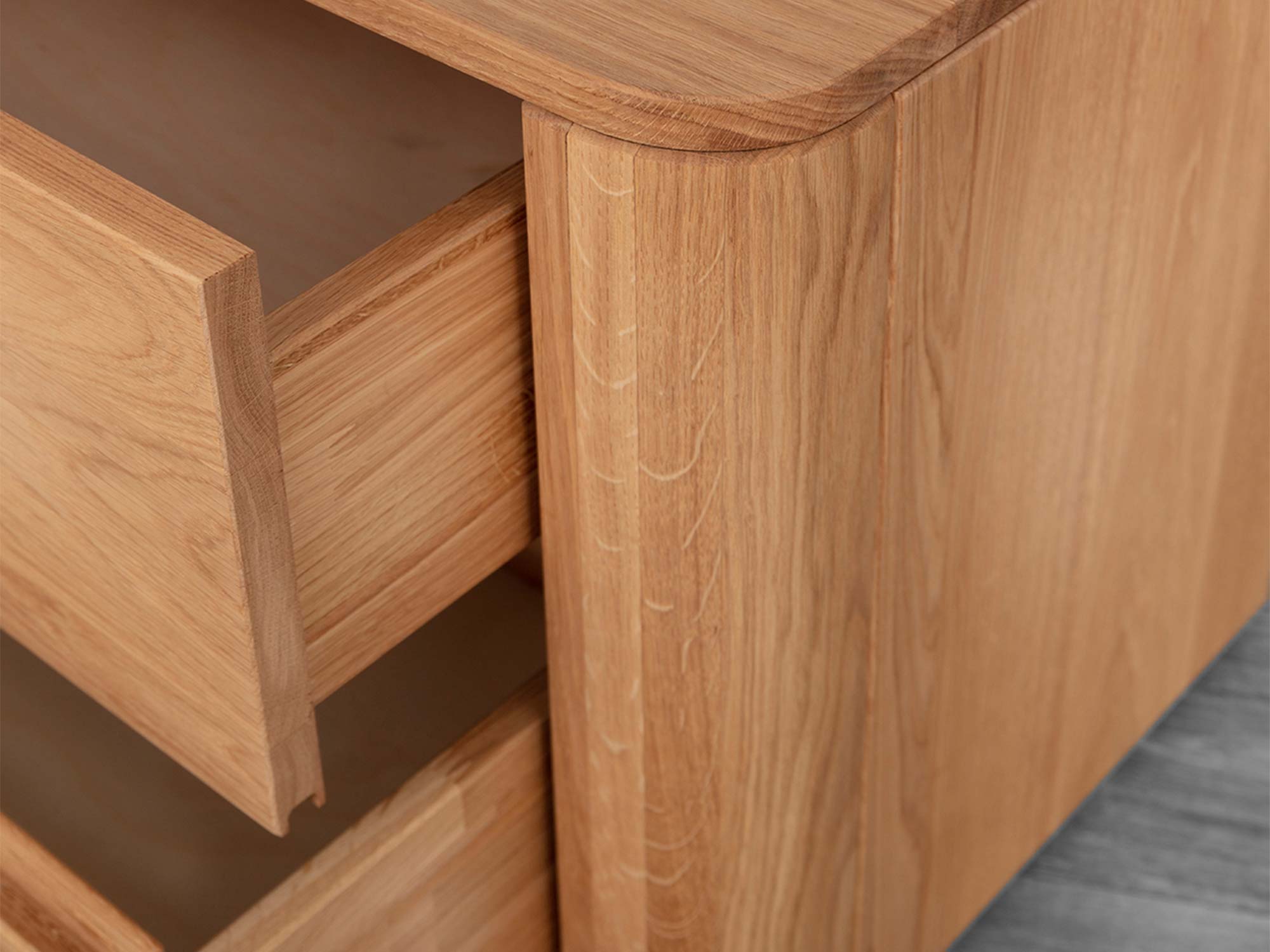 Cisza, którą słychać… gdy jej nie słychać. Obie szuflady pracują na renomowanych prowadnicach Softclose Häfele. Domykają się płynnie i bezgłośnie — docenisz to zwłaszcza nocą, gdy druga osoba śpi, a Ty sięgasz po książkę, ładowarkę czy balsam do rąk.