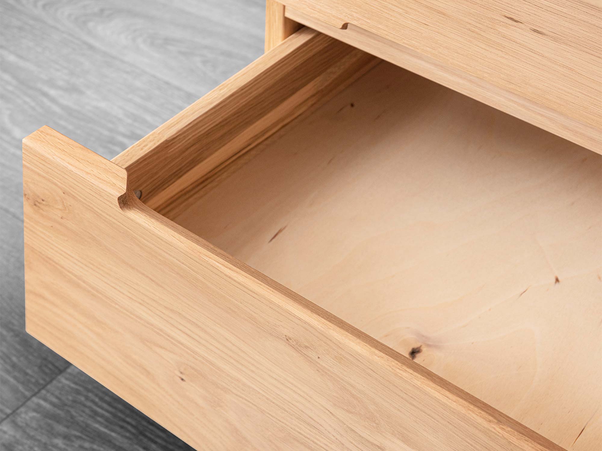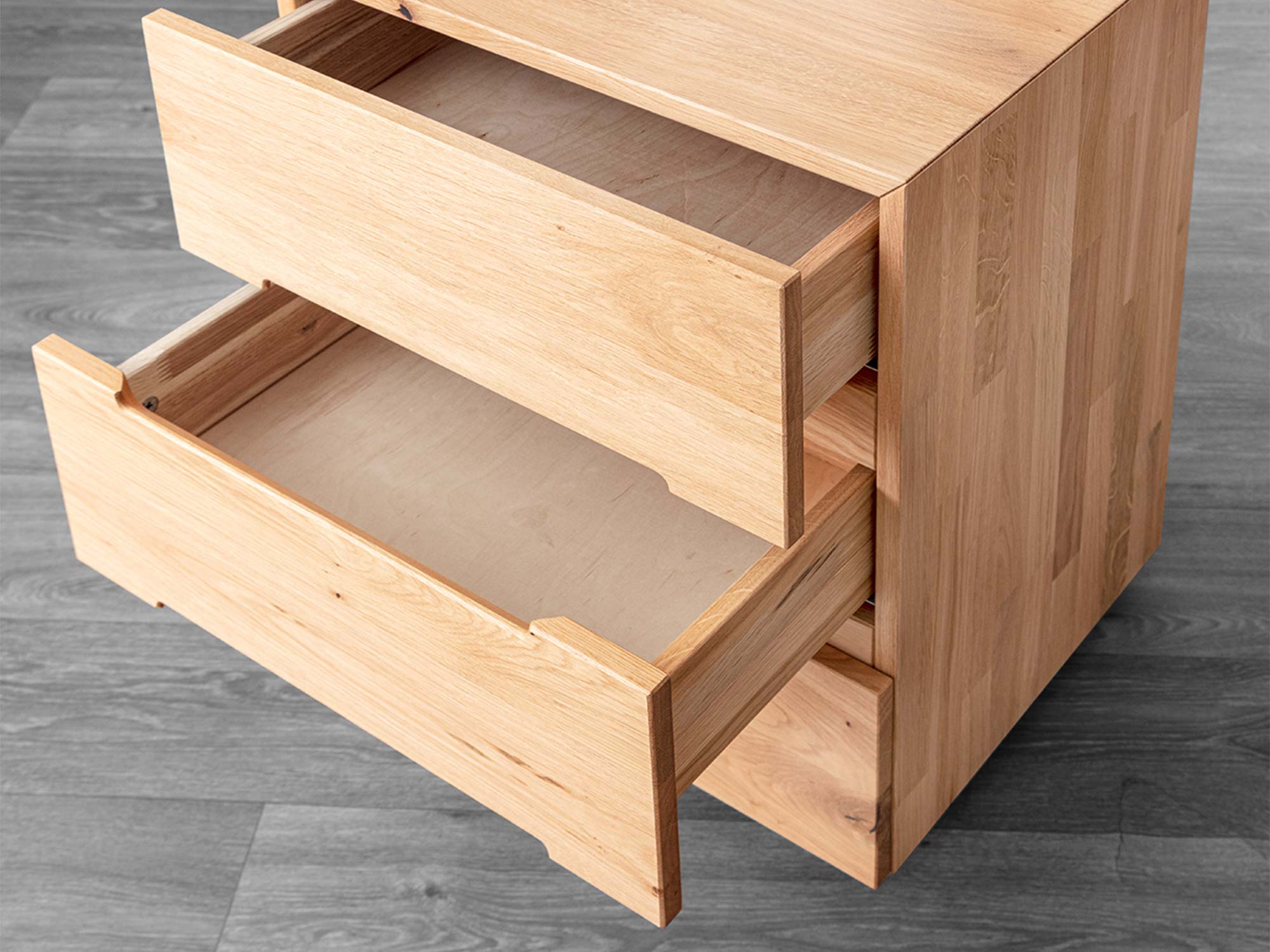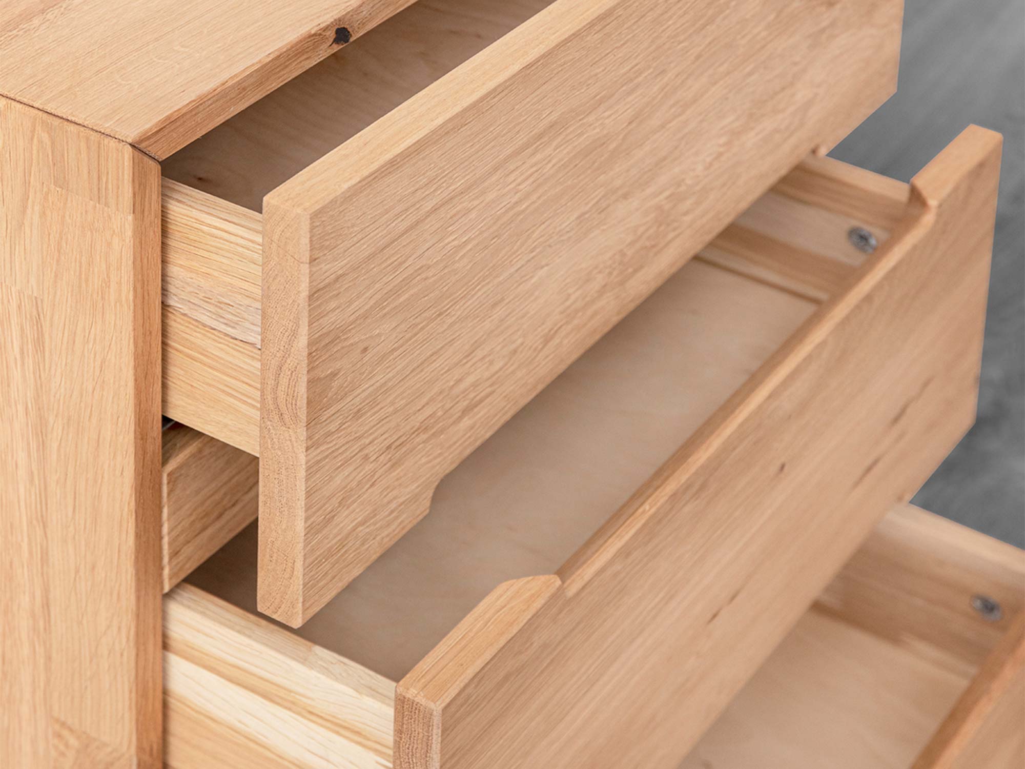 Komfort w ciszy. Każda z trzech szuflad pracuje na prowadnicach Softclose Häfele – domykają się płynnie i bezszelestnie. To ważne szczególnie nocą: porządek bez hałasu, wygoda bez kompromisów. Zmieszczą się tu książki, okulary, kosmetyki do pielęgnacji, ładowarka, a nawet notatnik – wszystko, czego potrzebujesz, by zakończyć dzień spokojem.